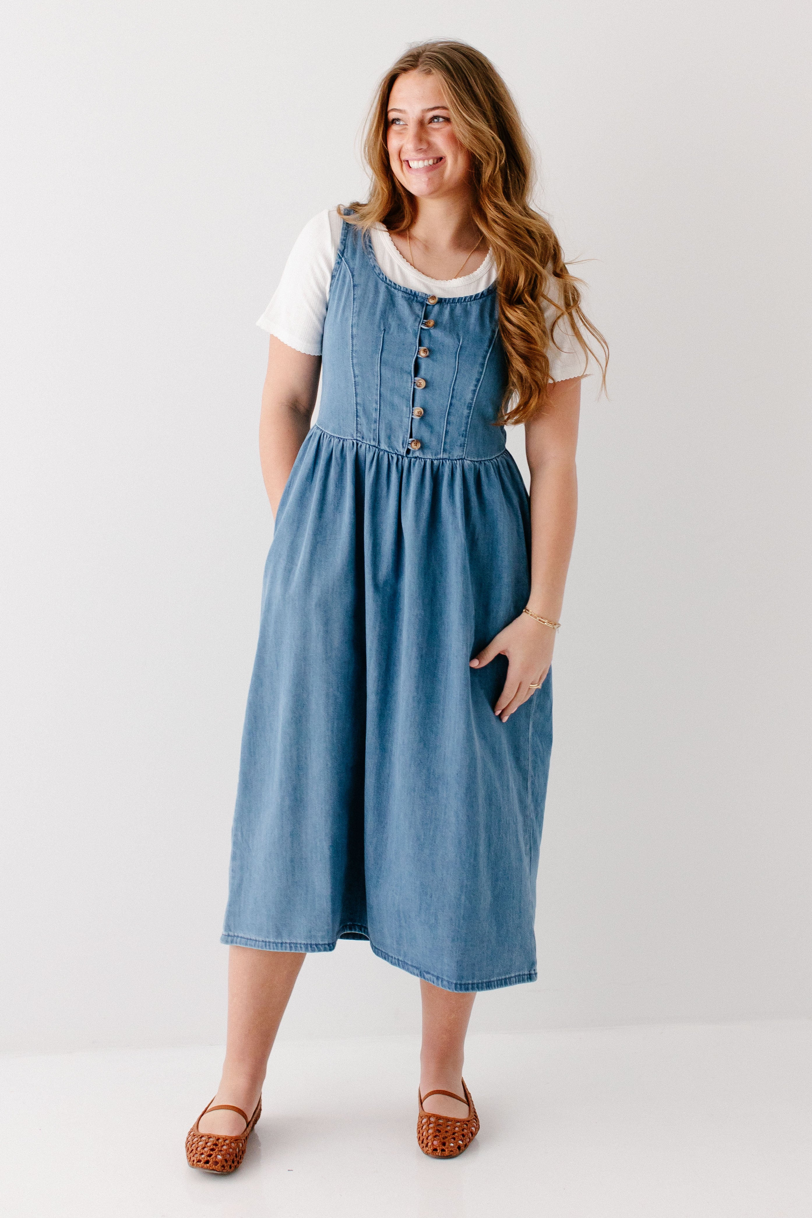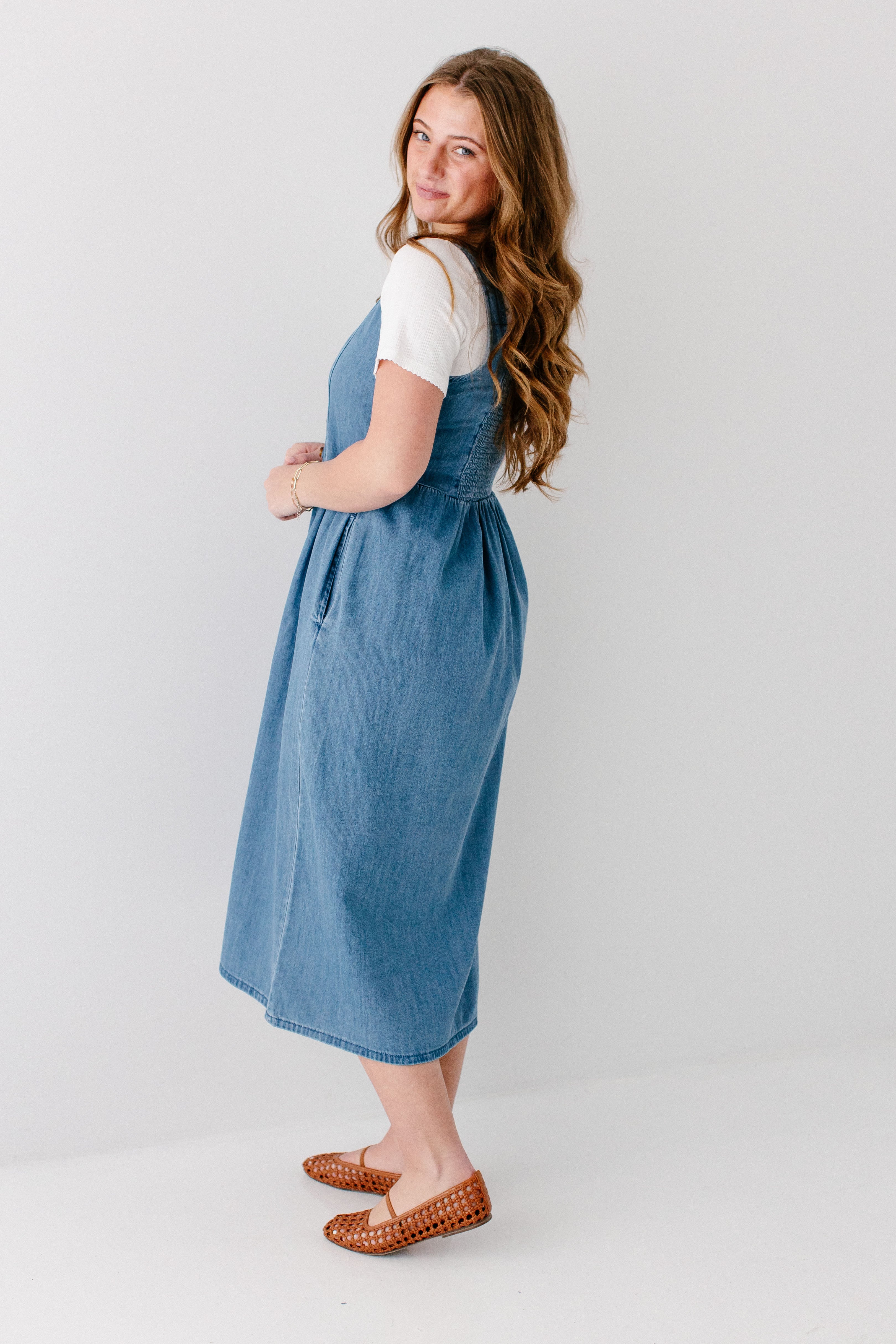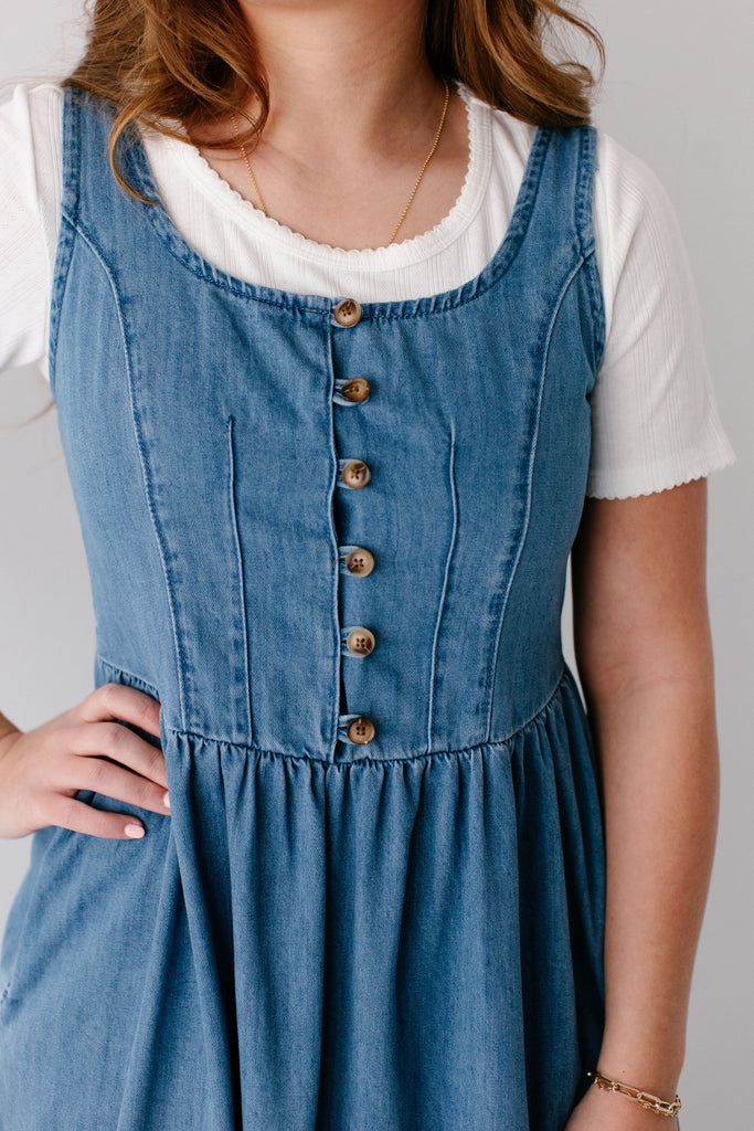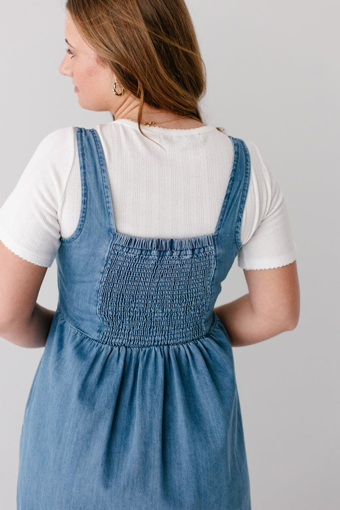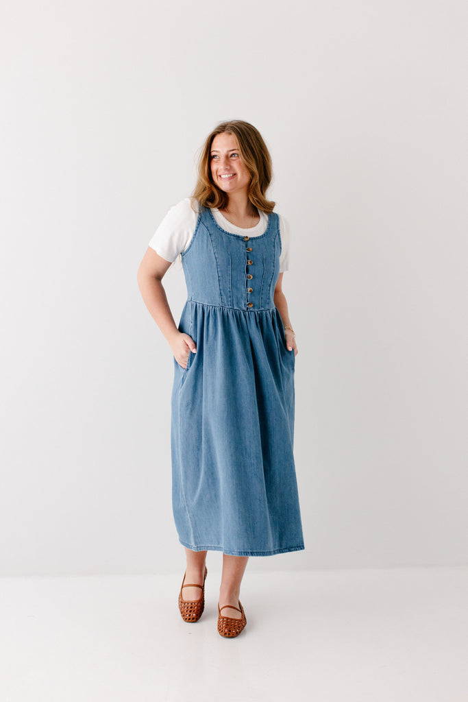 The perfect dresses are season-less! The 'Everette' Button Detail Denim Midi Dress is a perfect all-season pinafore-style denim dress with functional buttons on the bodice, partial smocking in the back for additional stretch, pockets, flattering A-line style, and made from 100% cotton! Layer with a fitted top or cardigan for the cutest outfit to go to church!