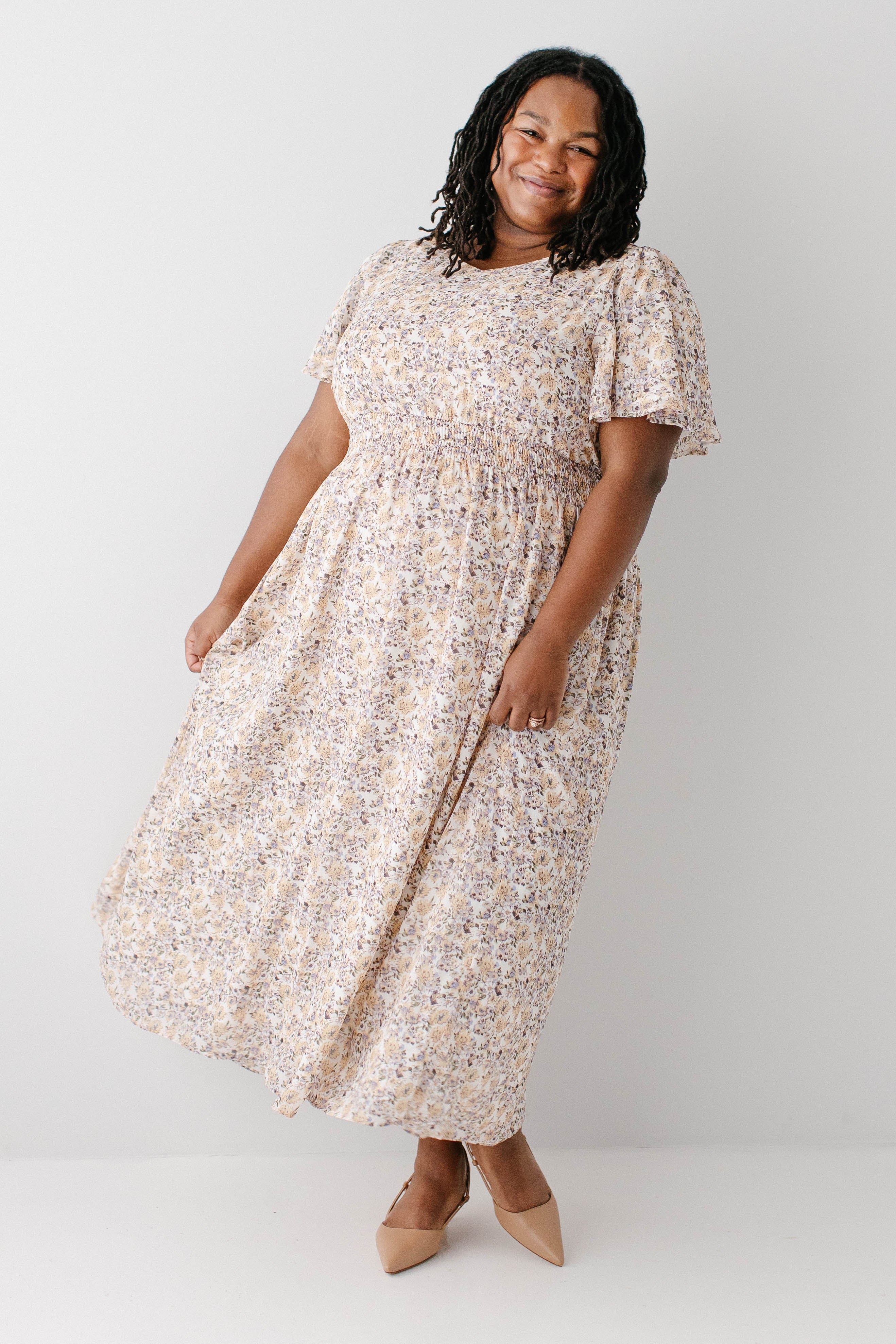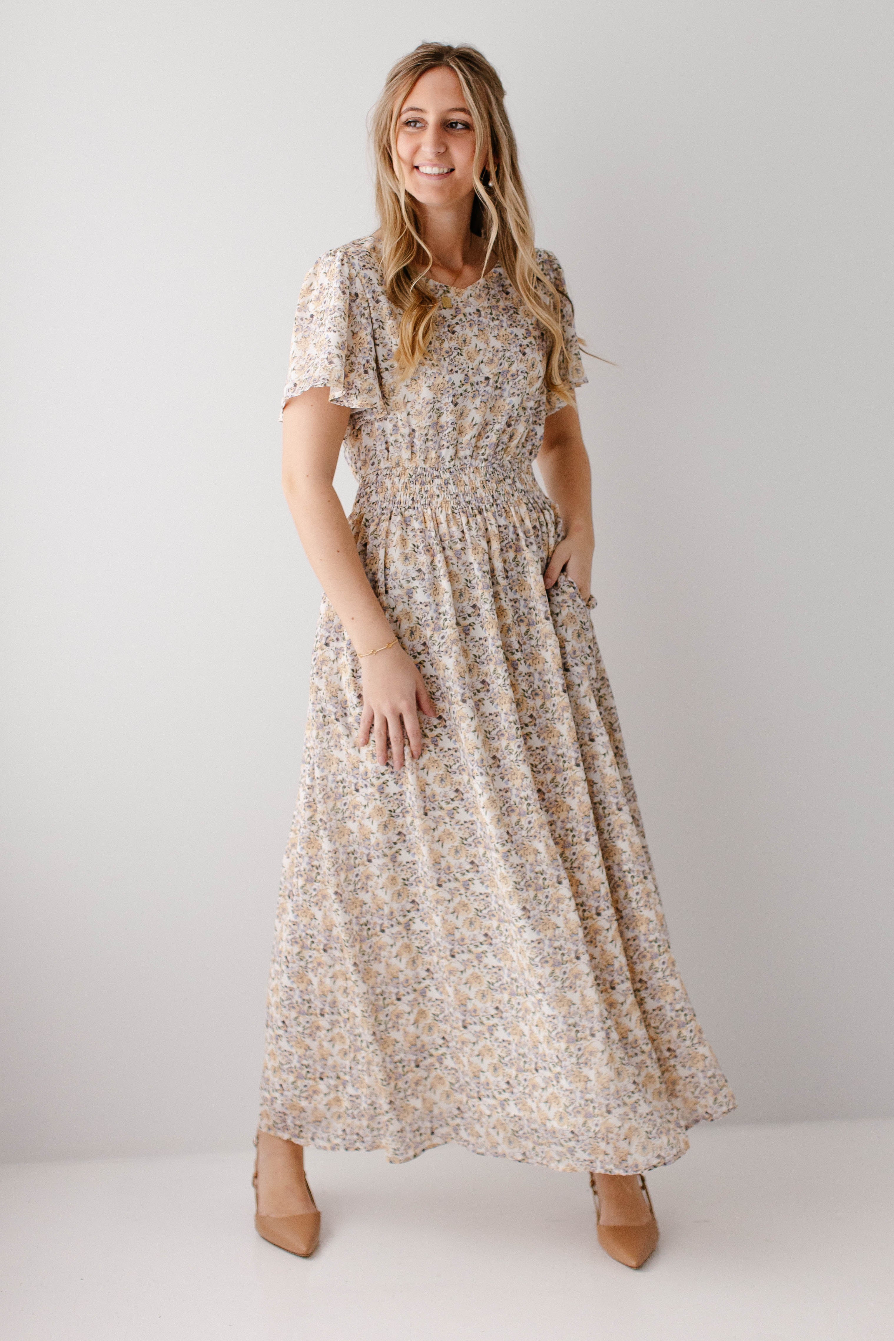 Simplicity meets elegance in the ‘Felicity’ Maxi Dress. It has so many features to love, like the flutter sleeves, high V-neck, forgiving smocked waistband, and flattering A-line style skirt, all in a pretty, dusty yellow floral chiffon fabric. Pair with your favorite heels for any upcoming occasion! Exclusively designed by us with you in mind.