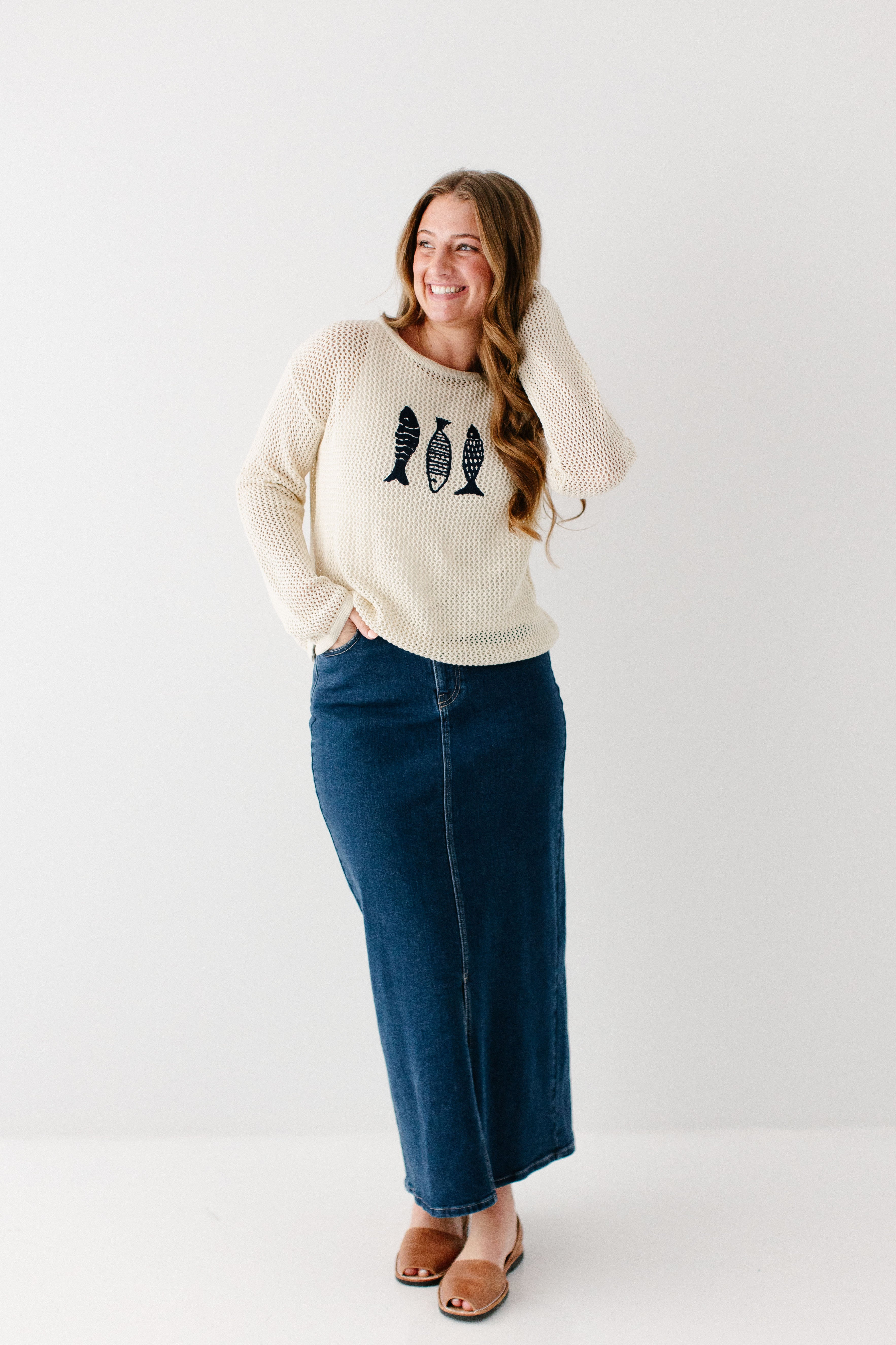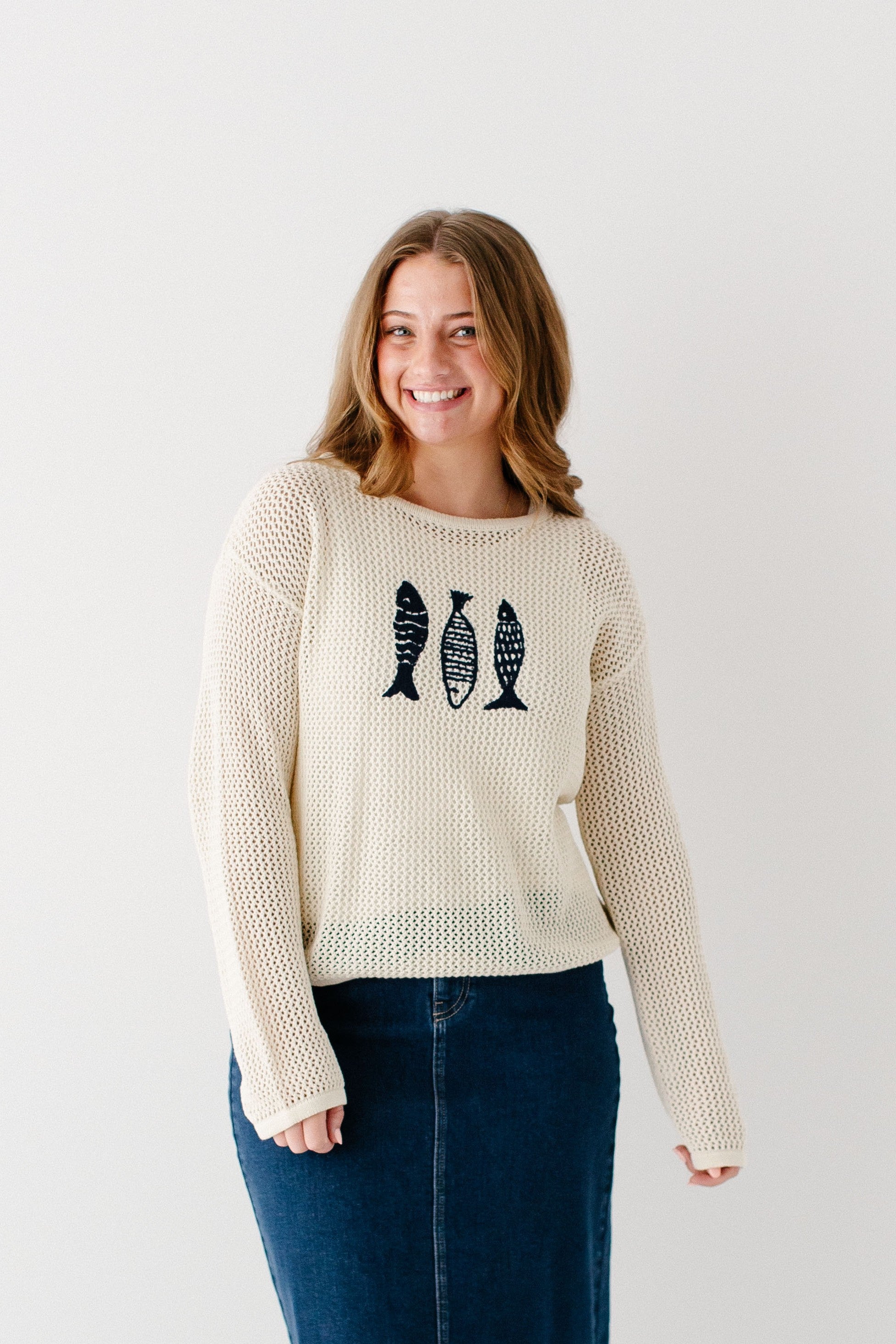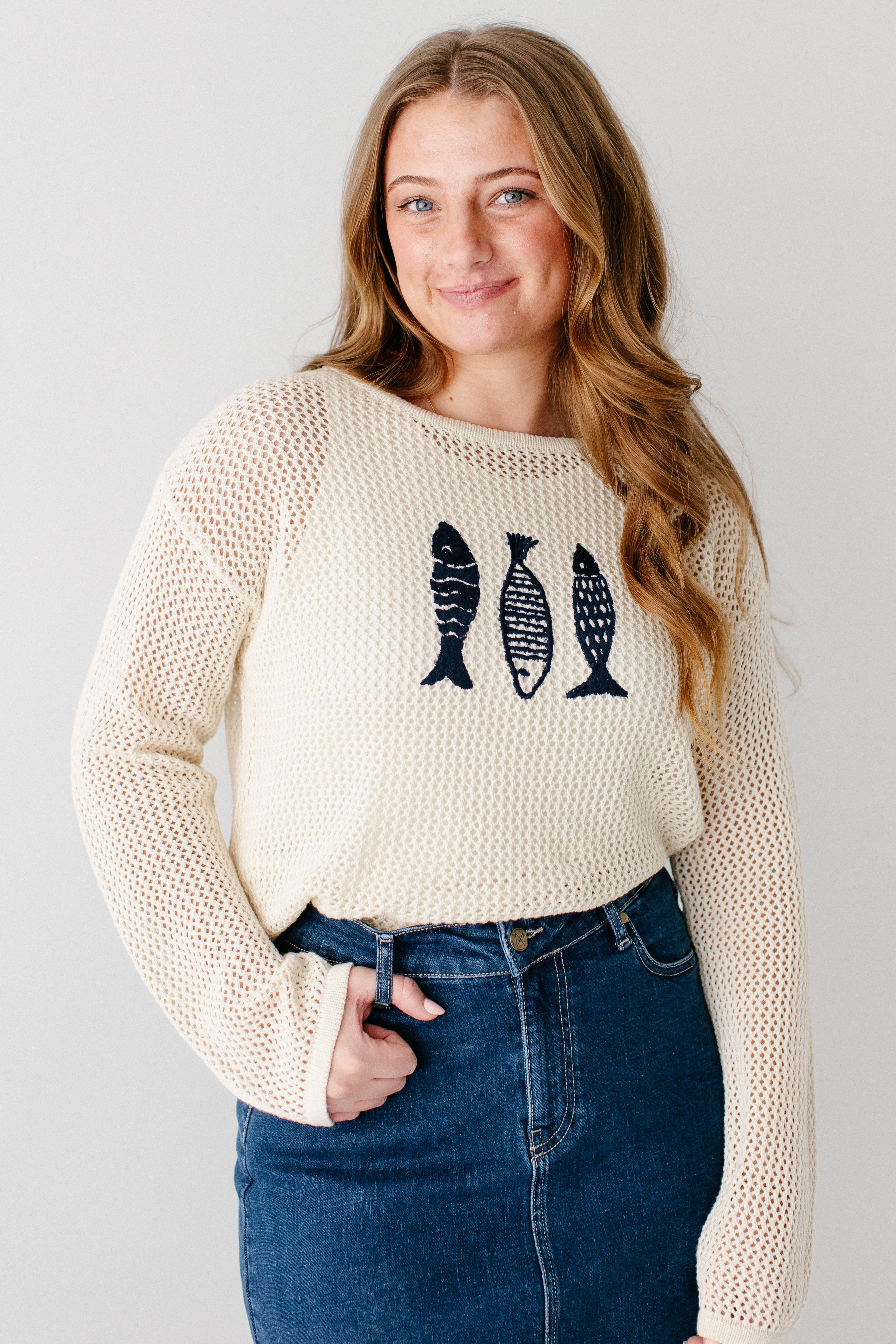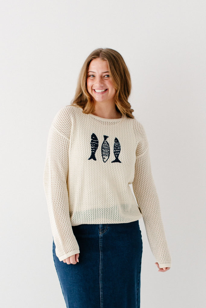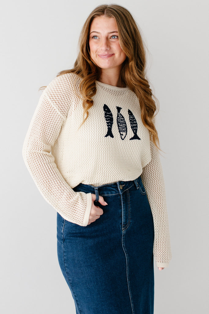 A perfect sweater that reminds us of summertime, meet the 'Fisher' Open Knit Sweater Top. With open knit detailing, cotton blend fabric, and a navy embroidered fish trio detail, this may be one of the cutest pieces ever! We recommend pairing the ‘Fisher’ with one of our layering tops for modest coverage. Pair with your favorite denim skirt for a cute, fisherman-core look and wear on your mid-winter vacation!