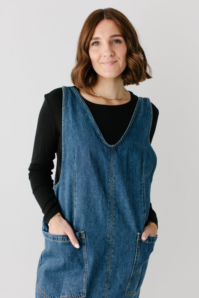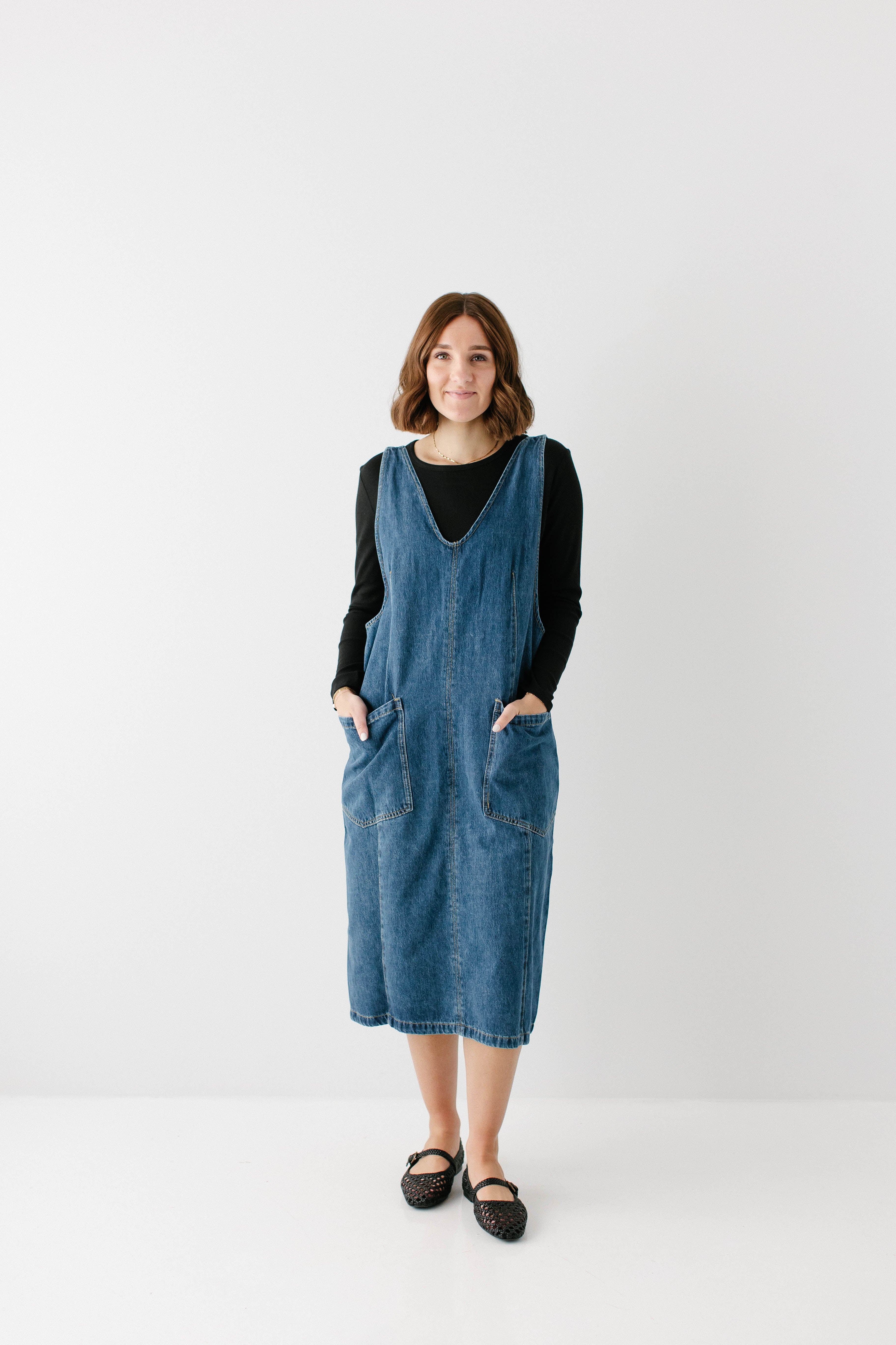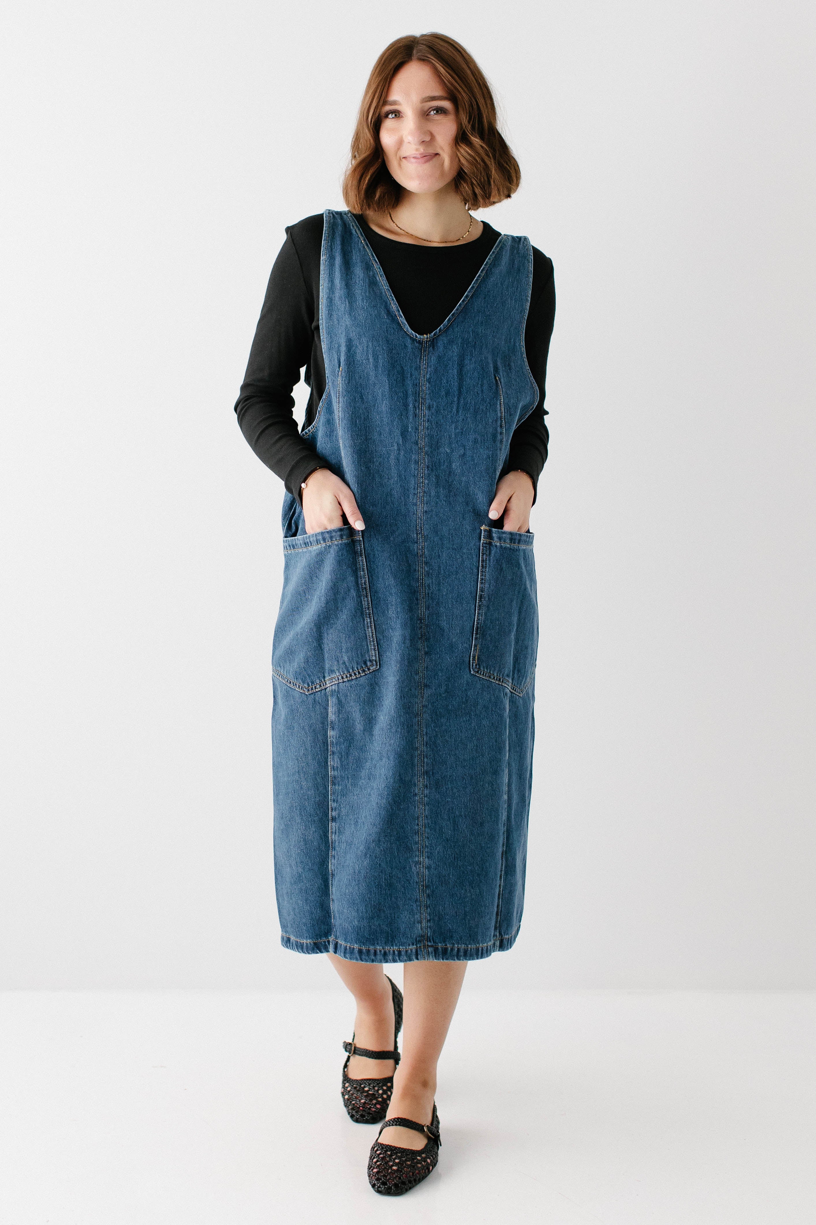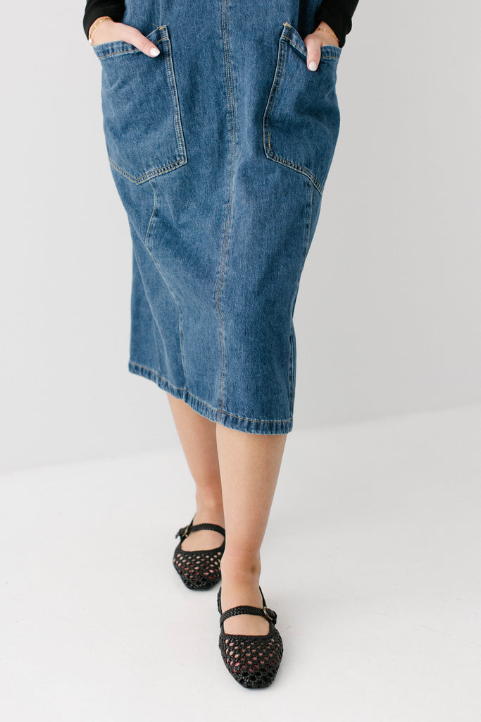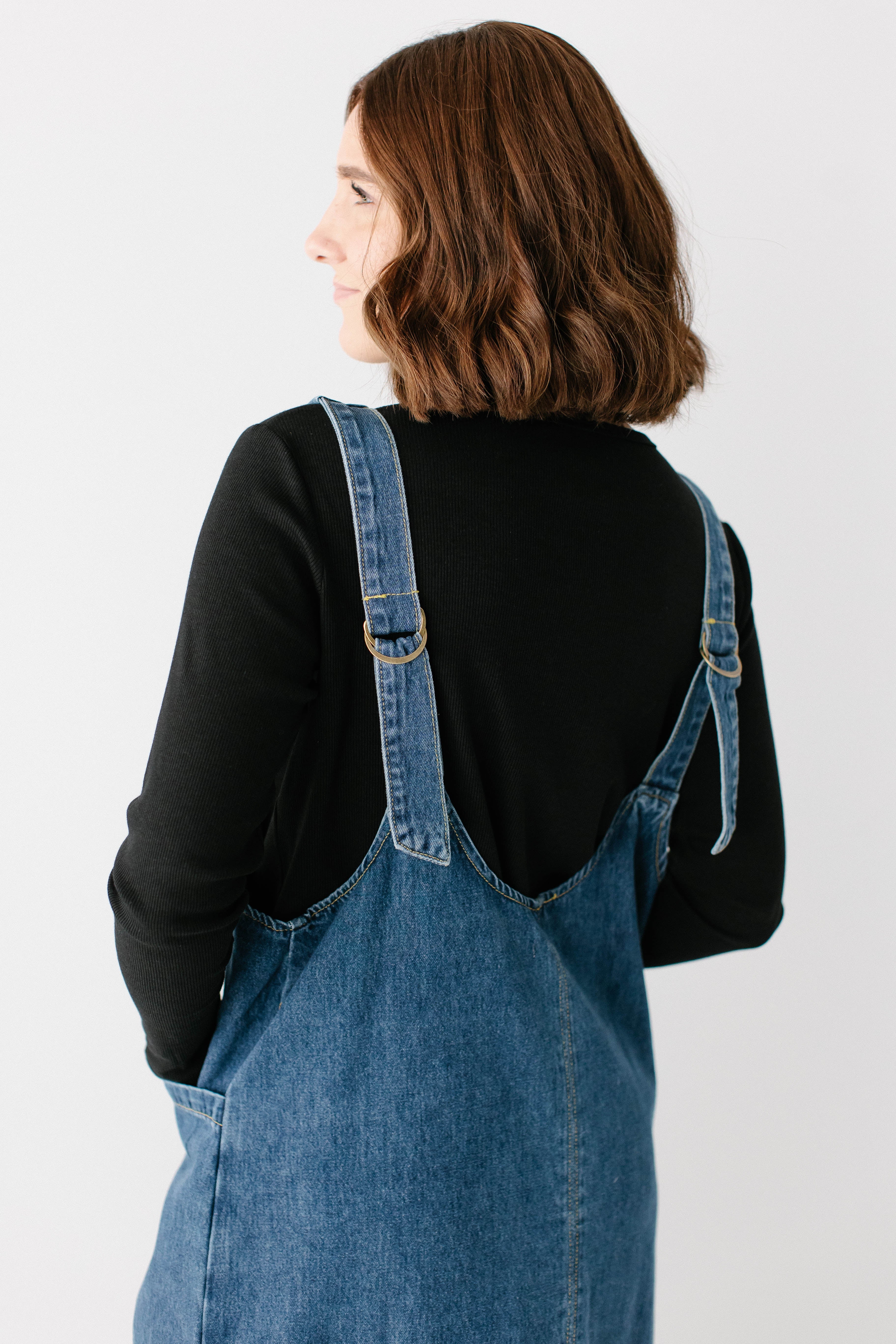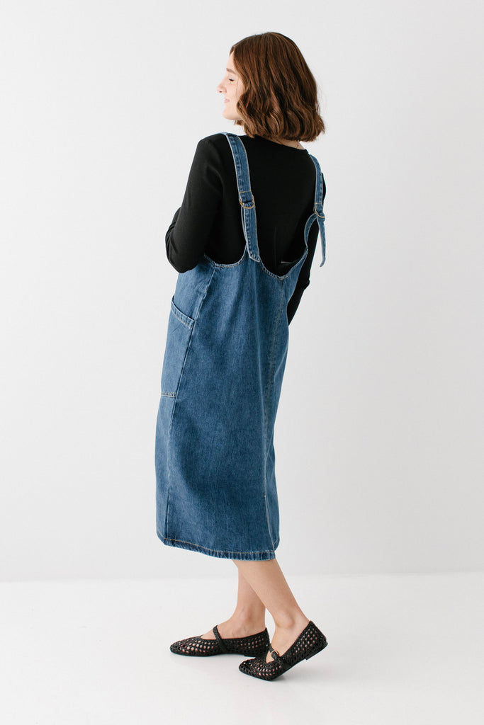 'Ford' Denim Overall Midi Dress in Medium Wash