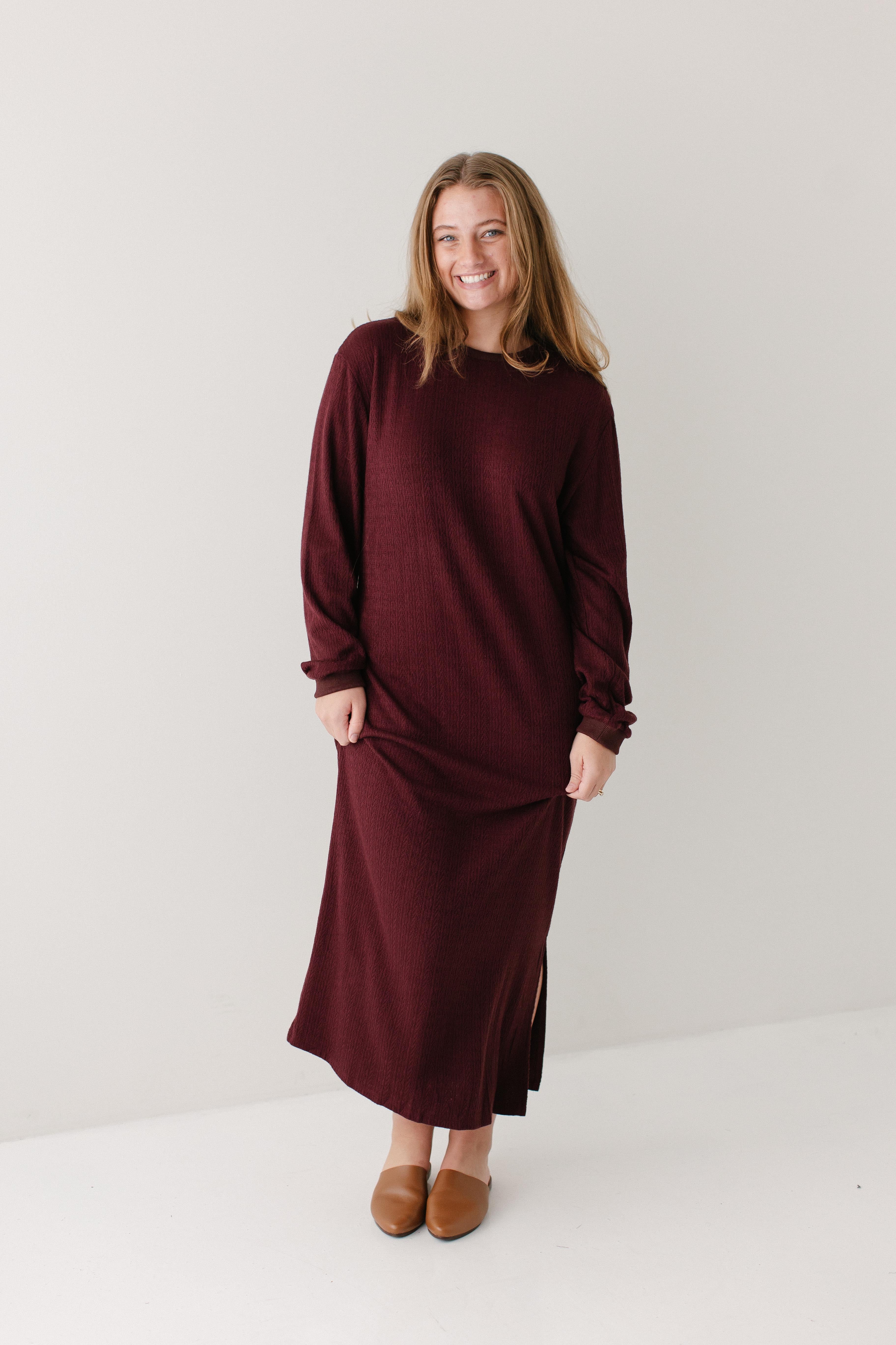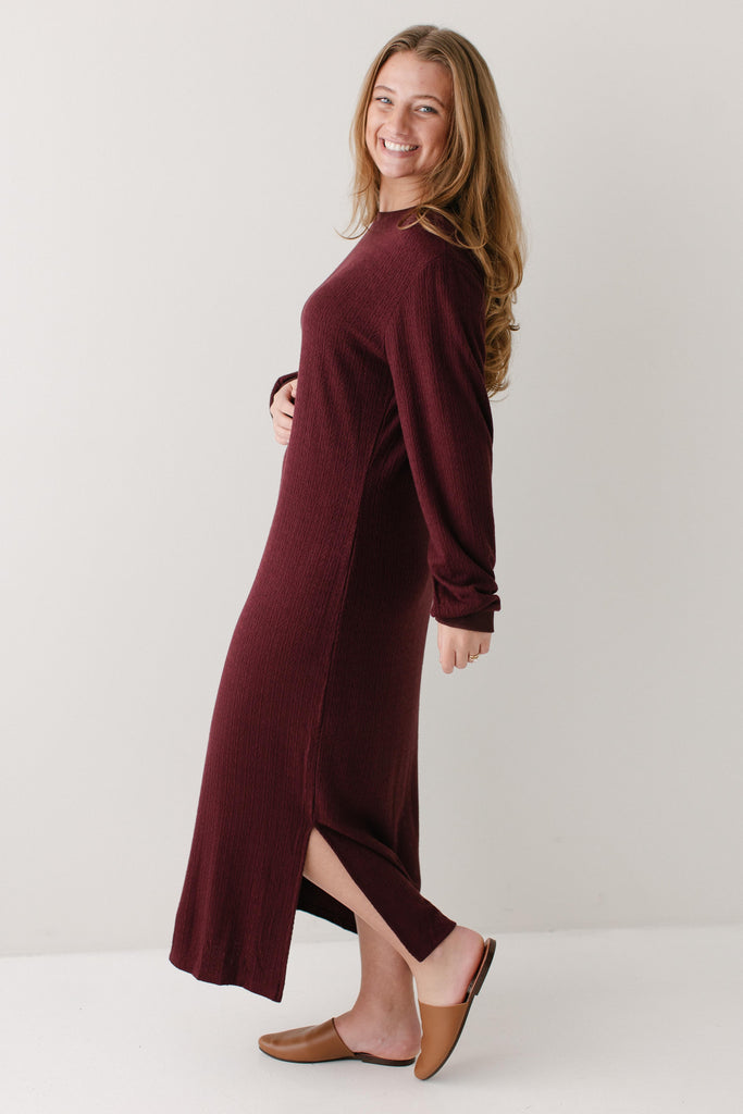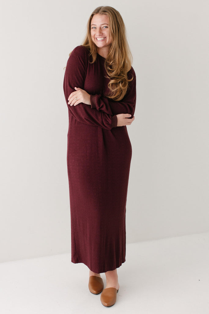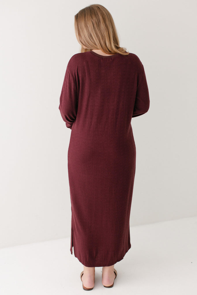 The perfect winter dress - the 'Gabrielle' Pointelle Knit Maxi Dress! Designed with soft, stretchy knit fabric with pointelle detailing, a side slit for easy movement, long sleeves, and in a rich wine color, this is an absolute necessity! Pair this dress with sneakers for an everyday look or dress up with boots and a sweater or cardigan.