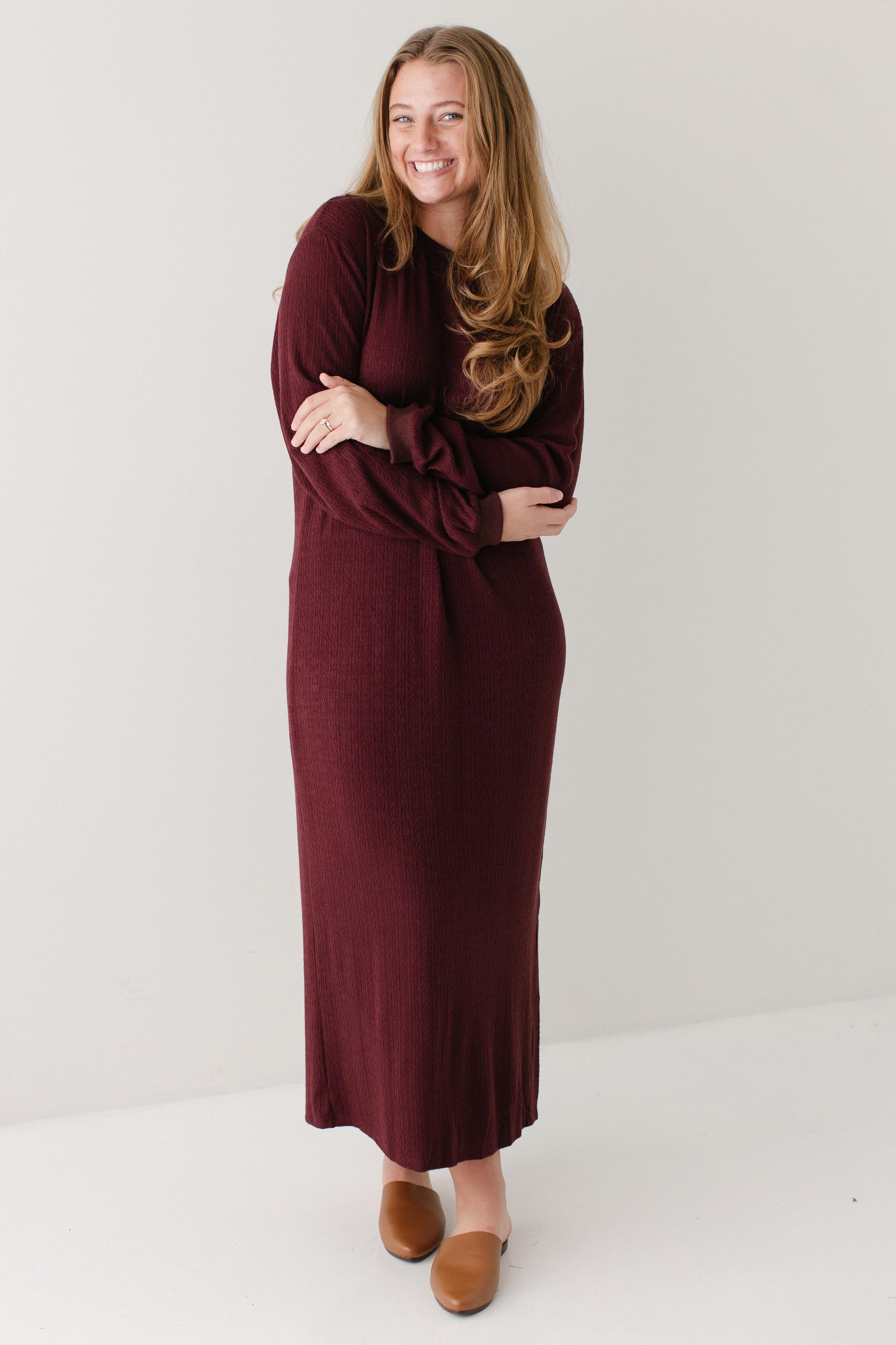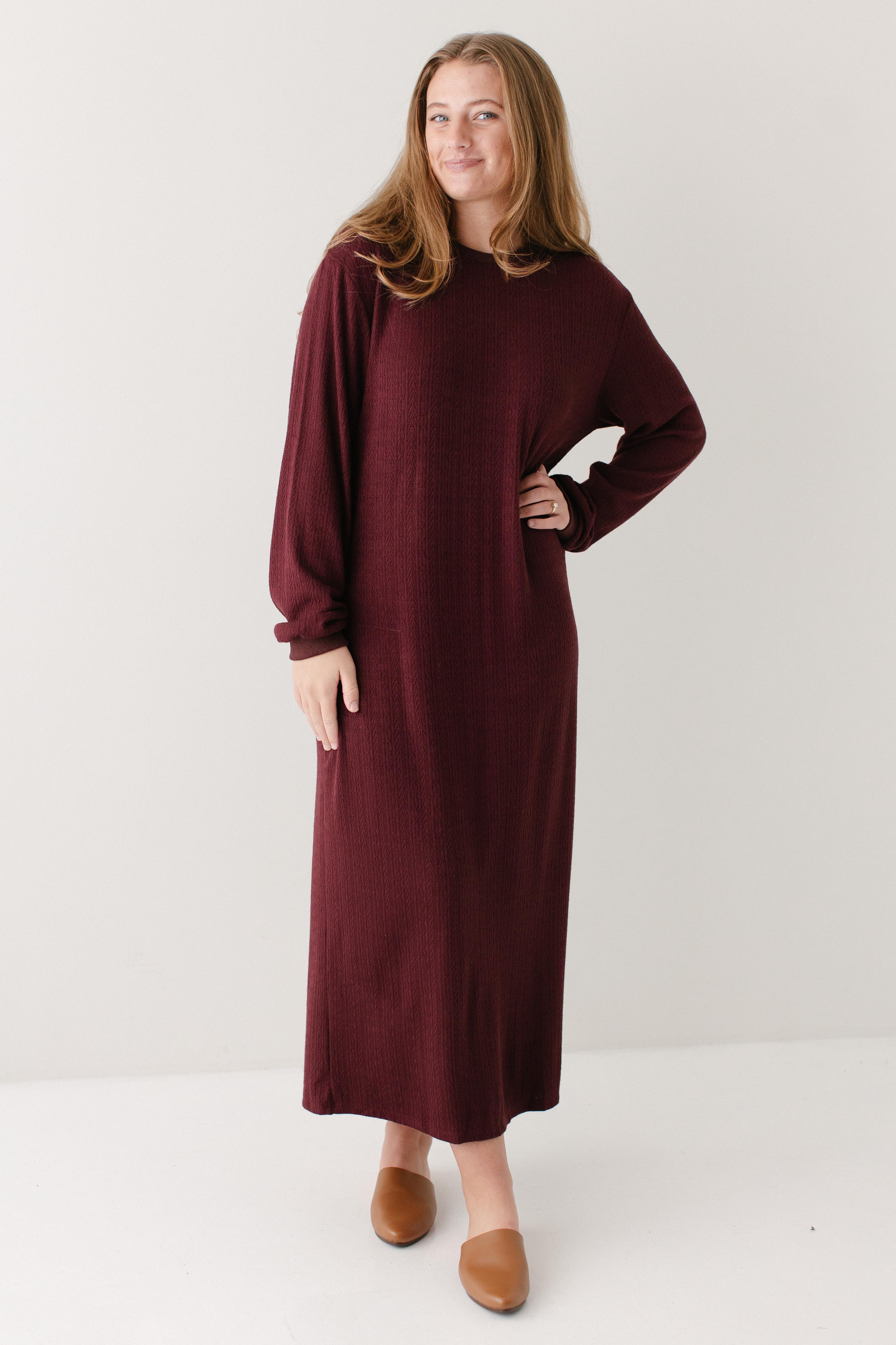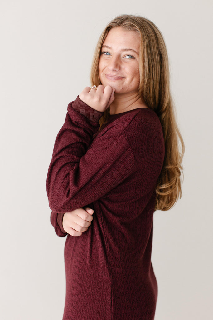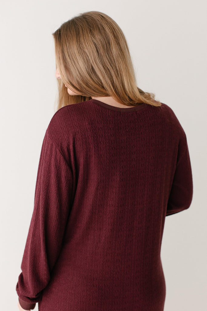The perfect winter dress - the 'Gabrielle' Pointelle Knit Maxi Dress! Designed with soft, stretchy knit fabric with pointelle detailing, a side slit for easy movement, long sleeves, and in a rich wine color, this is an absolute necessity! Pair this dress with sneakers for an everyday look or dress up with boots and a sweater or cardigan.