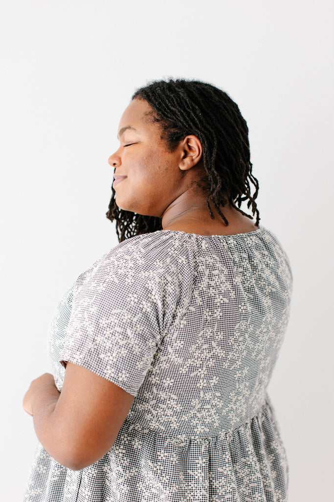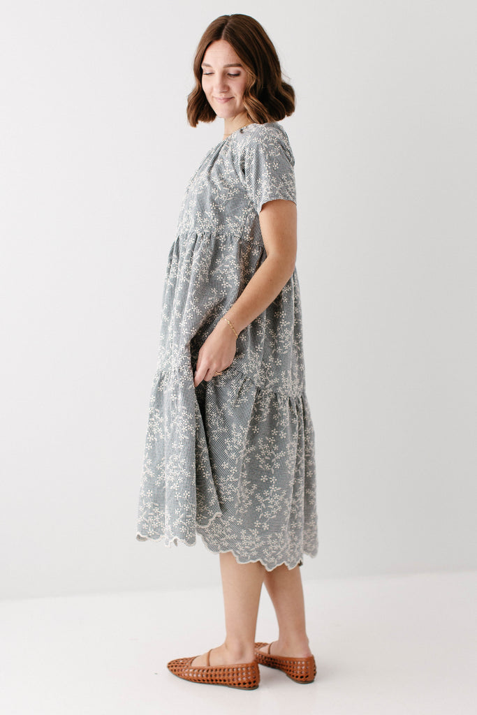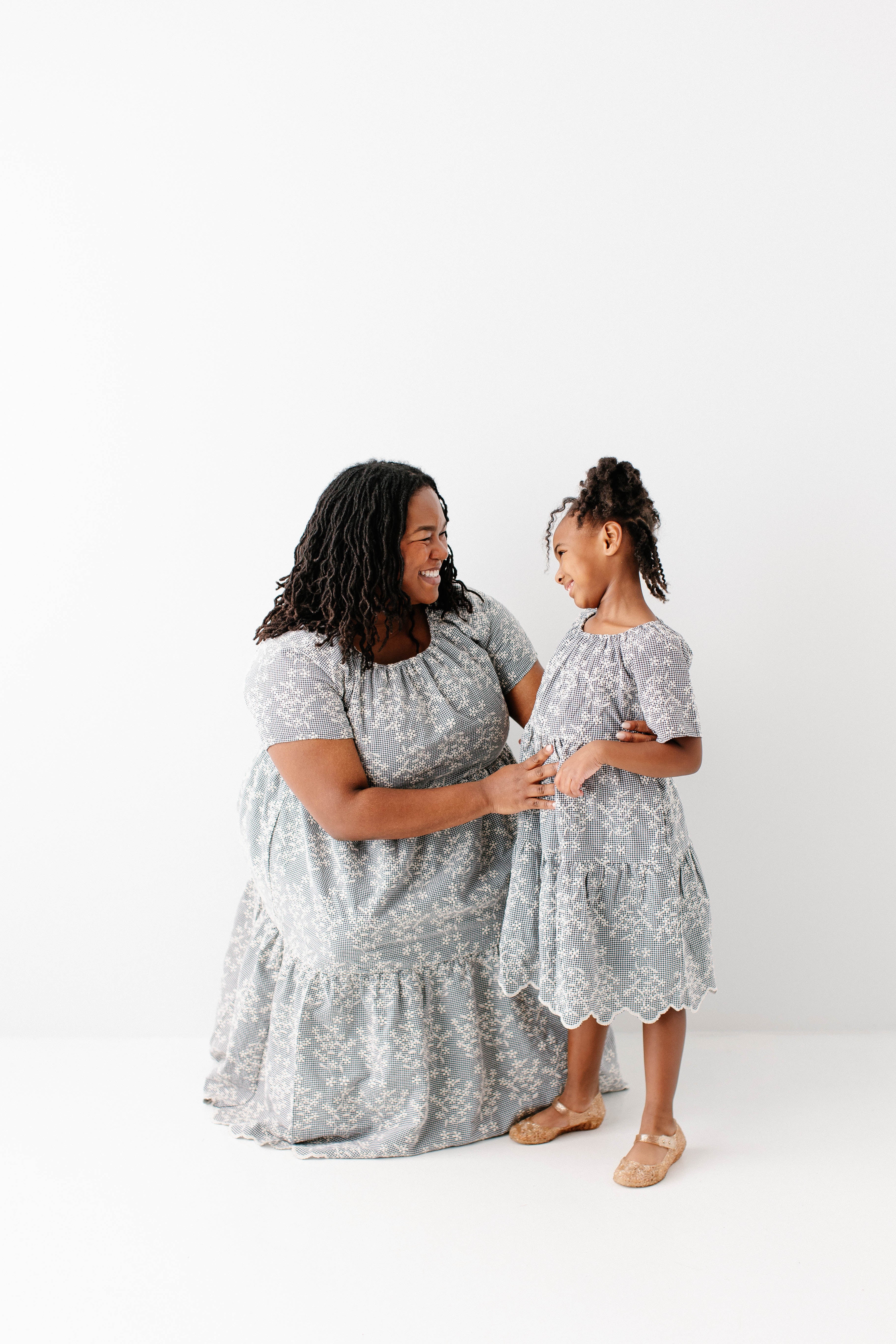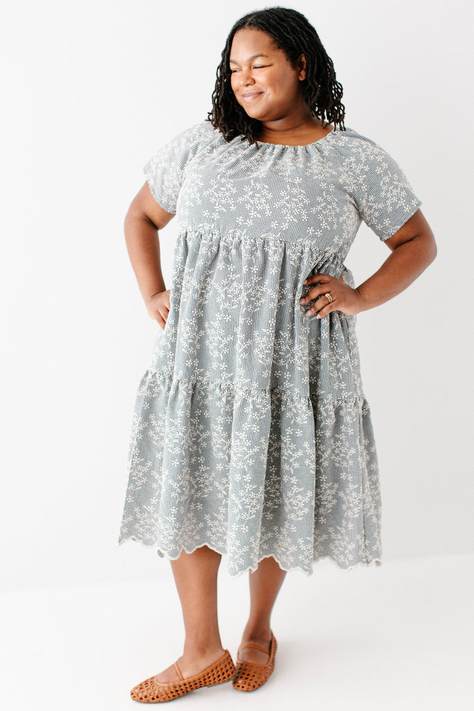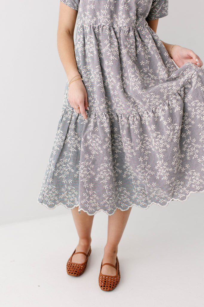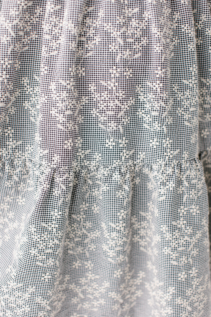 Meet the 'Georgia' Embroidered Floral Gingham Midi Dress, a piece that is both beautiful and practical! Featuring a breathable cotton blend in a black gingham print, scalloped hem, stretchy elastic neckline, and a flowing tiered design that is also maternity/bump friendly, this truly is the dress that stays with you! Better yet, the 'Georgia' also comes in little girl sizes so you can match with your mini for family photos, church, brunch, or any other occasion! Exclusively designed by us with you in mind.