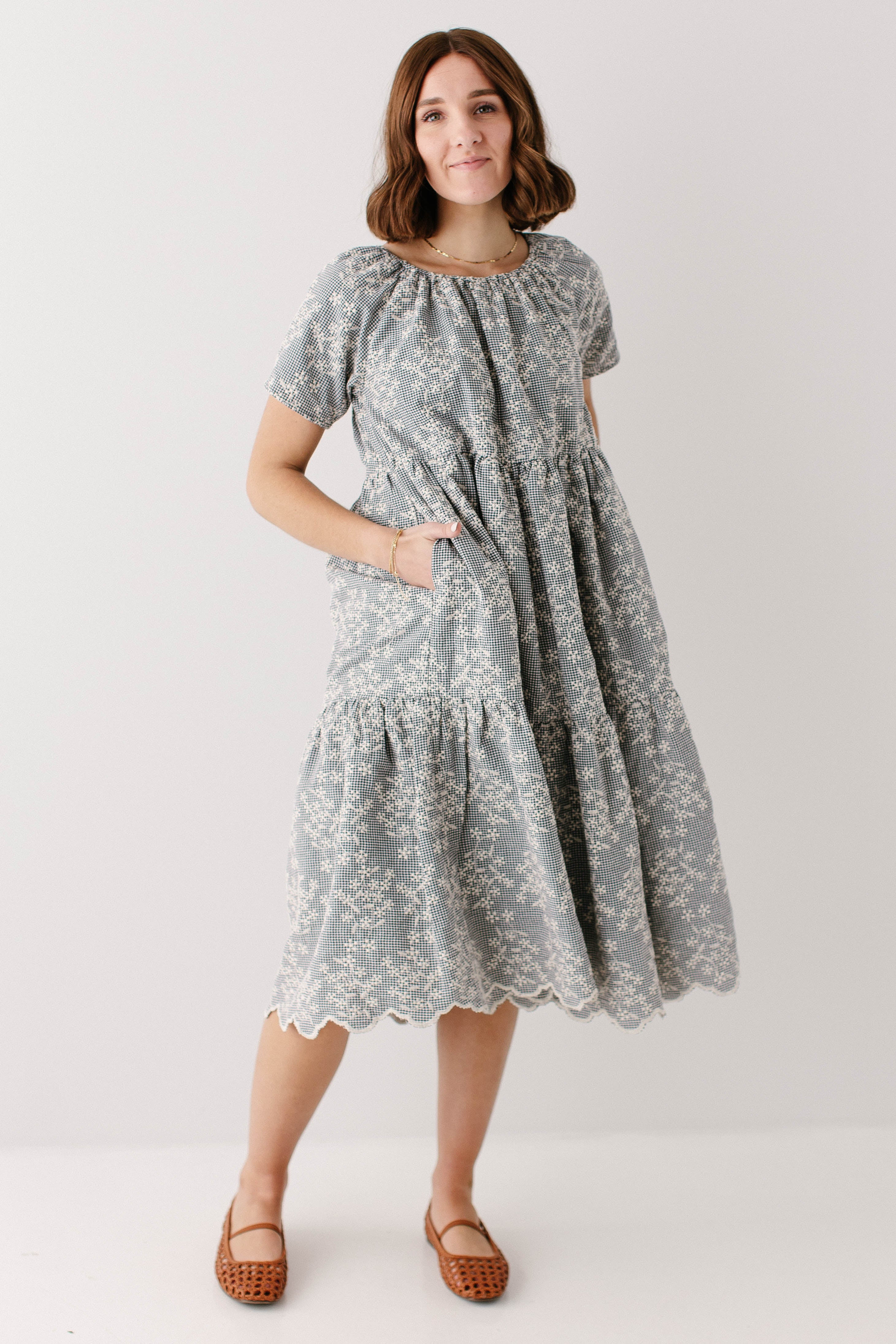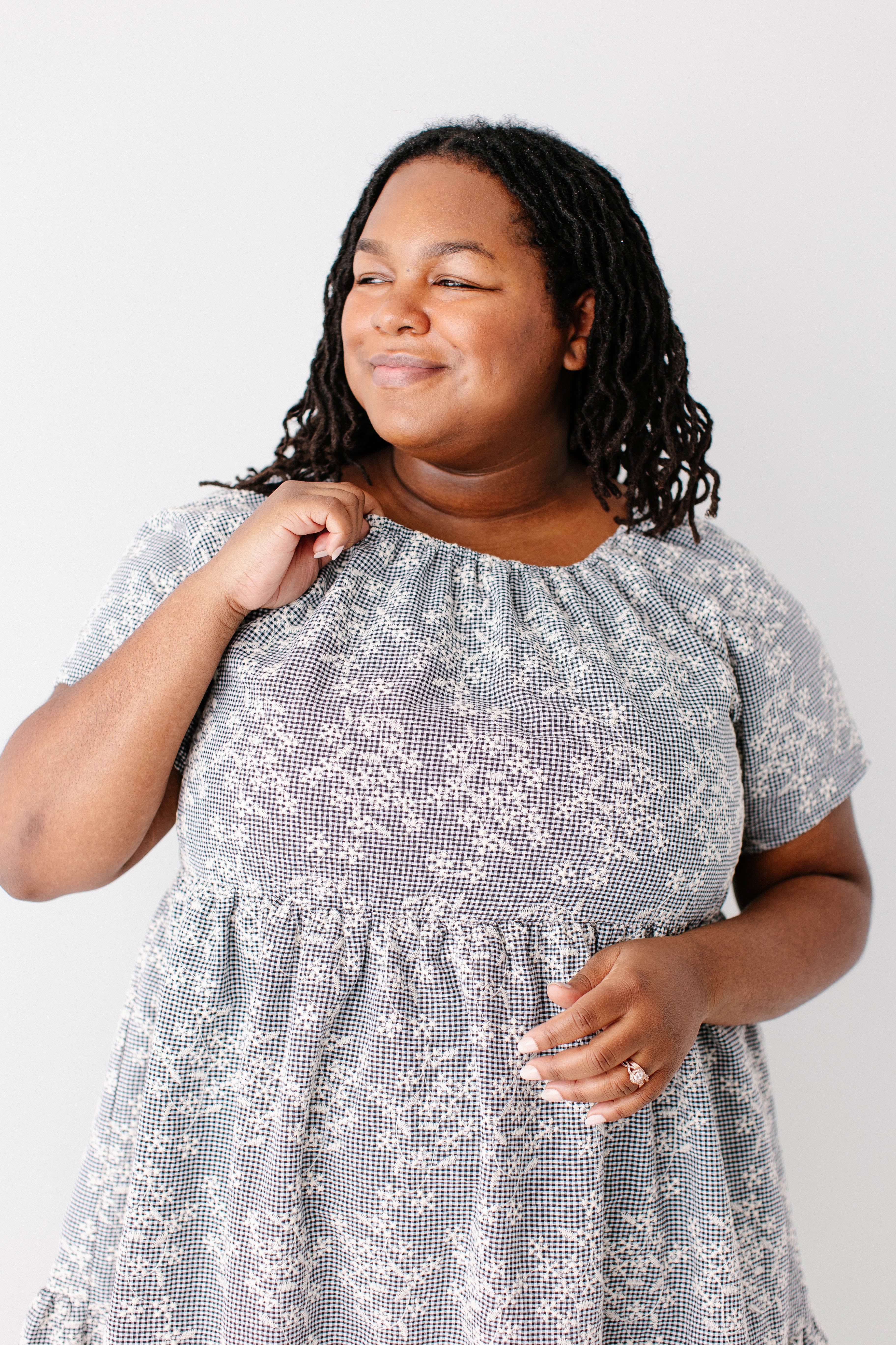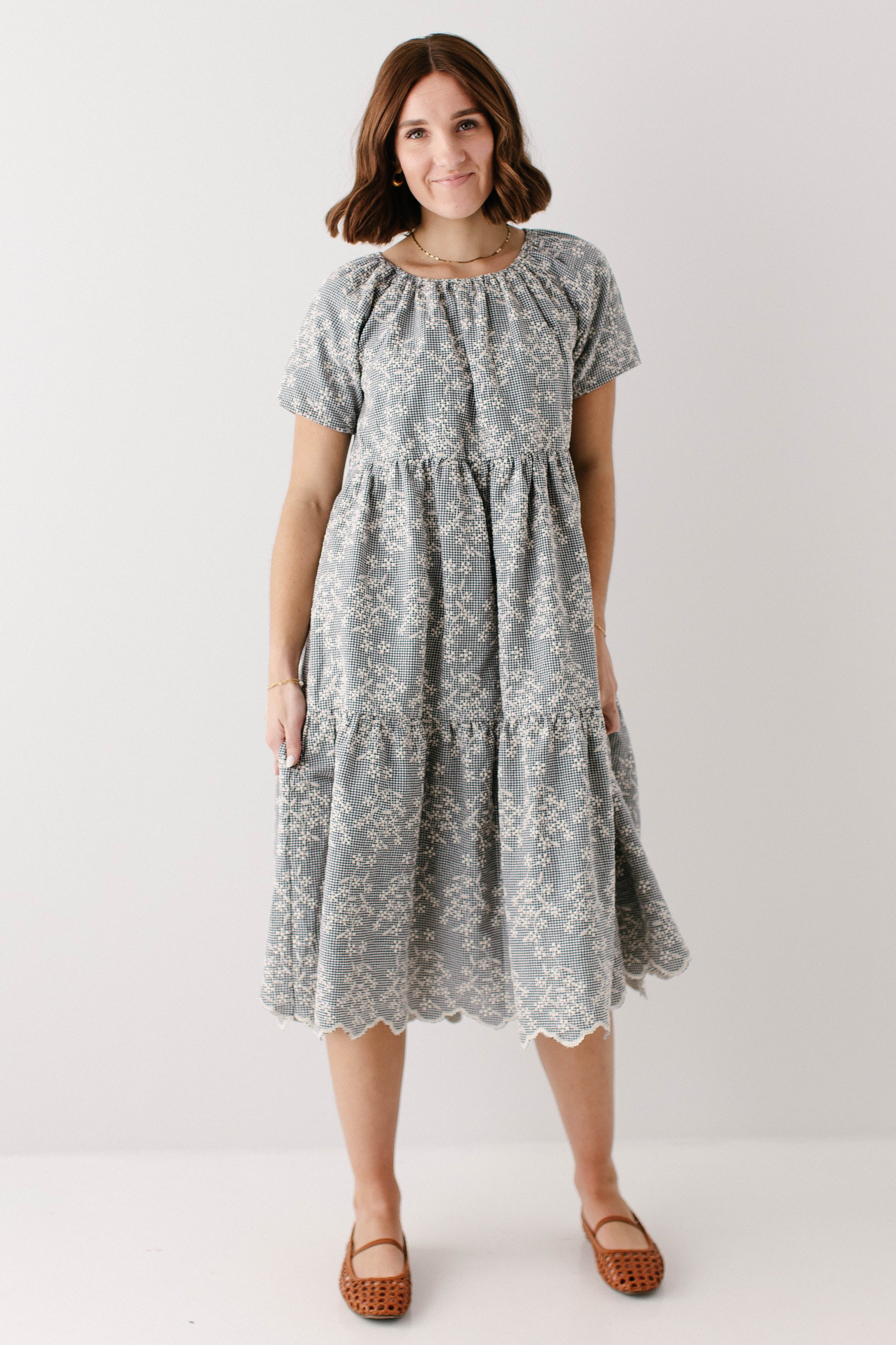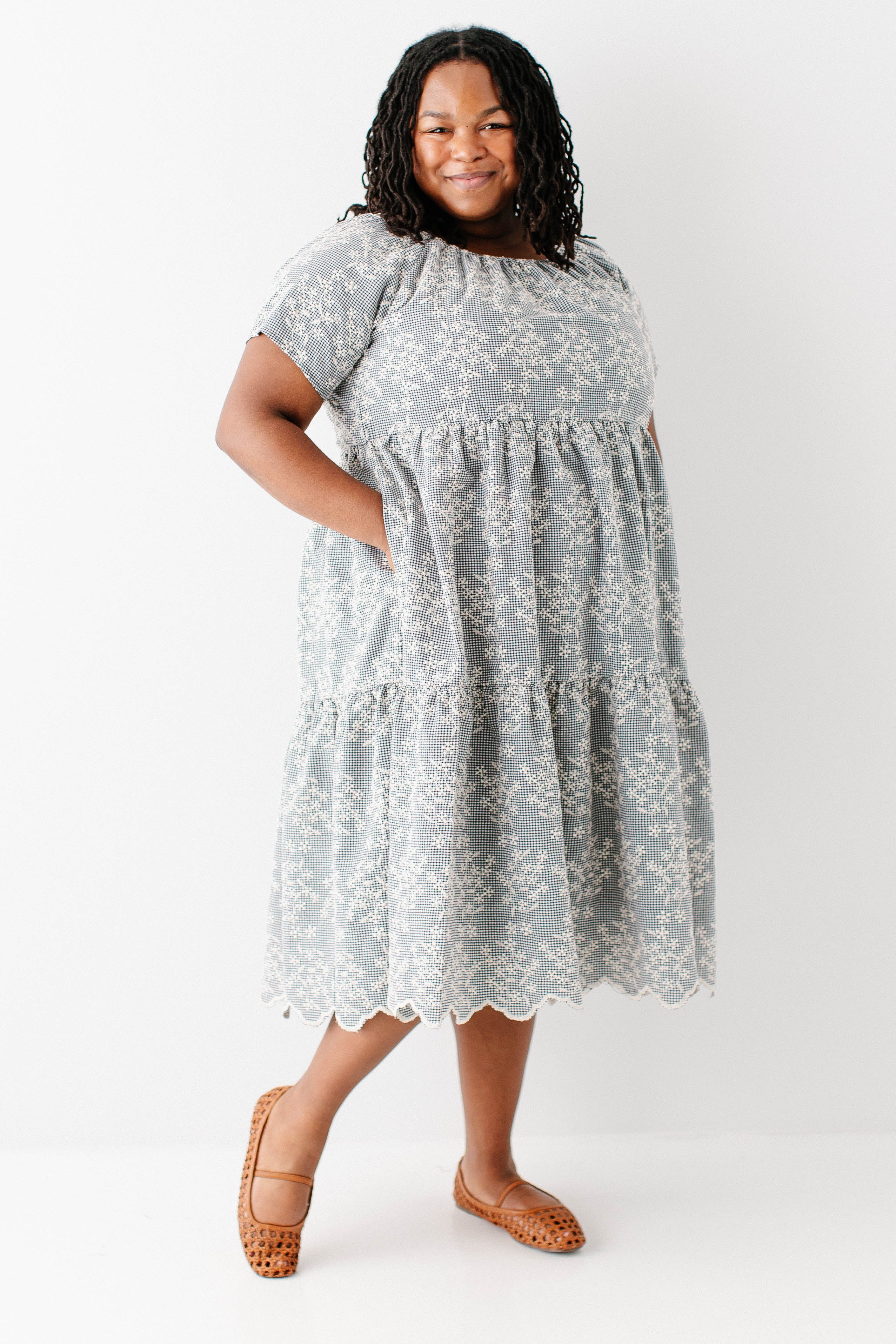 Meet the 'Georgia' Embroidered Floral Gingham Midi Dress, a piece that is both beautiful and practical! Featuring a breathable cotton blend in a black gingham print, scalloped hem, stretchy elastic neckline, and a flowing tiered design that is also maternity/bump friendly, this truly is the dress that stays with you! Better yet, the 'Georgia' also comes in little girl sizes so you can match with your mini for family photos, church, brunch, or any other occasion! Exclusively designed by us with you in mind.