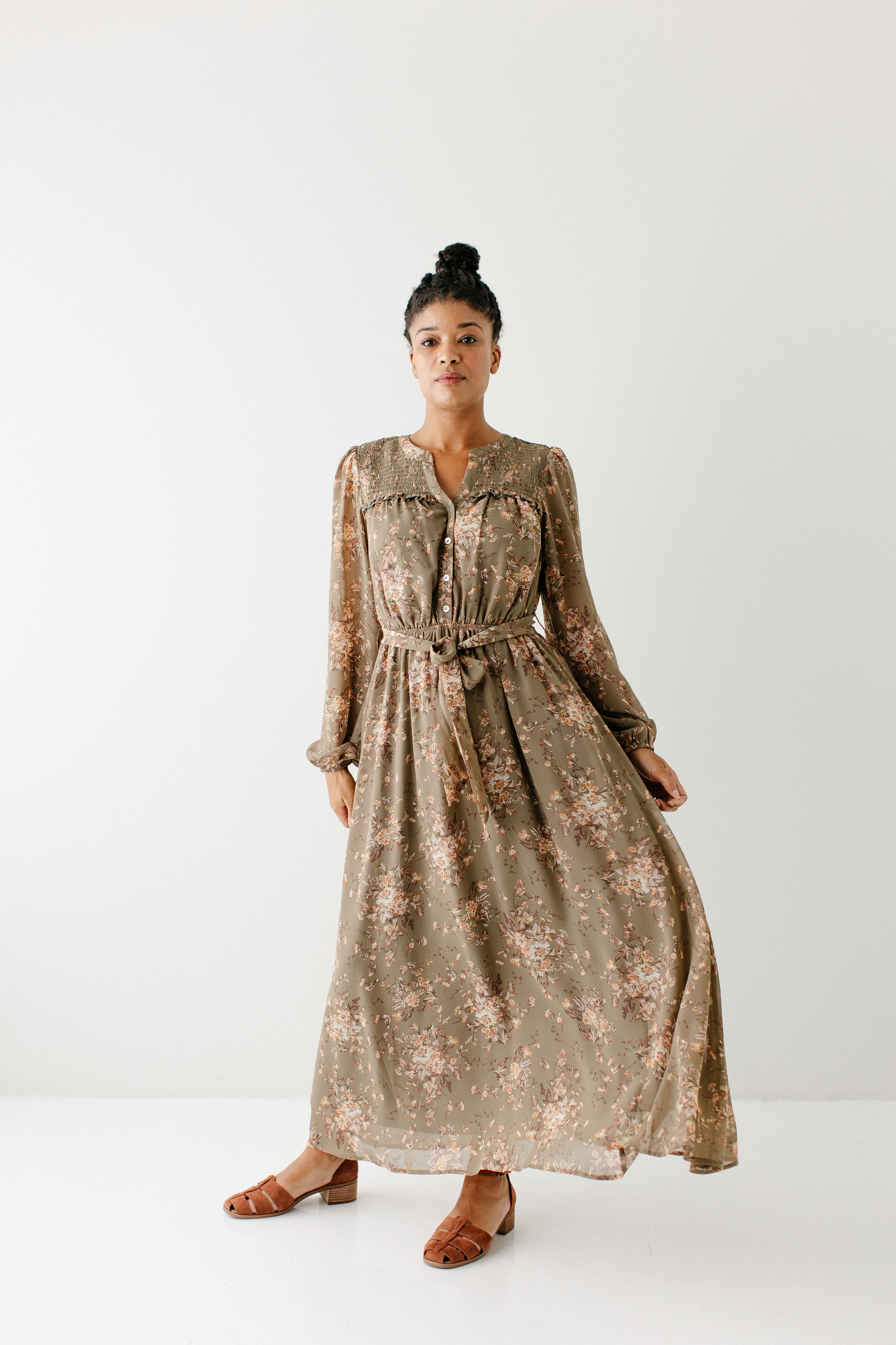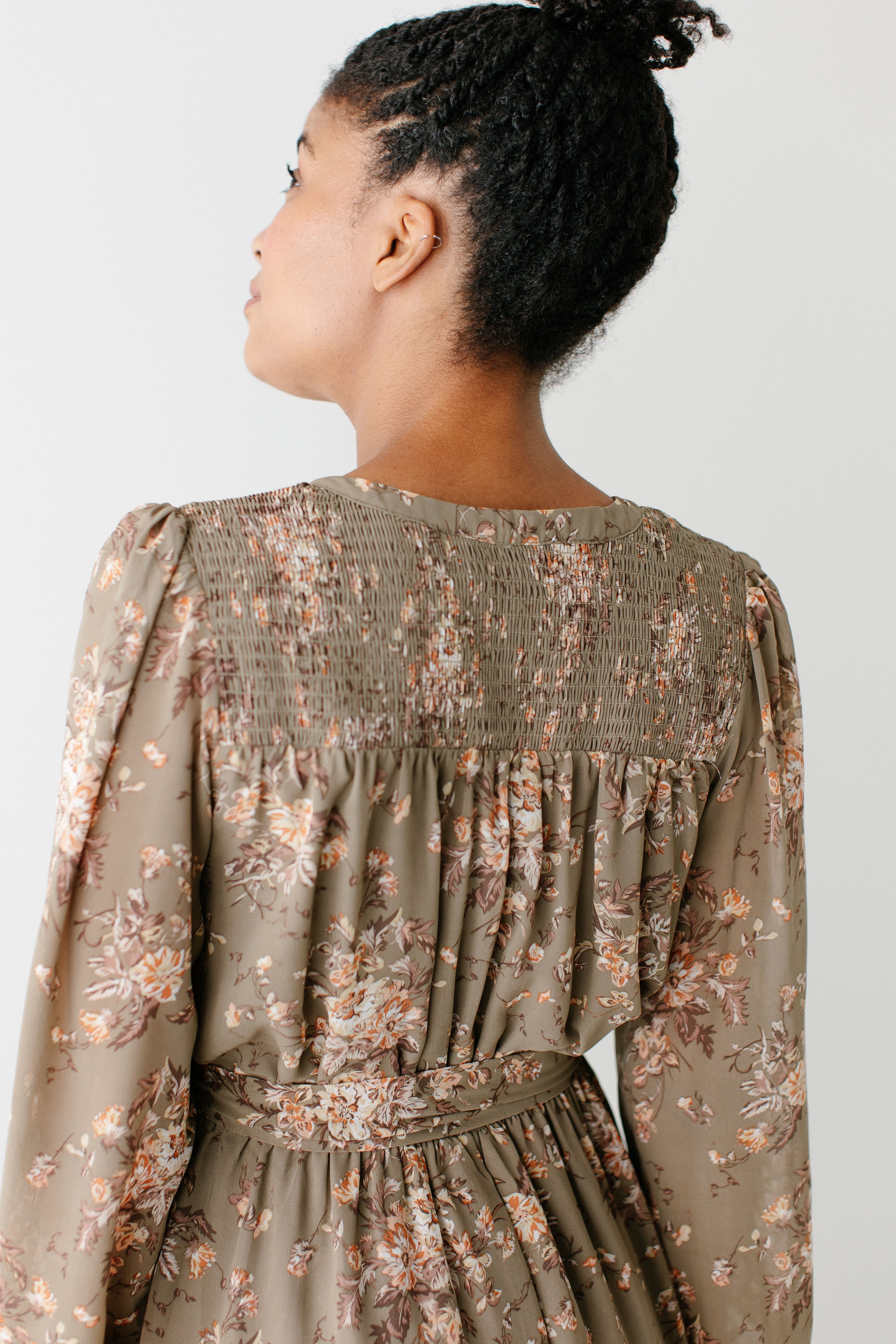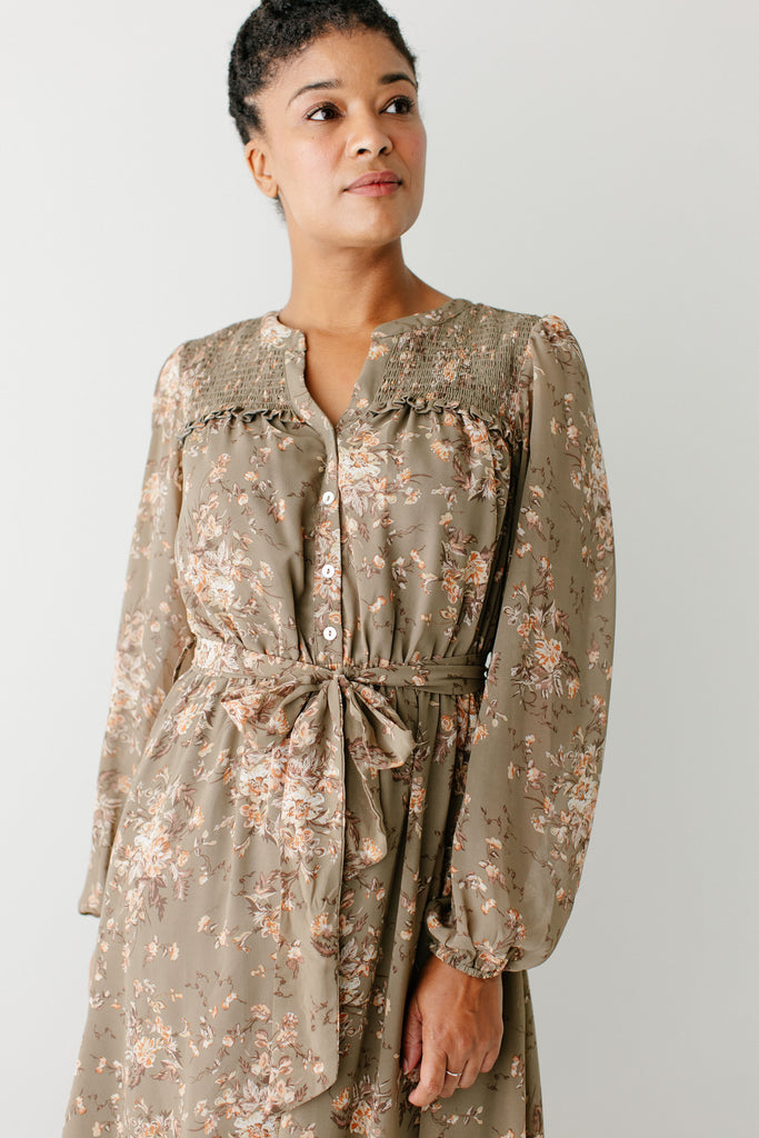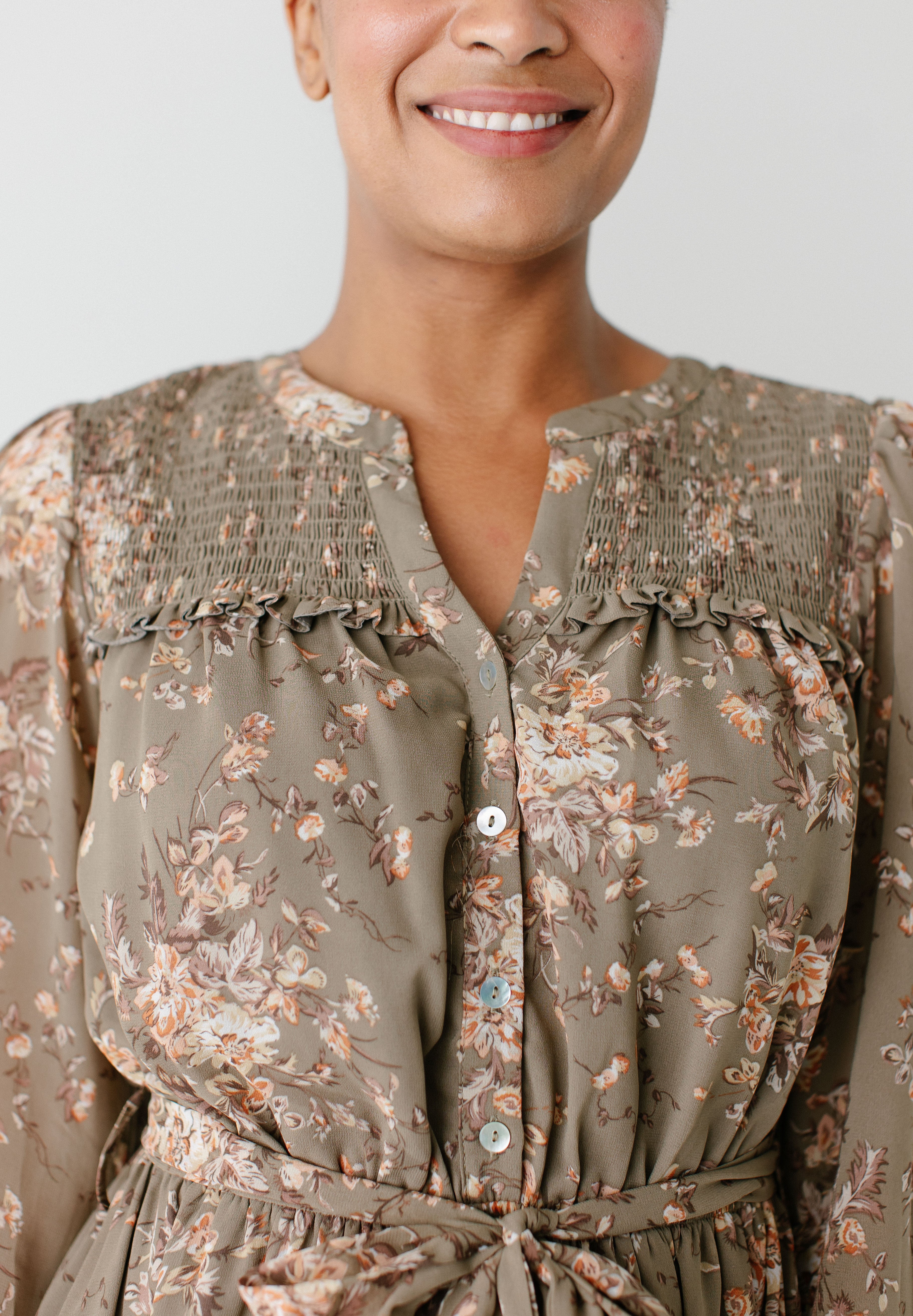 Every woman needs a dress with effortlessly feminine details! The 'Hadassah' Smocked Detail Floral Chiffon Maxi Dress has a pretty floral print on flowing chiffon fabric, ruffle and smocked detailing on the bodice, elastic and tie waist, and functional buttons - making this dress a great nursing friendly piece. The ‘Hadassah’ is a perfect staple piece for all of your formal autumn events!