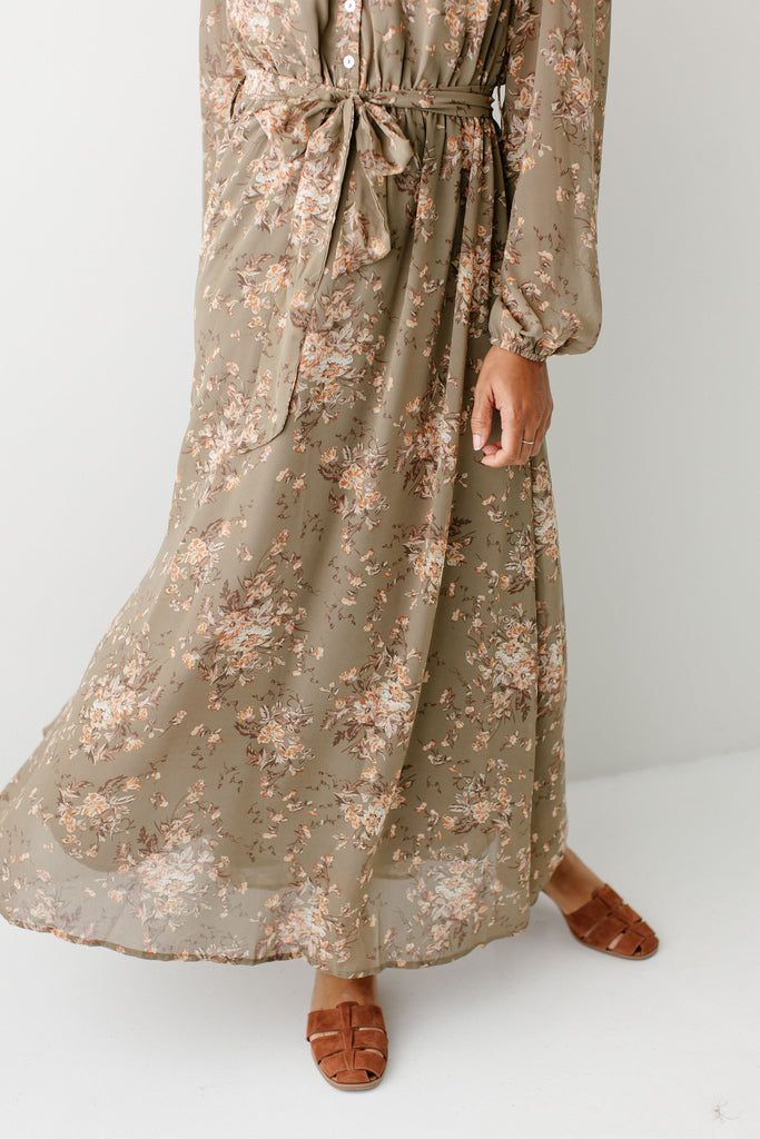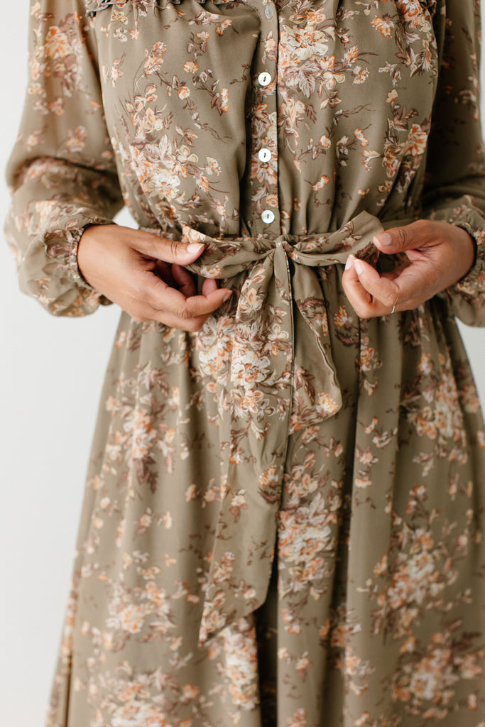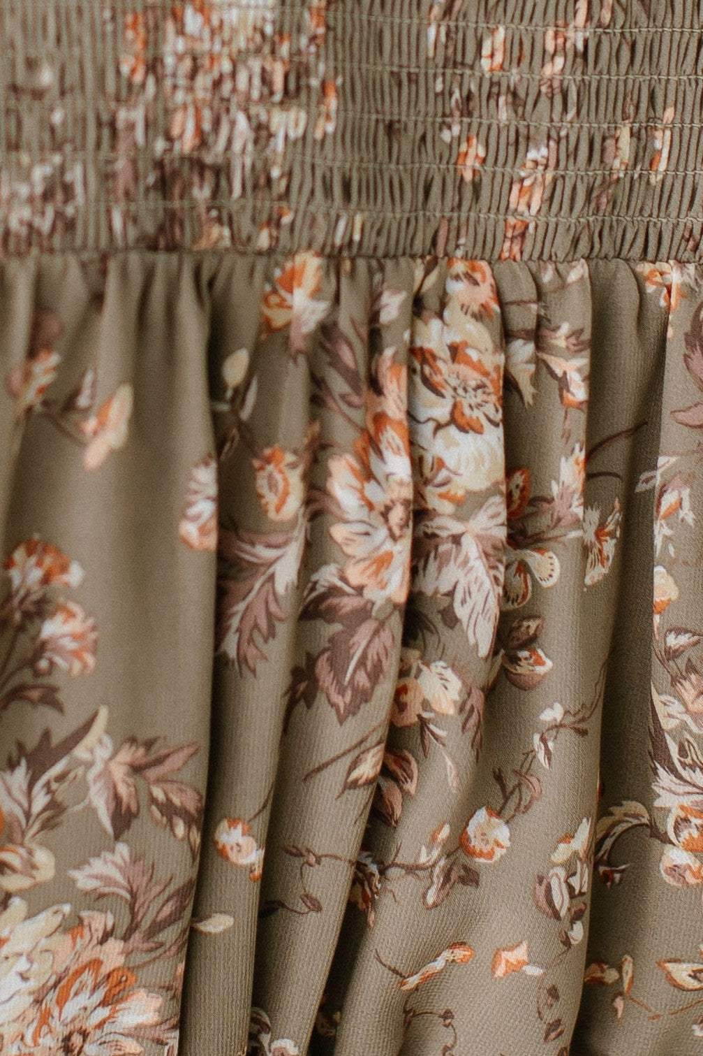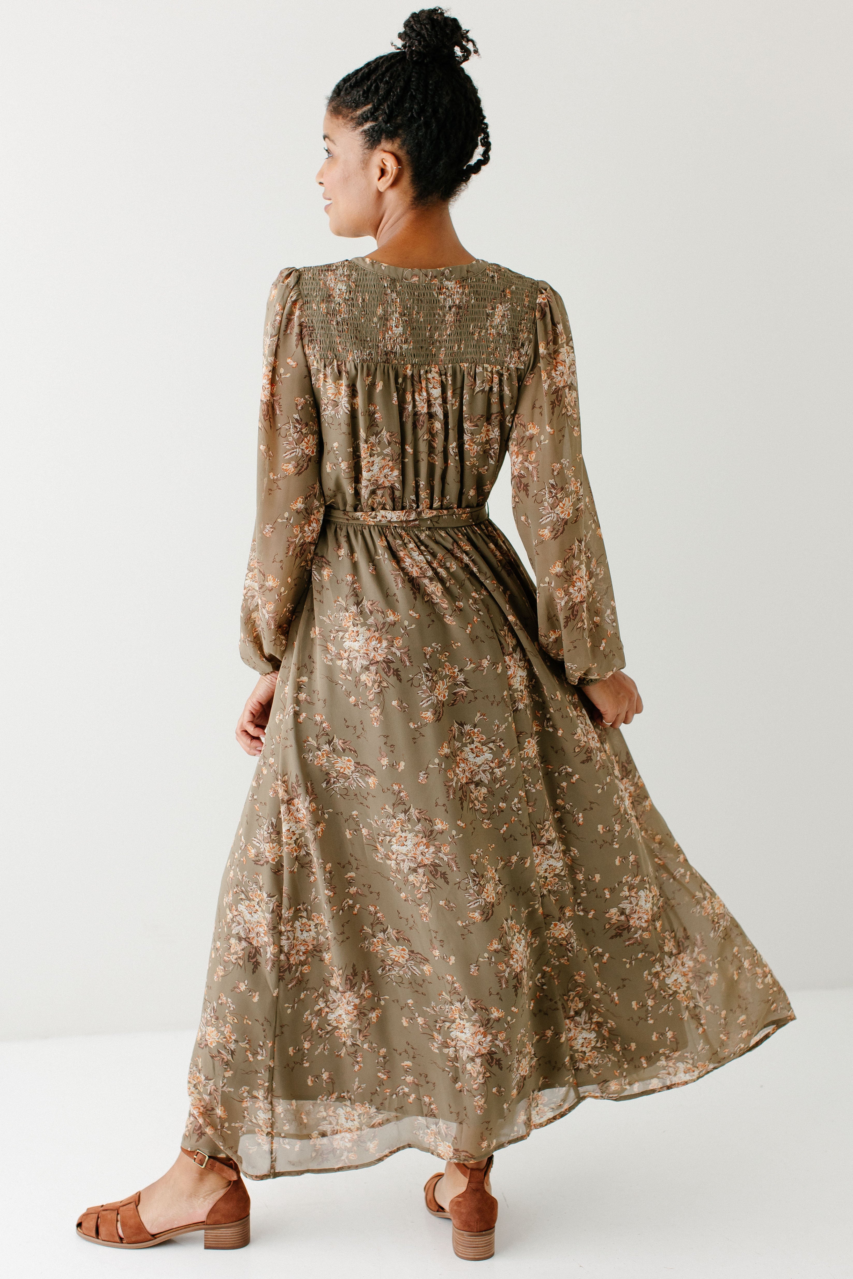 Every woman needs a dress with effortlessly feminine details! The 'Hadassah' Smocked Detail Floral Chiffon Maxi Dress has a pretty floral print on flowing chiffon fabric, ruffle and smocked detailing on the bodice, elastic and tie waist, and functional buttons - making this dress a great nursing friendly piece. The ‘Hadassah’ is a perfect staple piece for all of your formal autumn events!