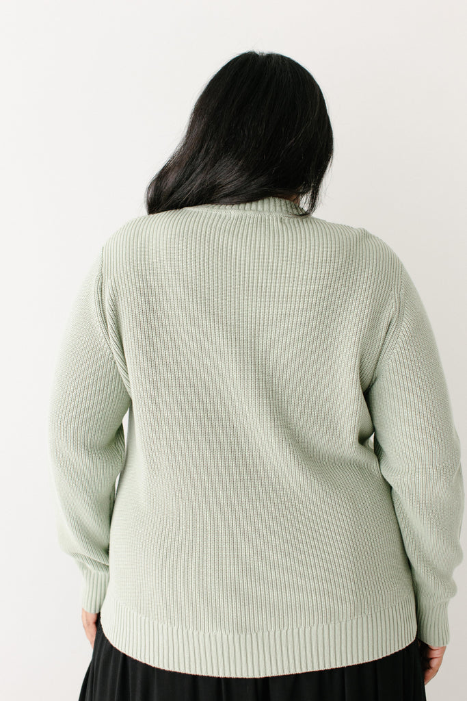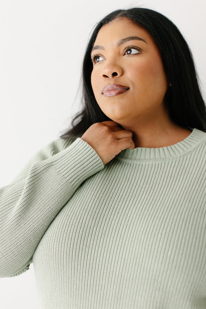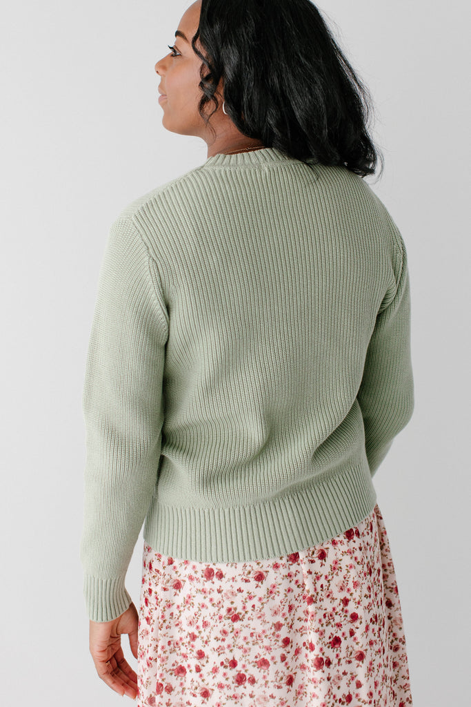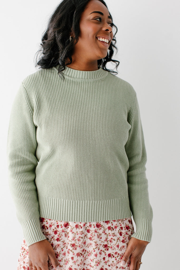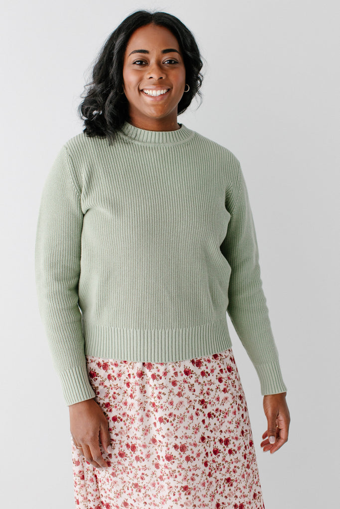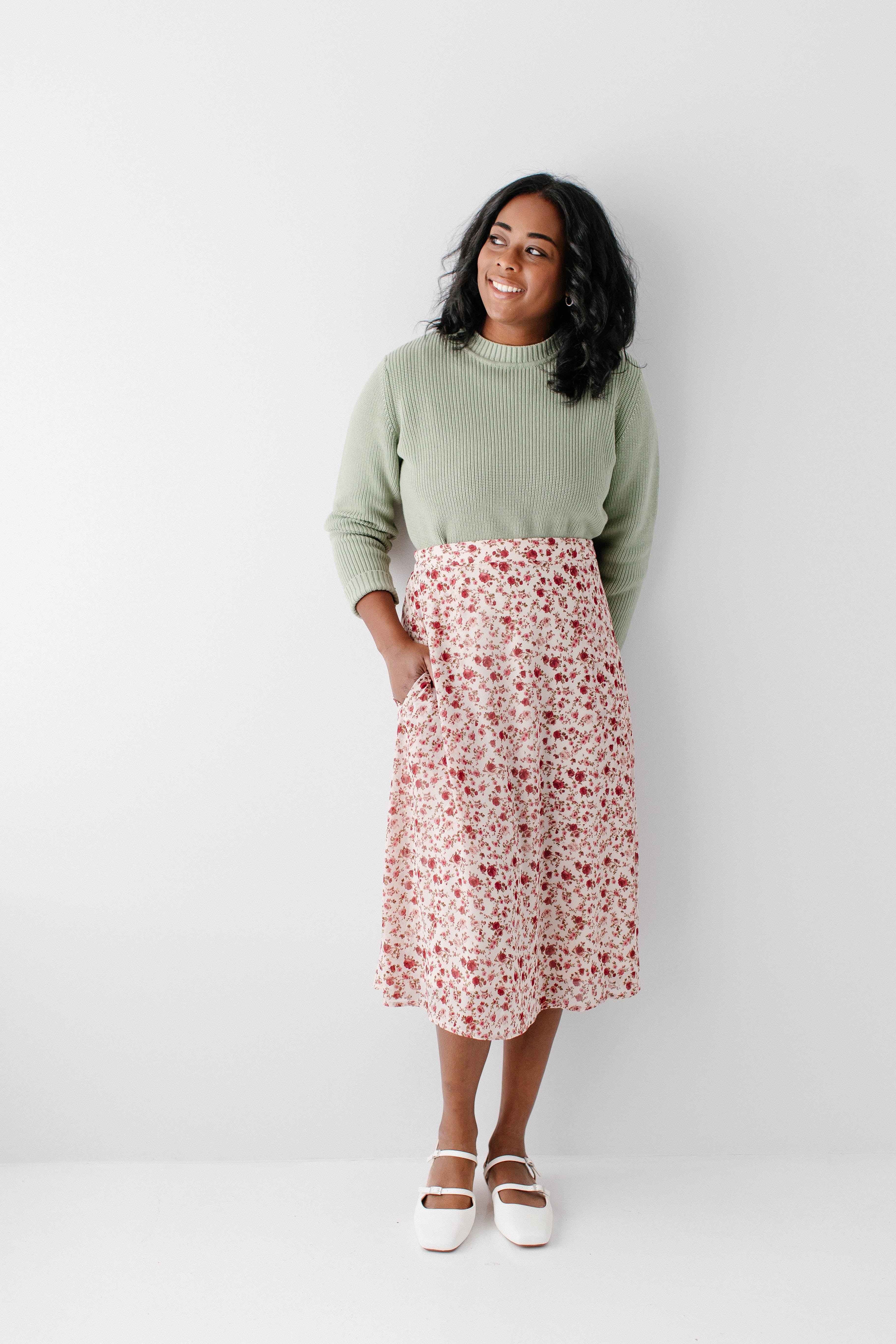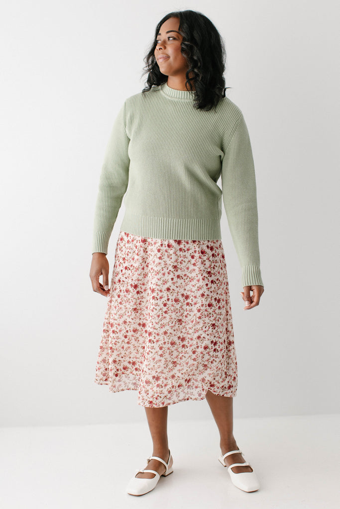 Model wearing the 'Hemingway' Cotton Fisherman Sweater with the 'Annette' Rose Print Midi Skirt in Blush