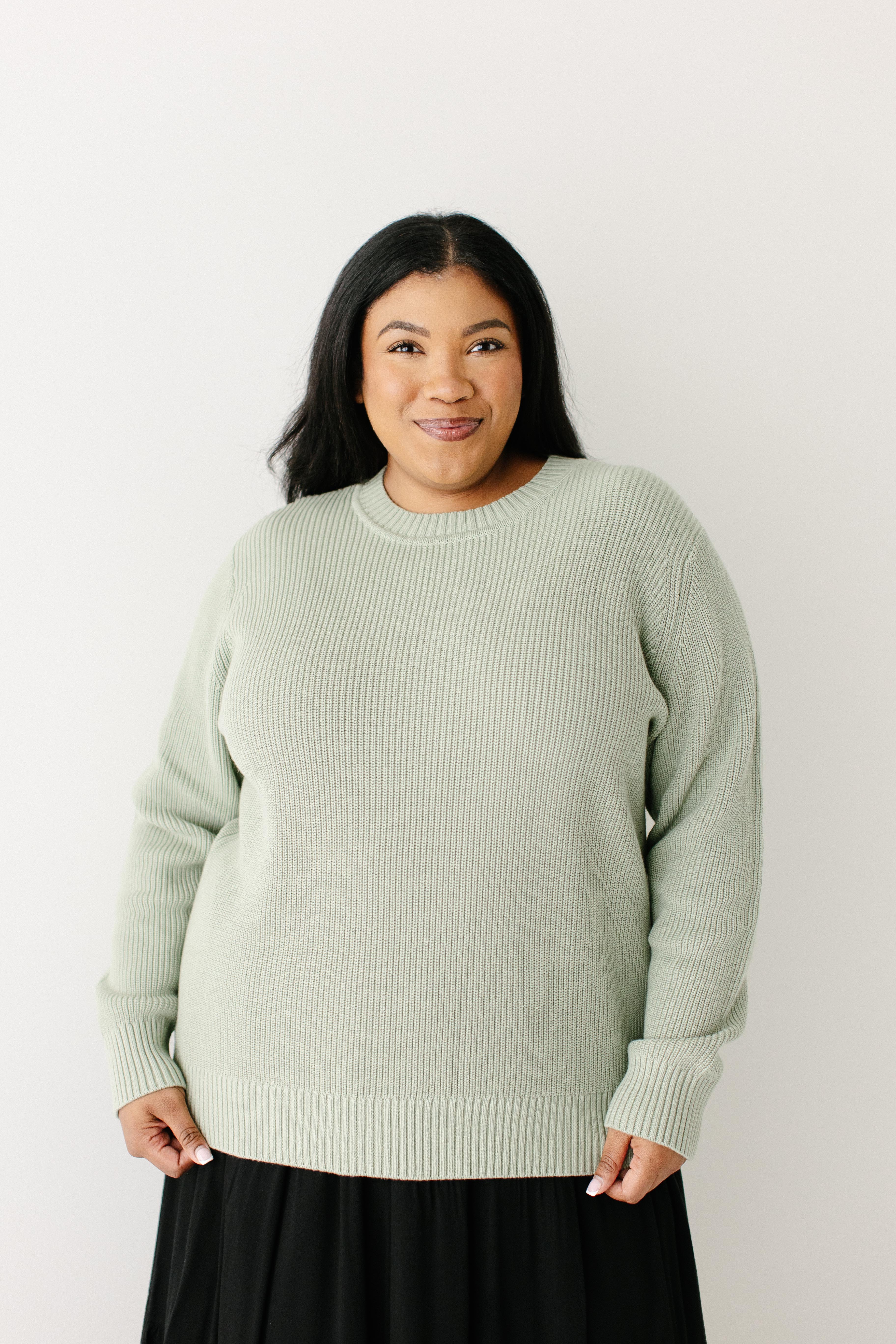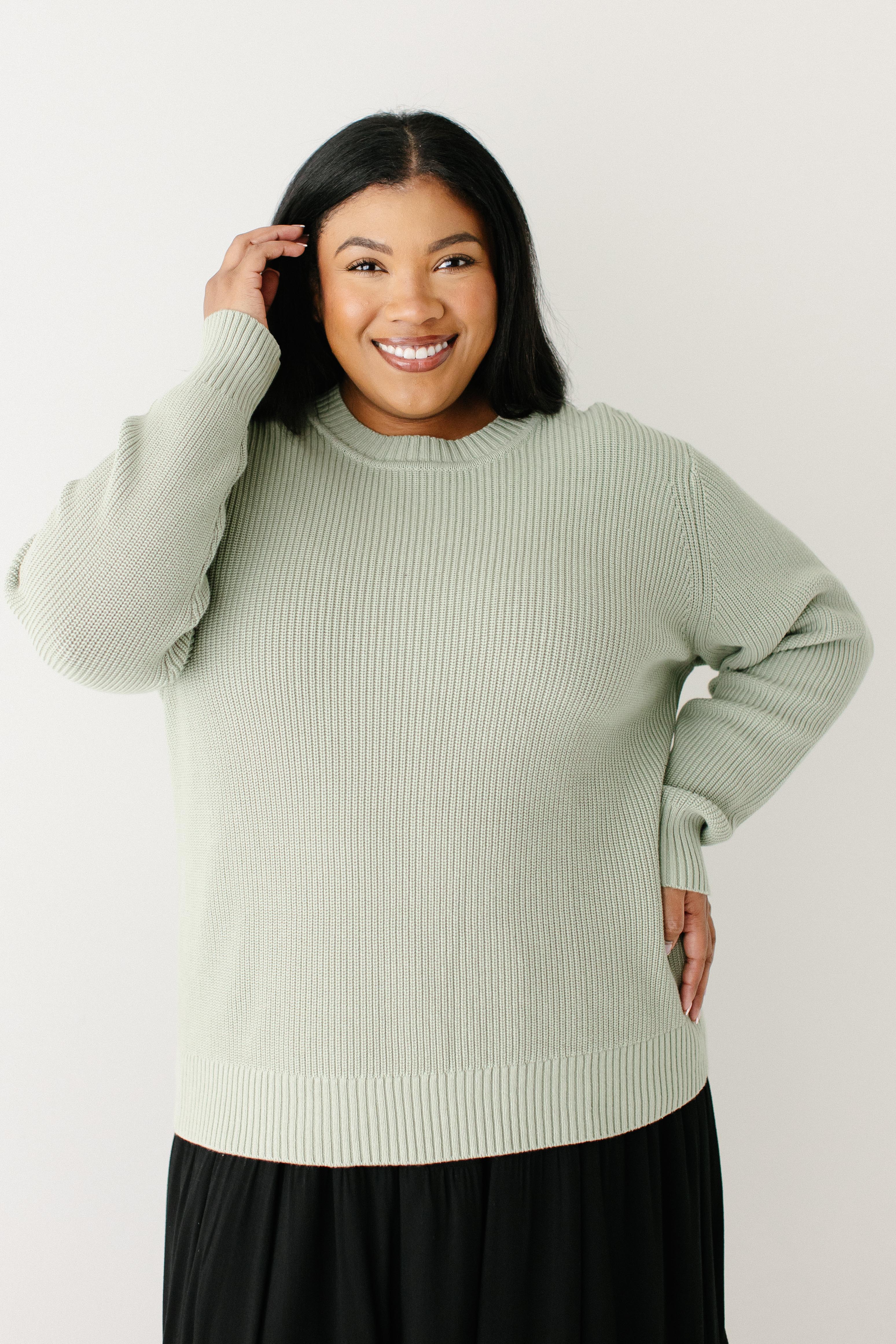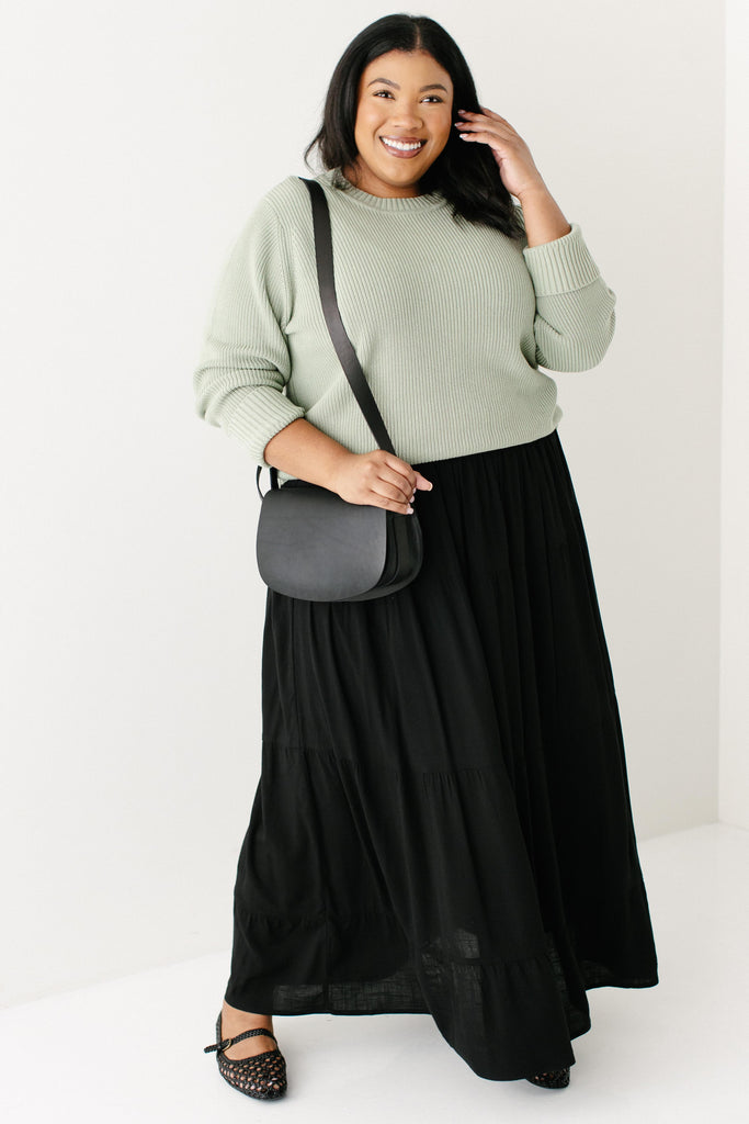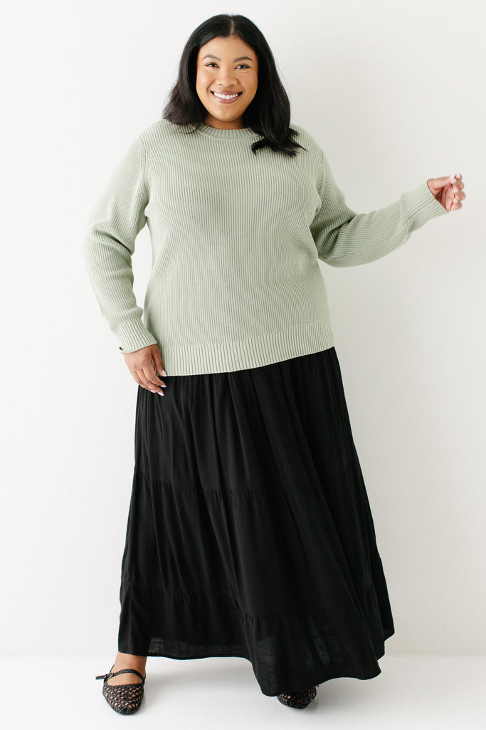Model wearing the 'Hemingway' Cotton Fisherman Sweater with the 'Addison' Tiered Maxi Skirt
