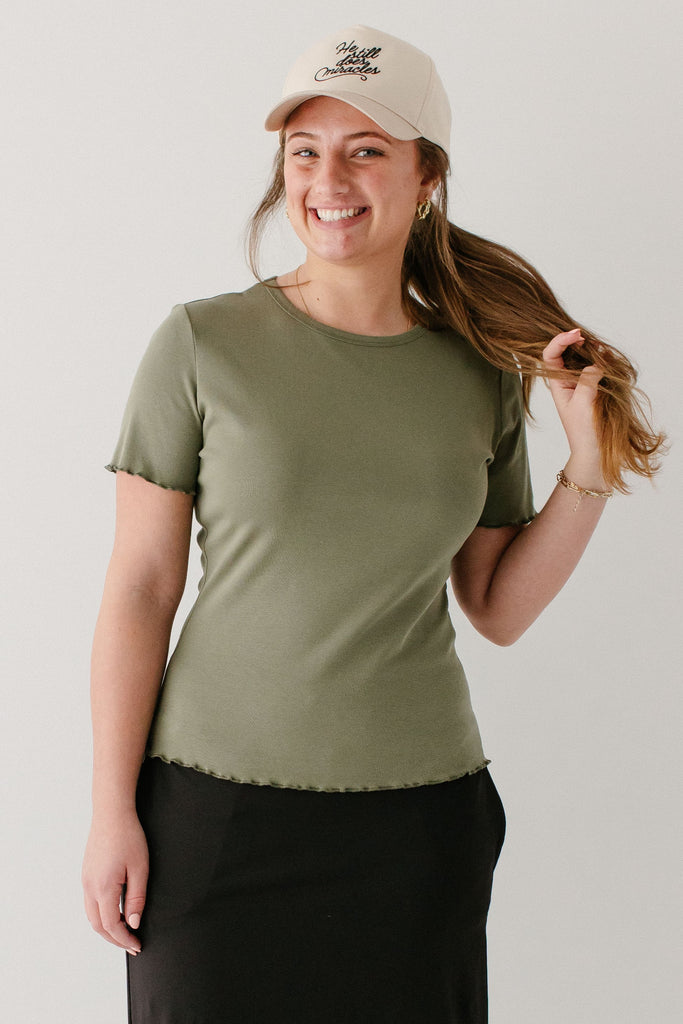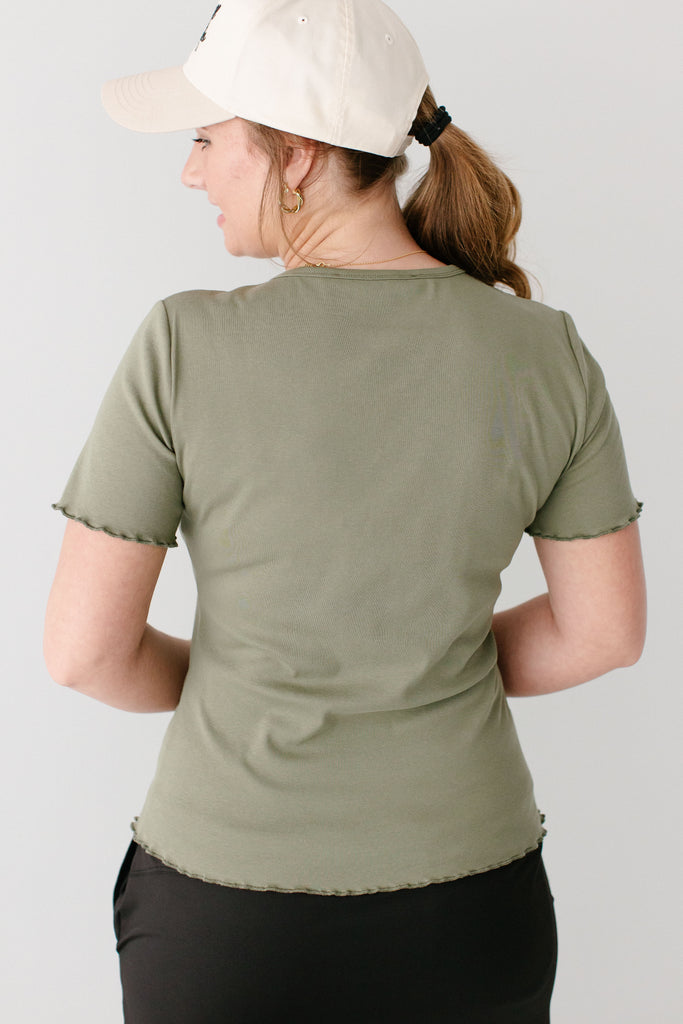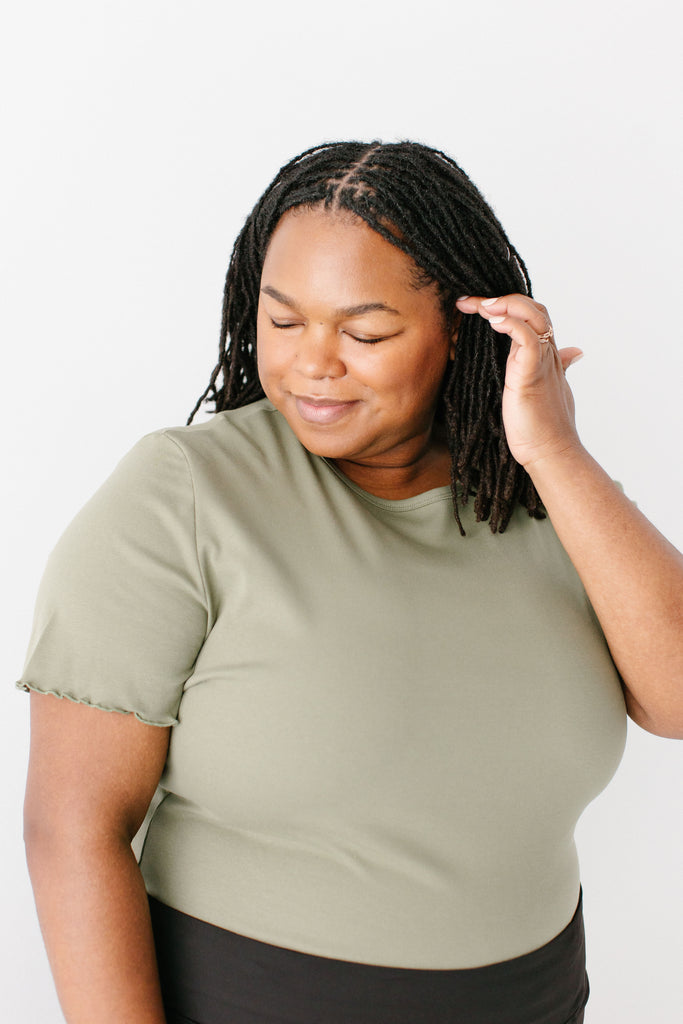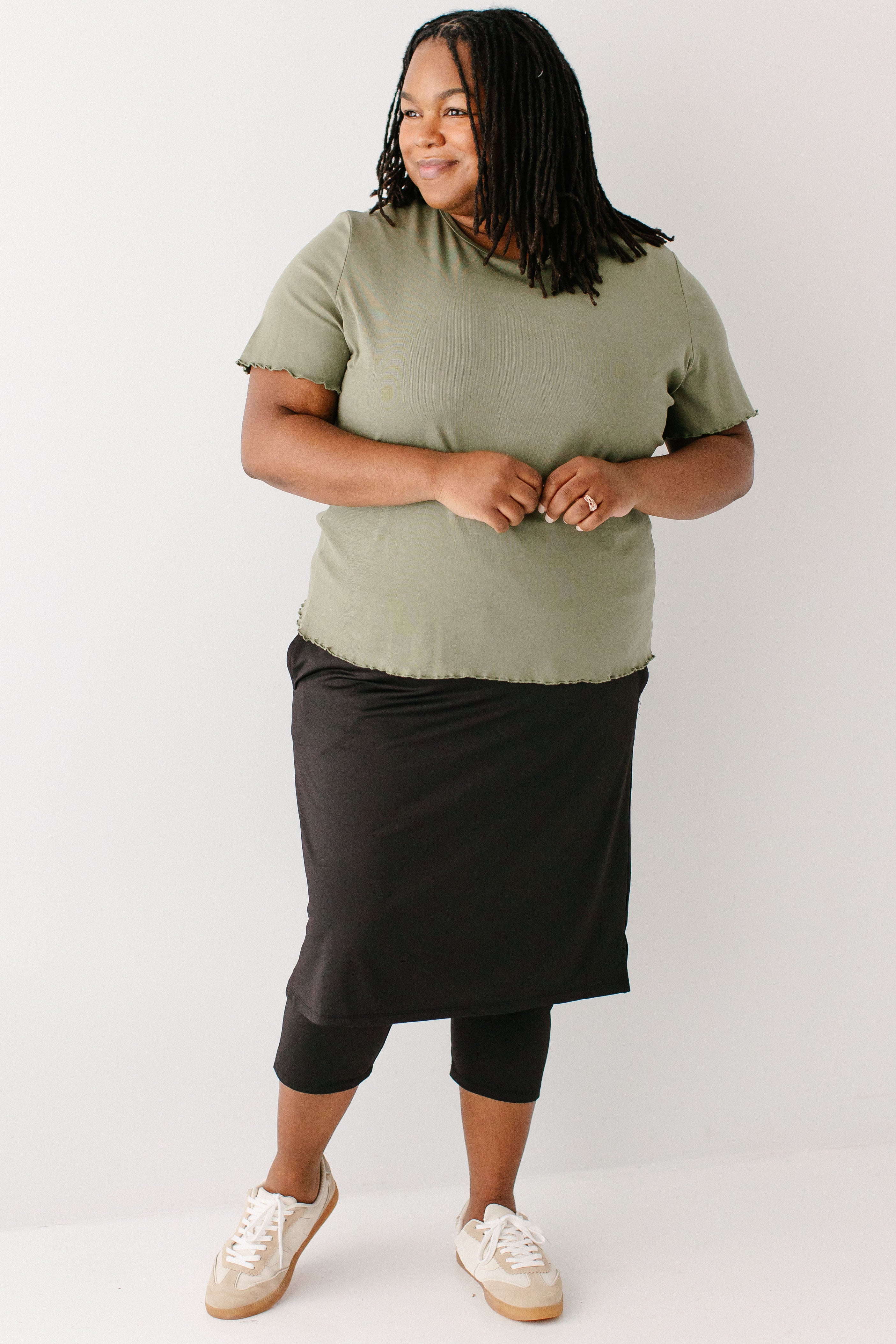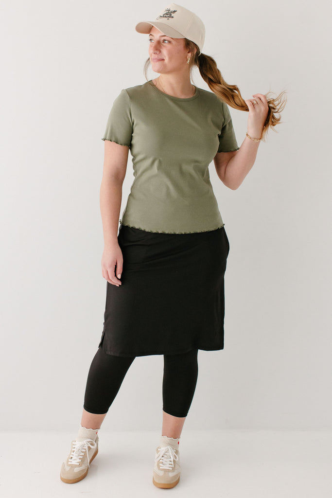 Model wearing the 'Hillary' Lettuce Hem Top in Olive with the 'Jessica' 3/4 Leggings Skort