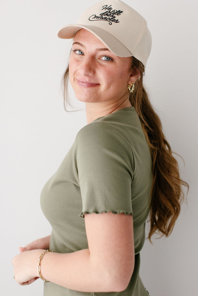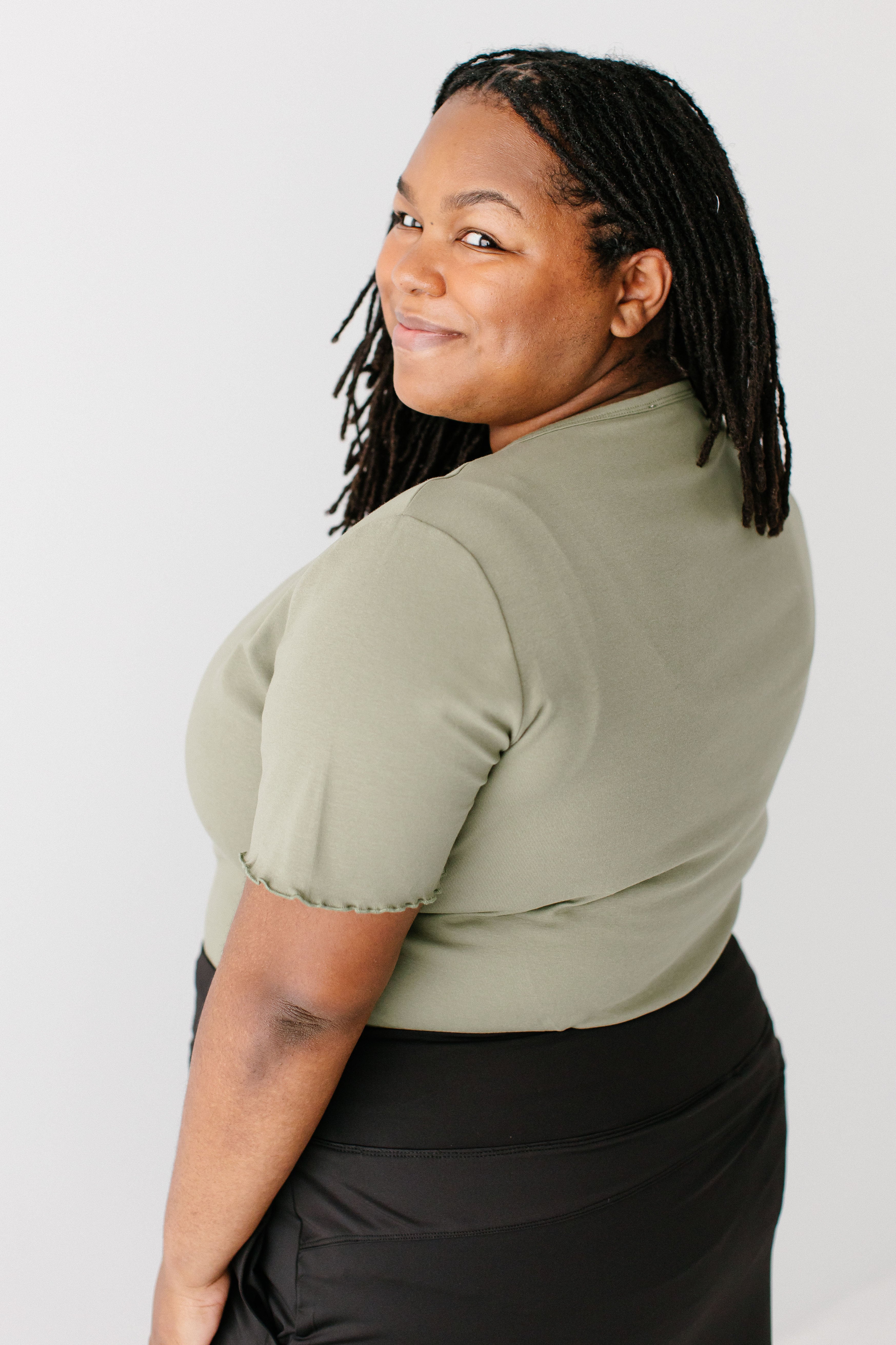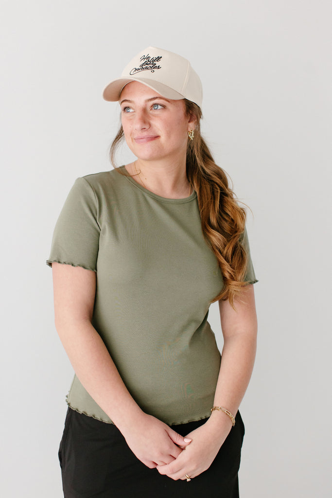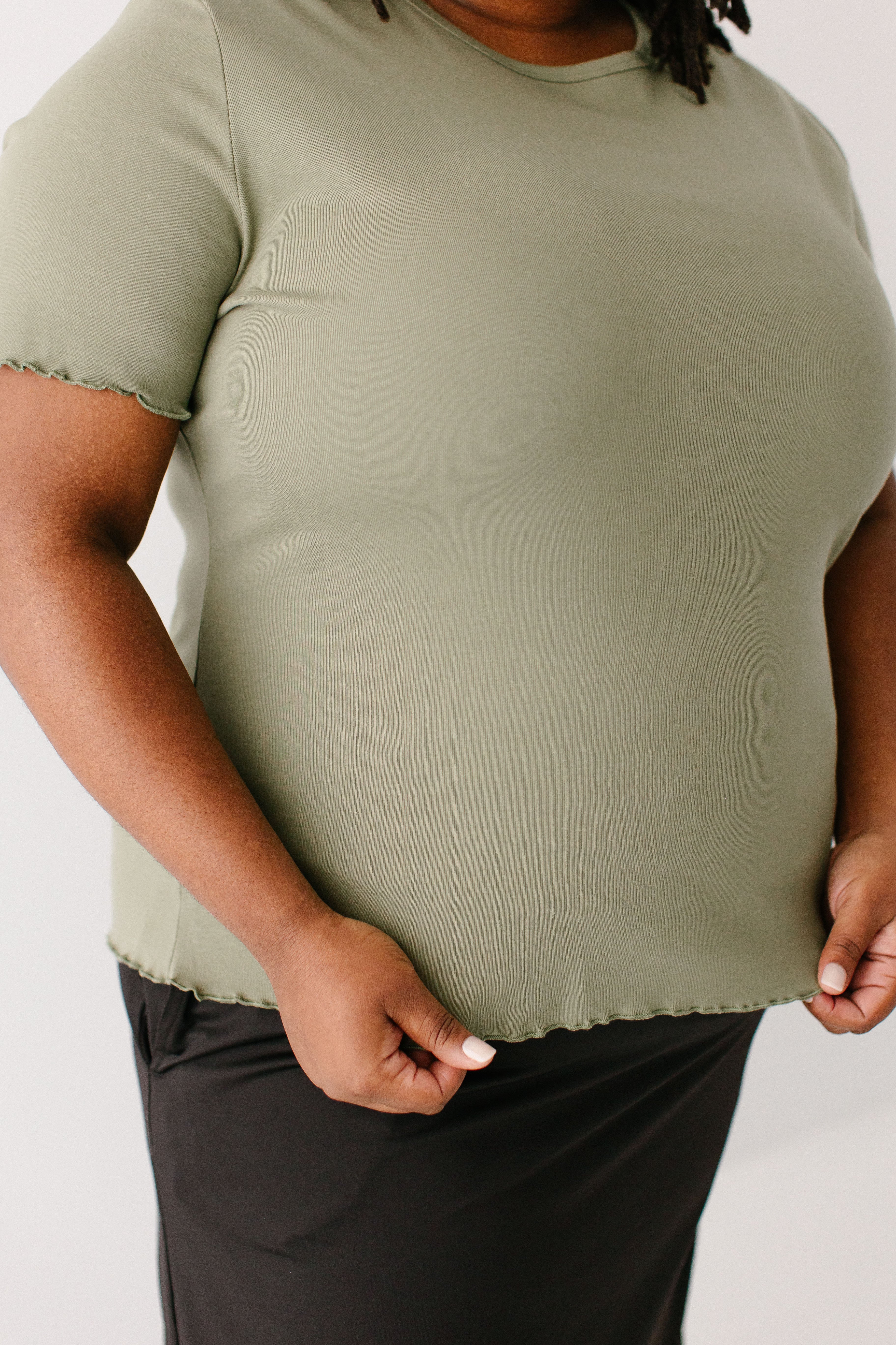 Model wearing the 'Hillary' Lettuce Hem Top in Olive with the 'Jessica' 3/4 Leggings Skort
