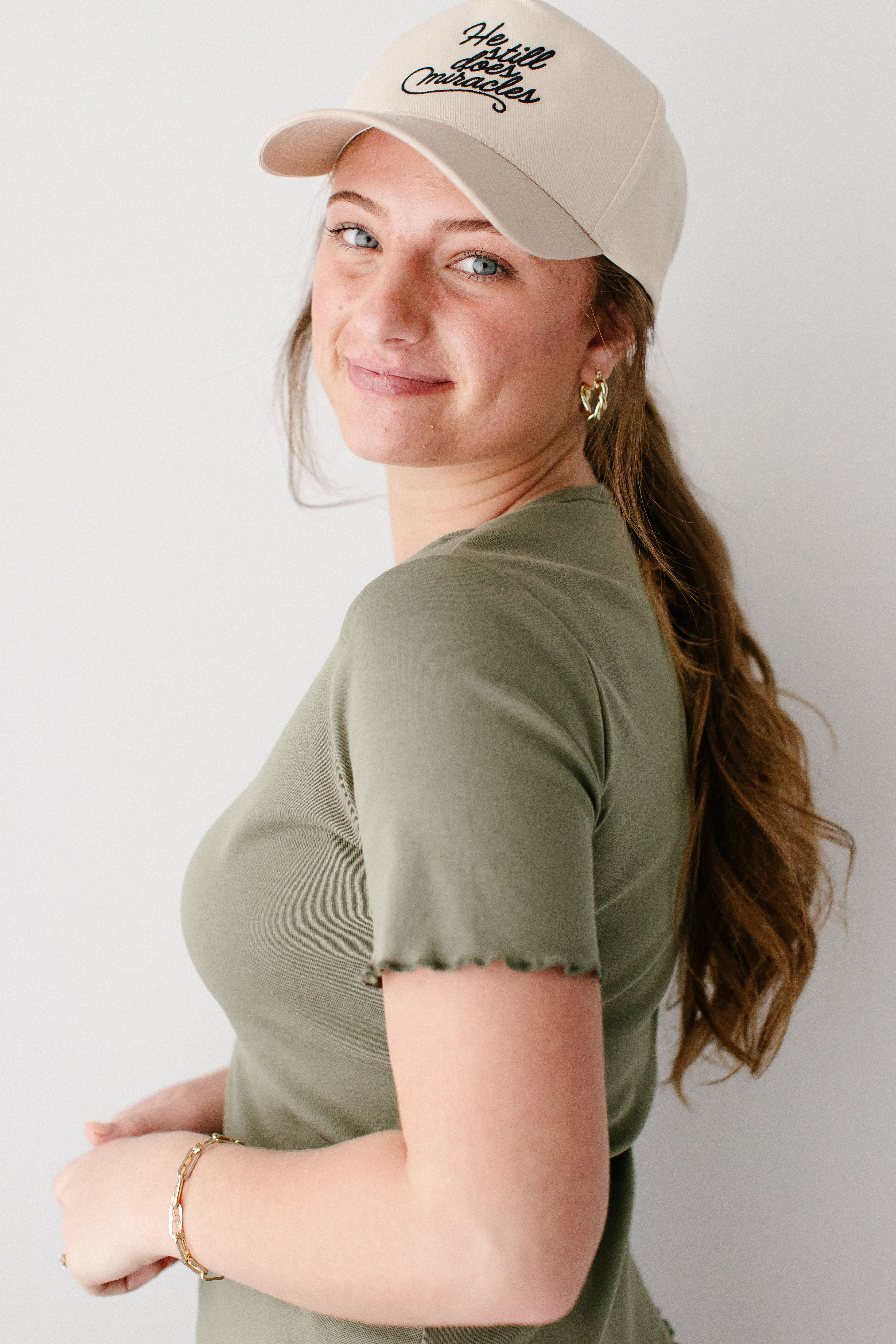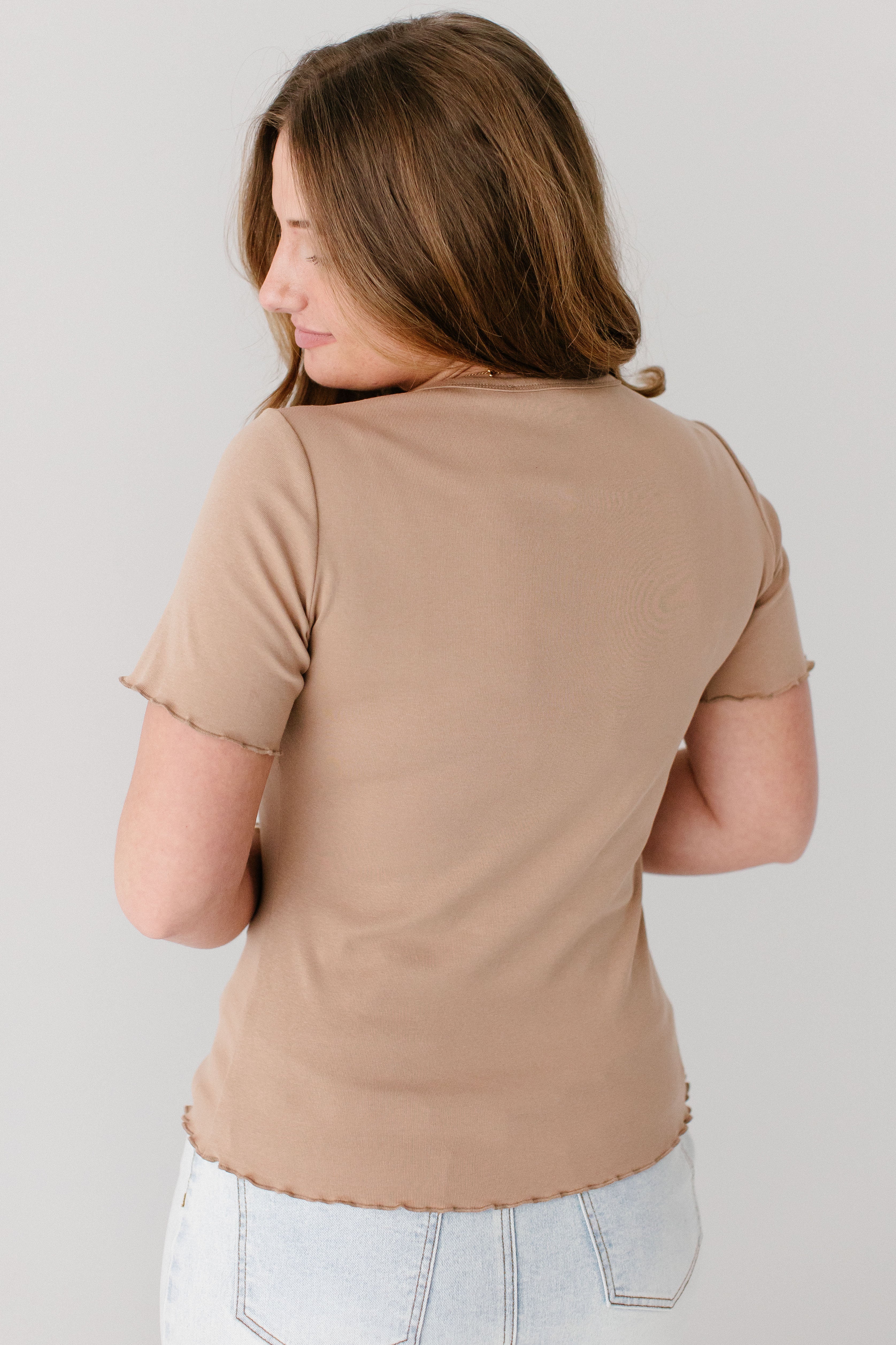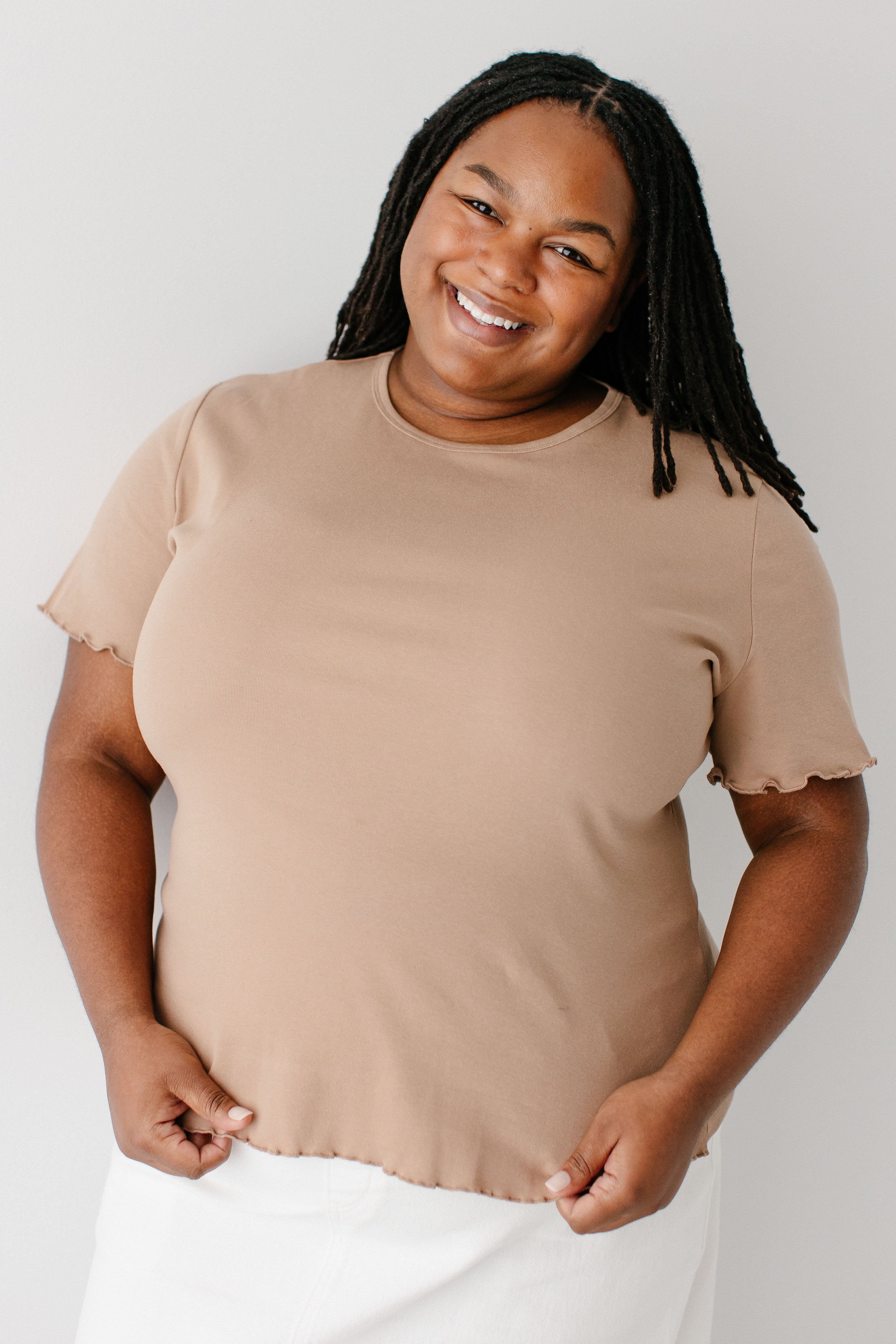 Model wearing the 'Hillary' Lettuce Hem Top in Tan with the ‘Margaret' Stretch Denim Midi Skirt in Ivory (coming soon!)