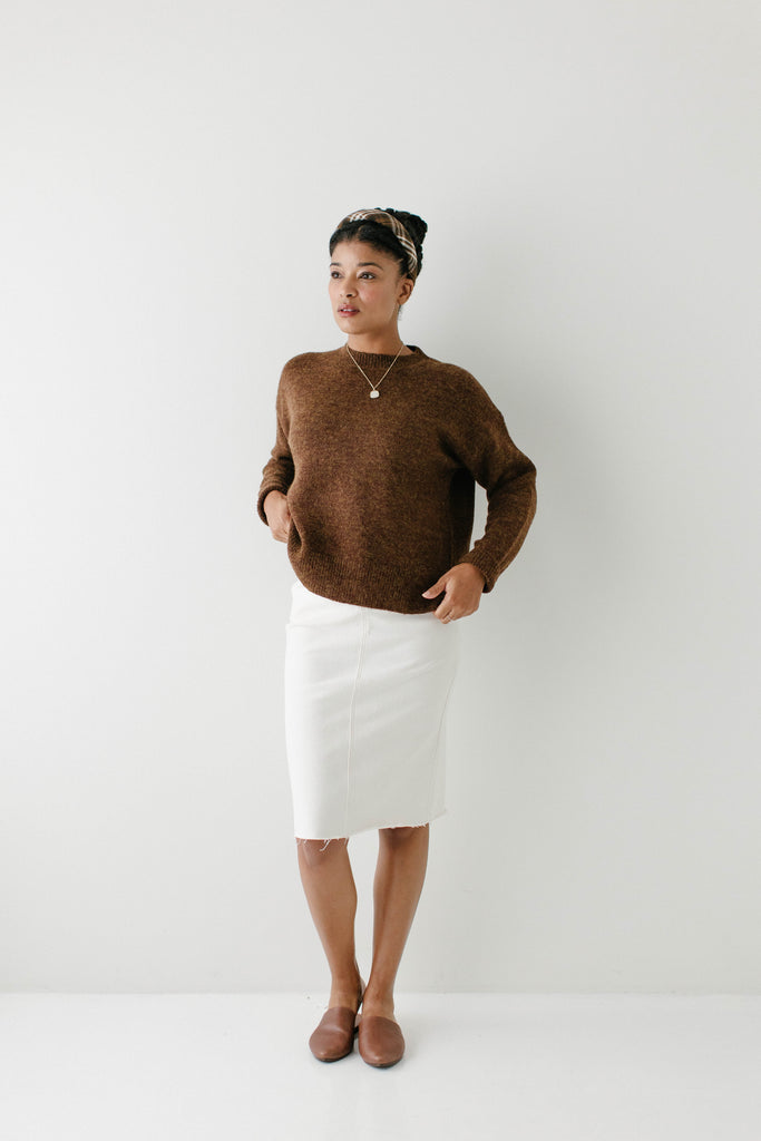 Model wearing the 'Ira' Marled Yarn Crewneck Sweater with the 'Parker' High Waist Raw Edge Denim Skirt in Alabaster