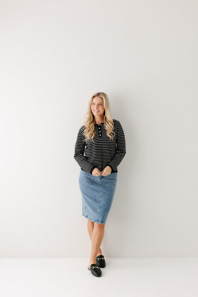 Model wearing the 'Isak' Pinstripe Polo Sweater Top with the 'Sonya' Patch Pocket Stretch Denim Skirt