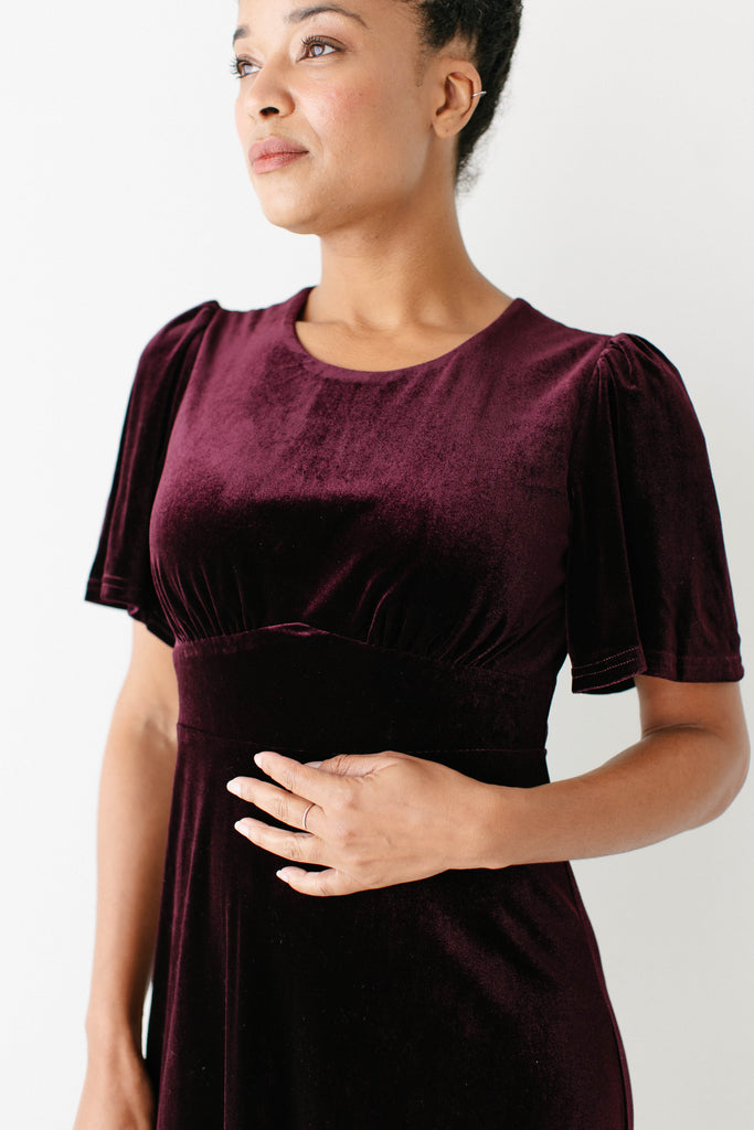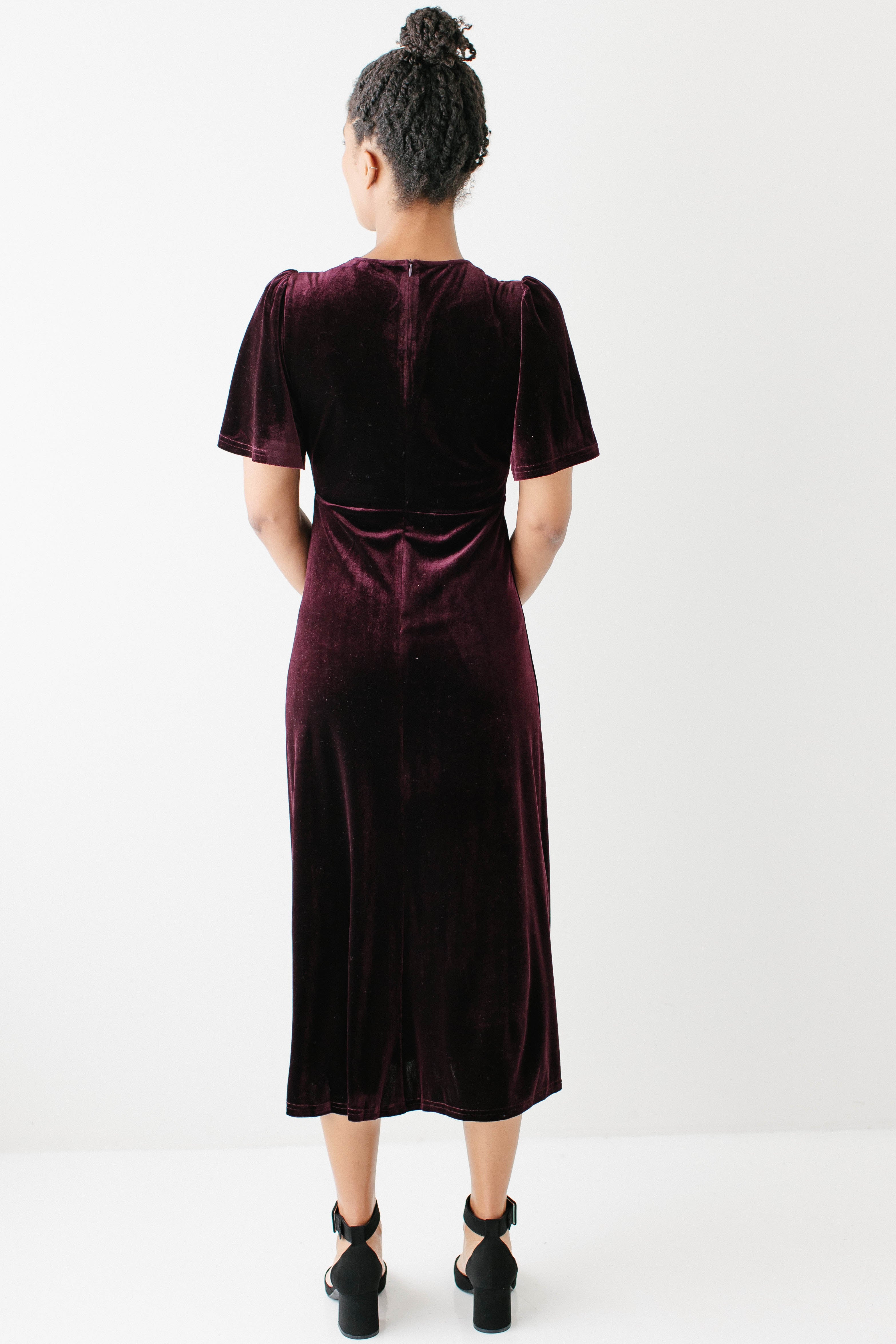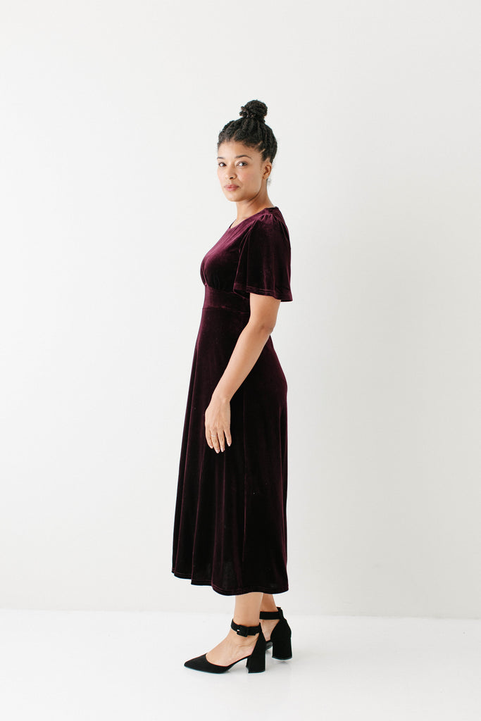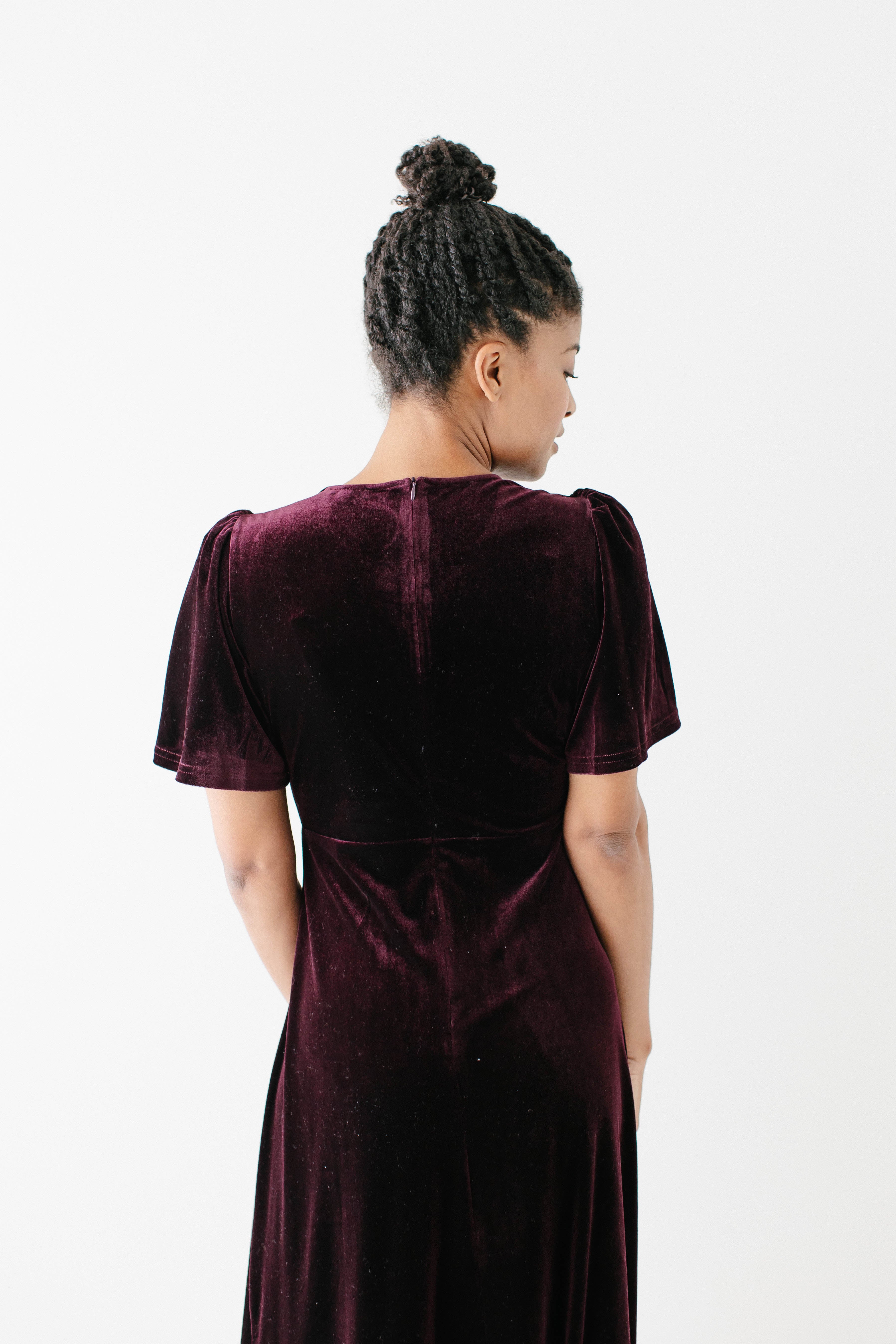 Introducing the 'Isolde' Fit & Flare Velvet Midi Dress! This dress features classy flutter sleeves, stretch velvet fabric, subtle a-line silhouette, and a deep wine color for your fall and winter festivities. The ‘Isolde’ is perfect for your next date night, pair with your favorite classy heels and a clutch bag!