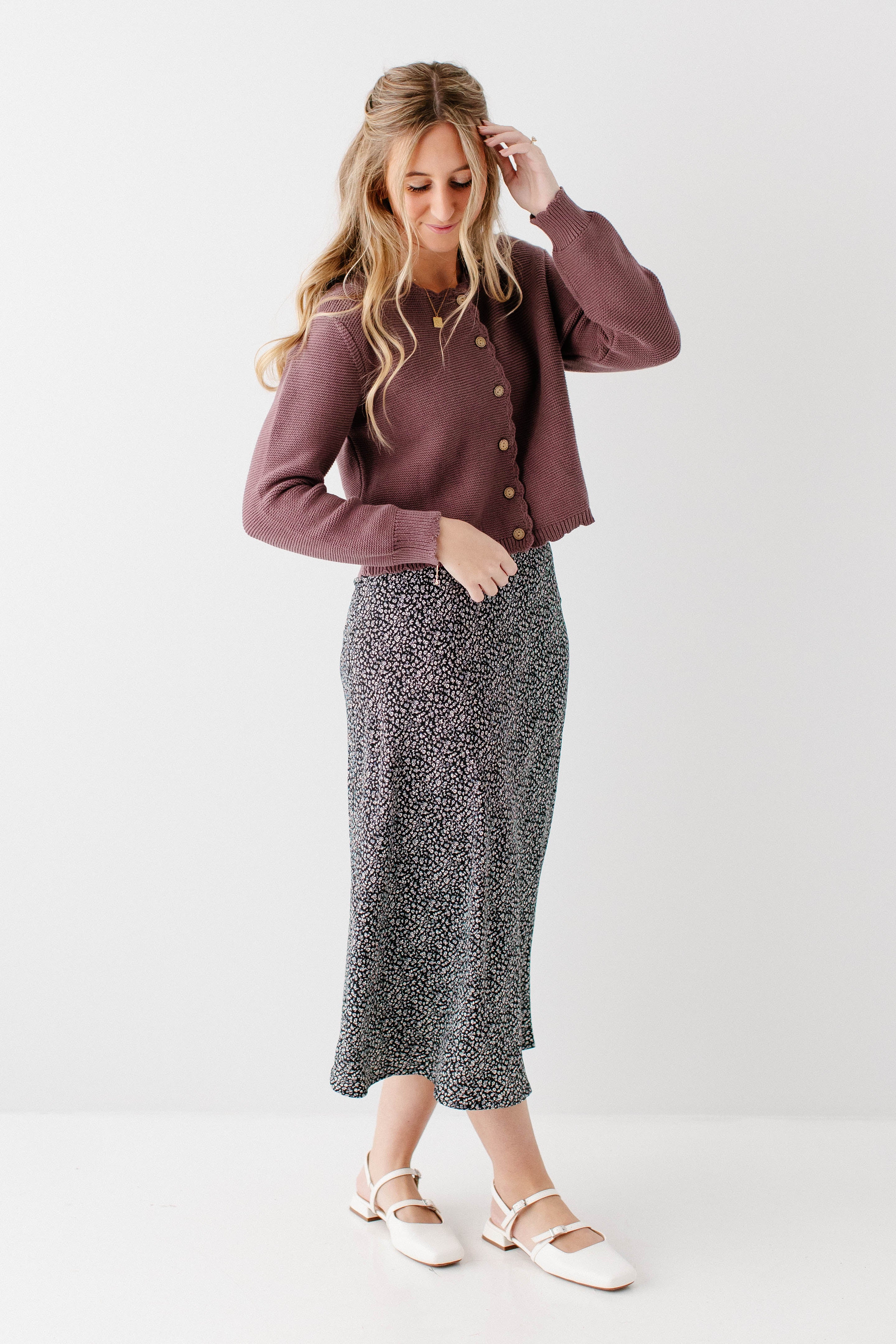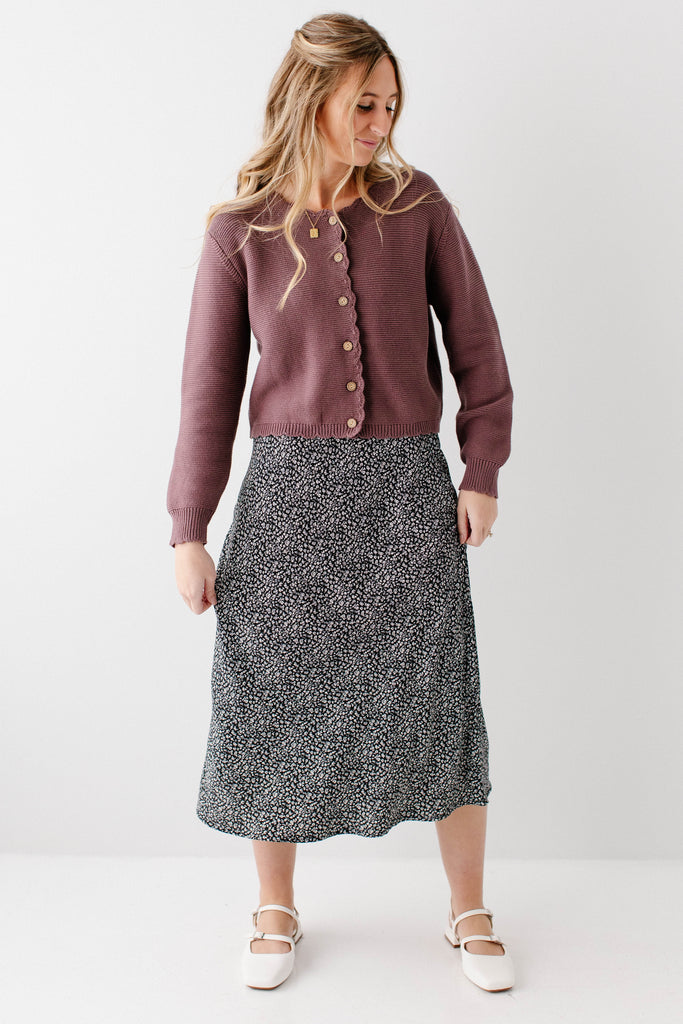Model wearing the 'Cherie' Scallop Edge Cardigan with the 'Jacinta' Ditsy Floral Slip Skirt