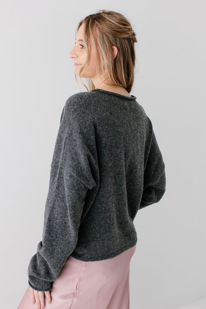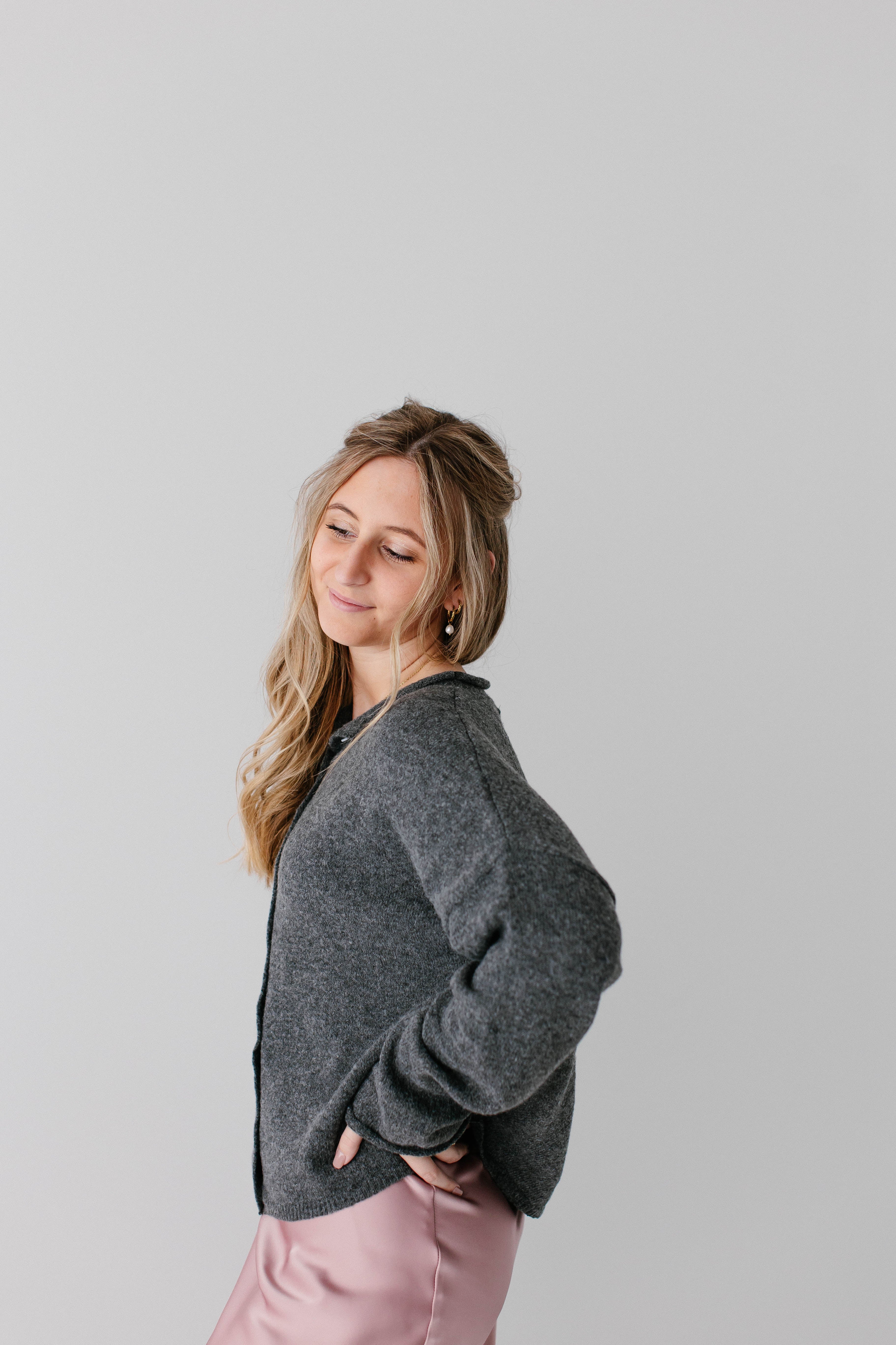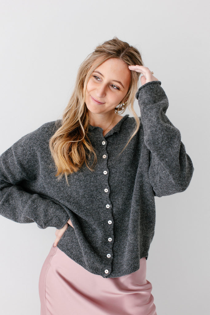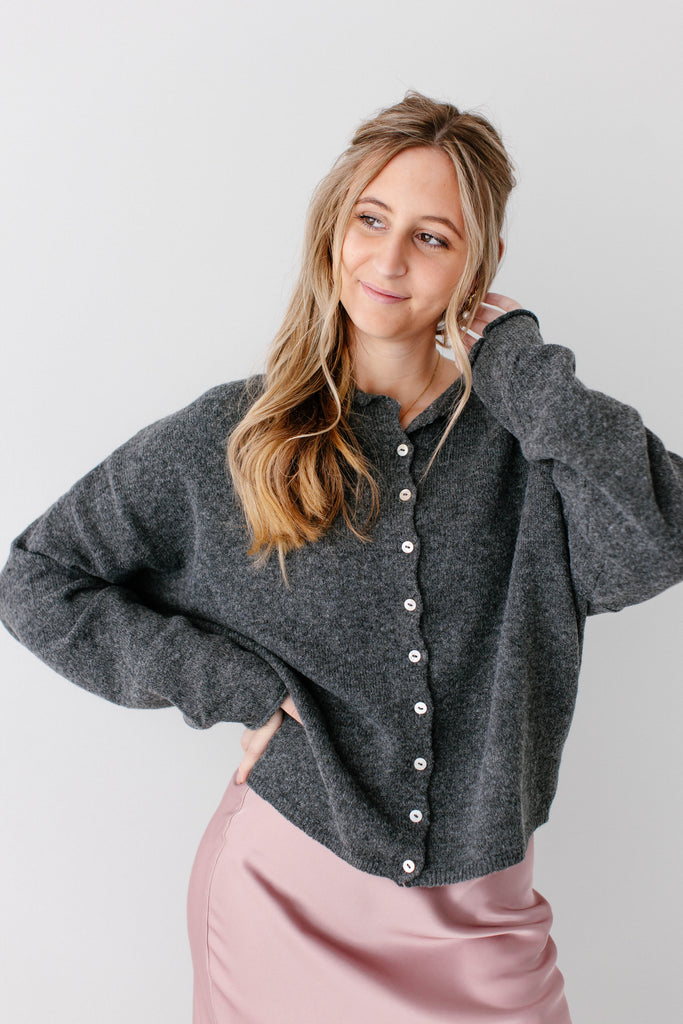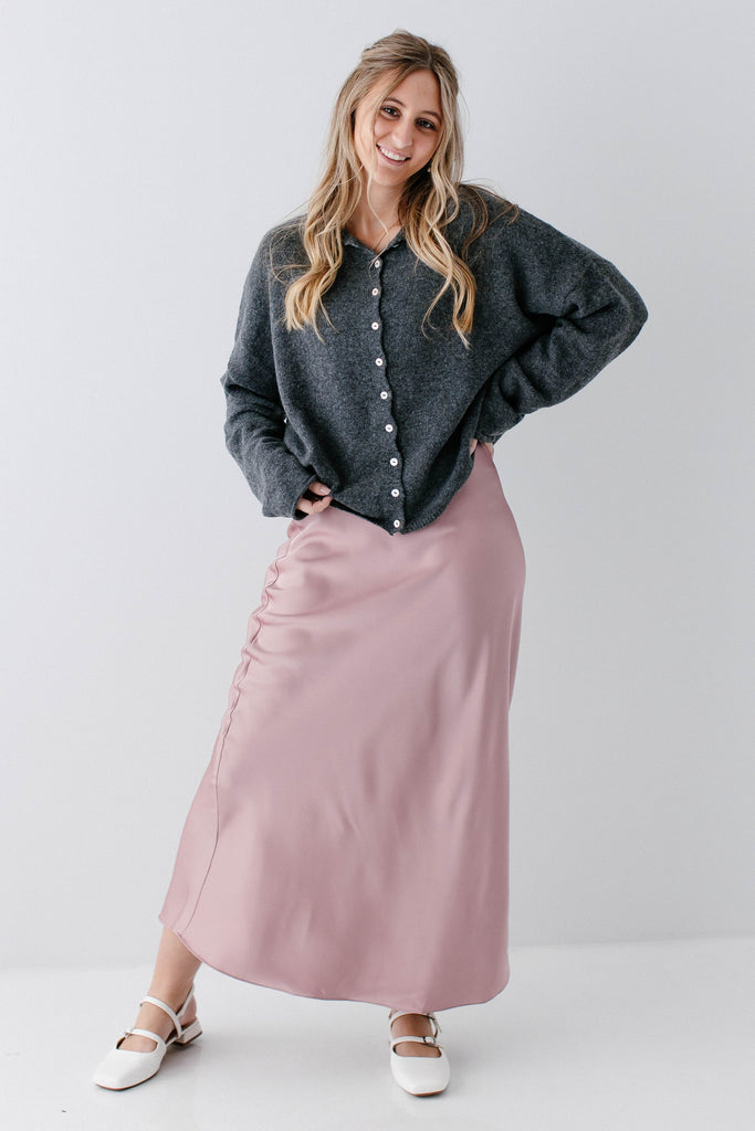 Model in charcoal wearing the 'Jacqueline' Button Down Cardigan in charcoal with the 'Paris' Satin Slip Maxi Skirt