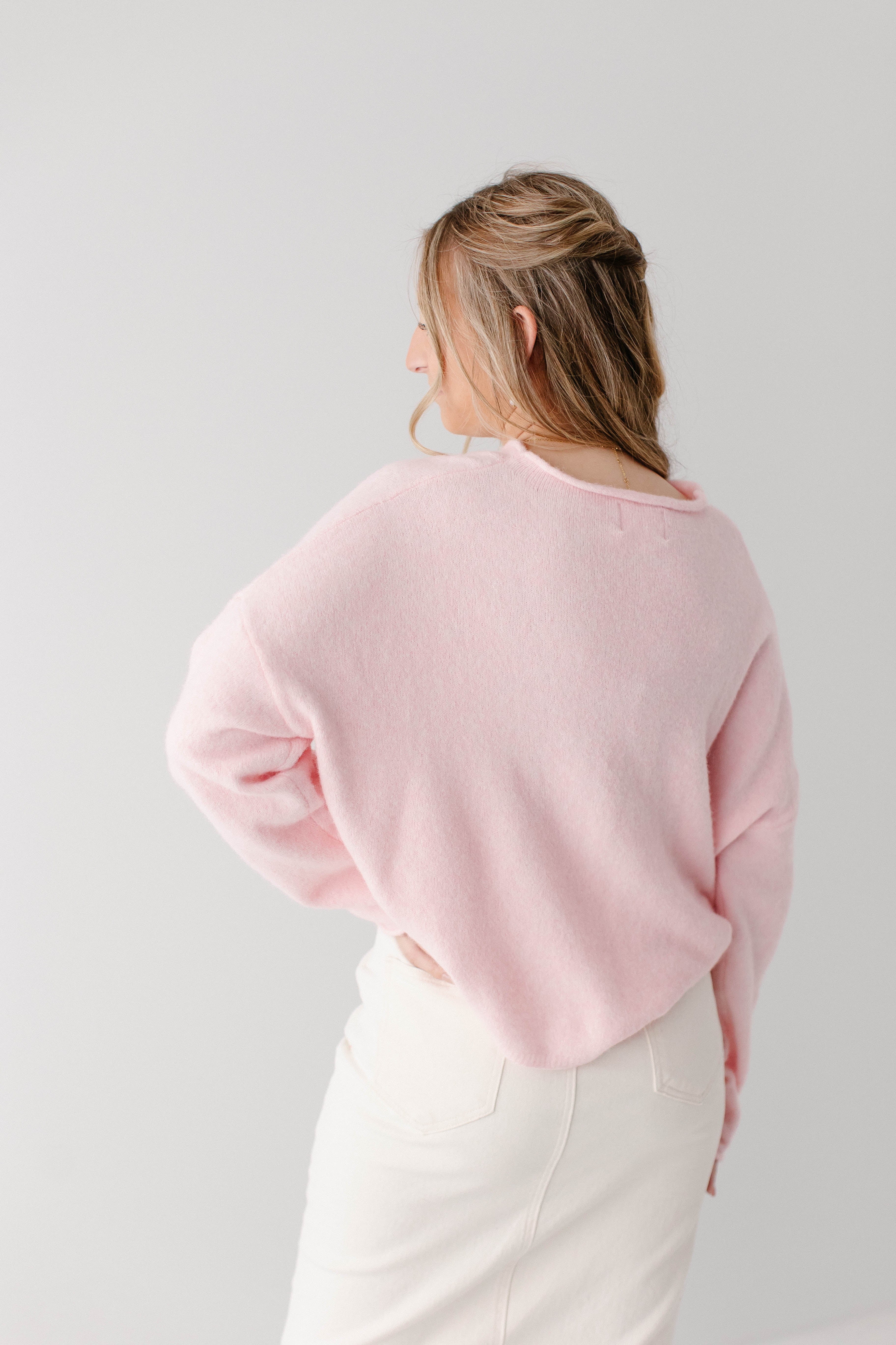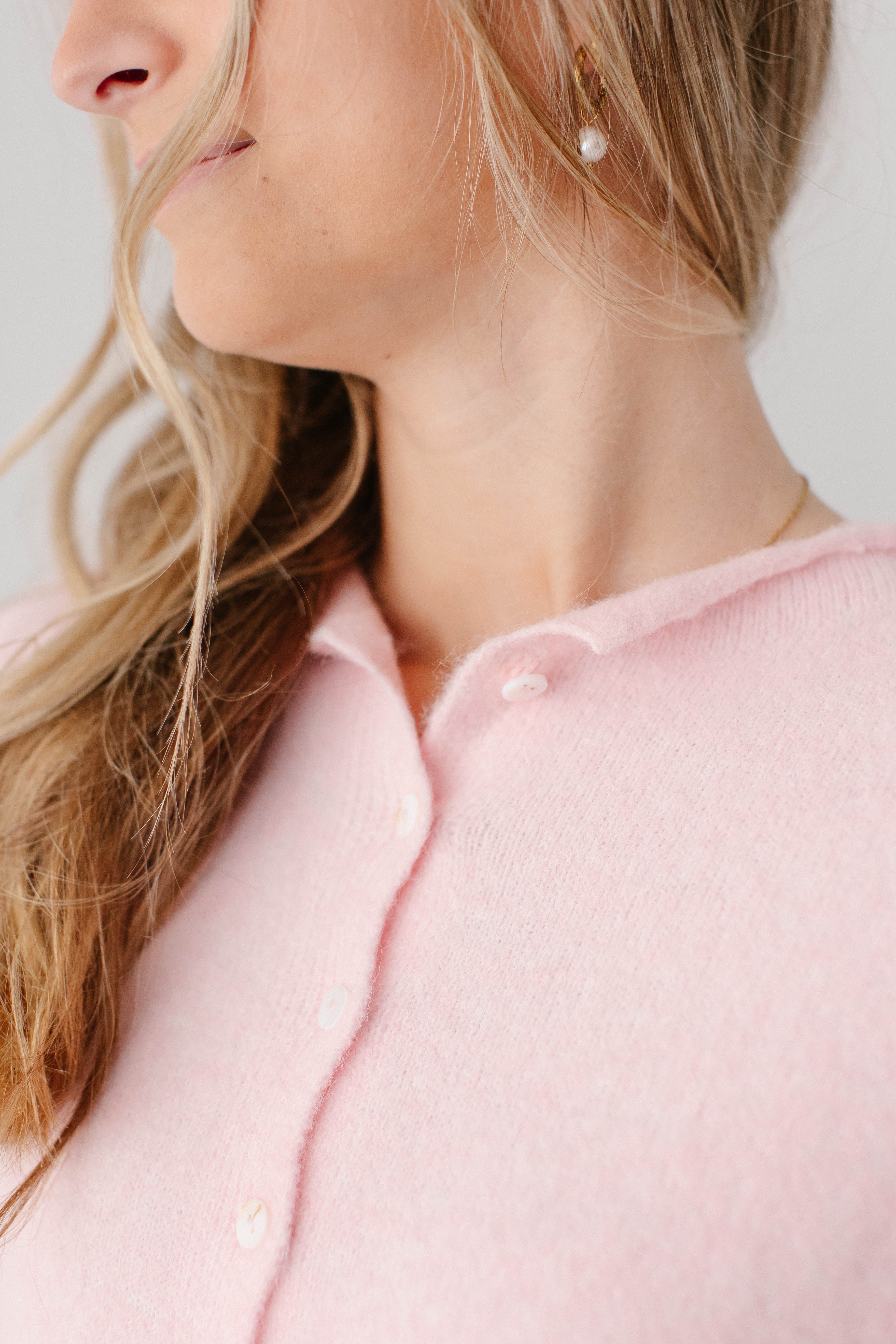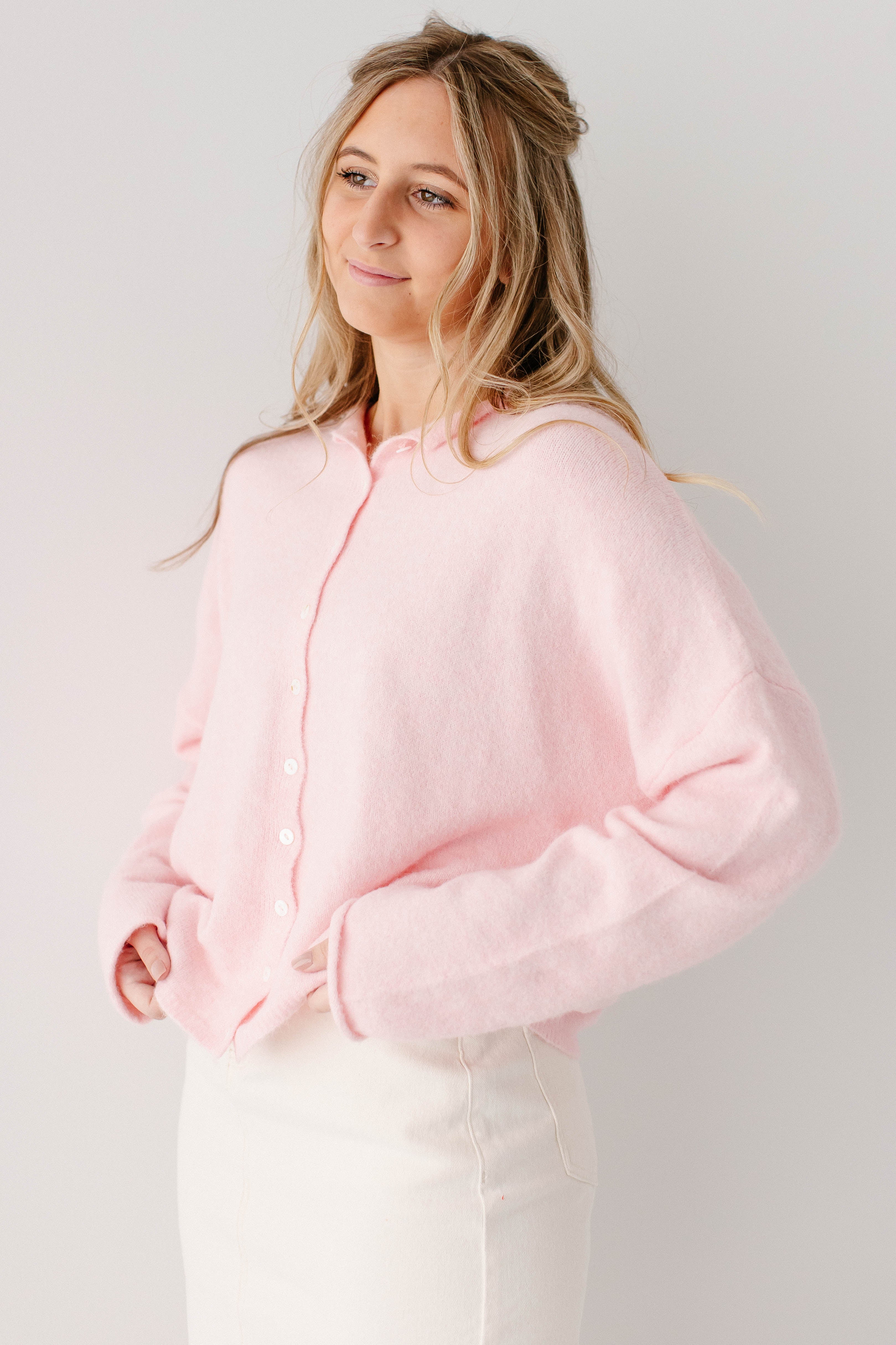Model in pink wearing the 'Jacqueline' Button Down Cardigan in pink with the 'Parker' High Waist Raw Edge Denim Skirt in Alabaster