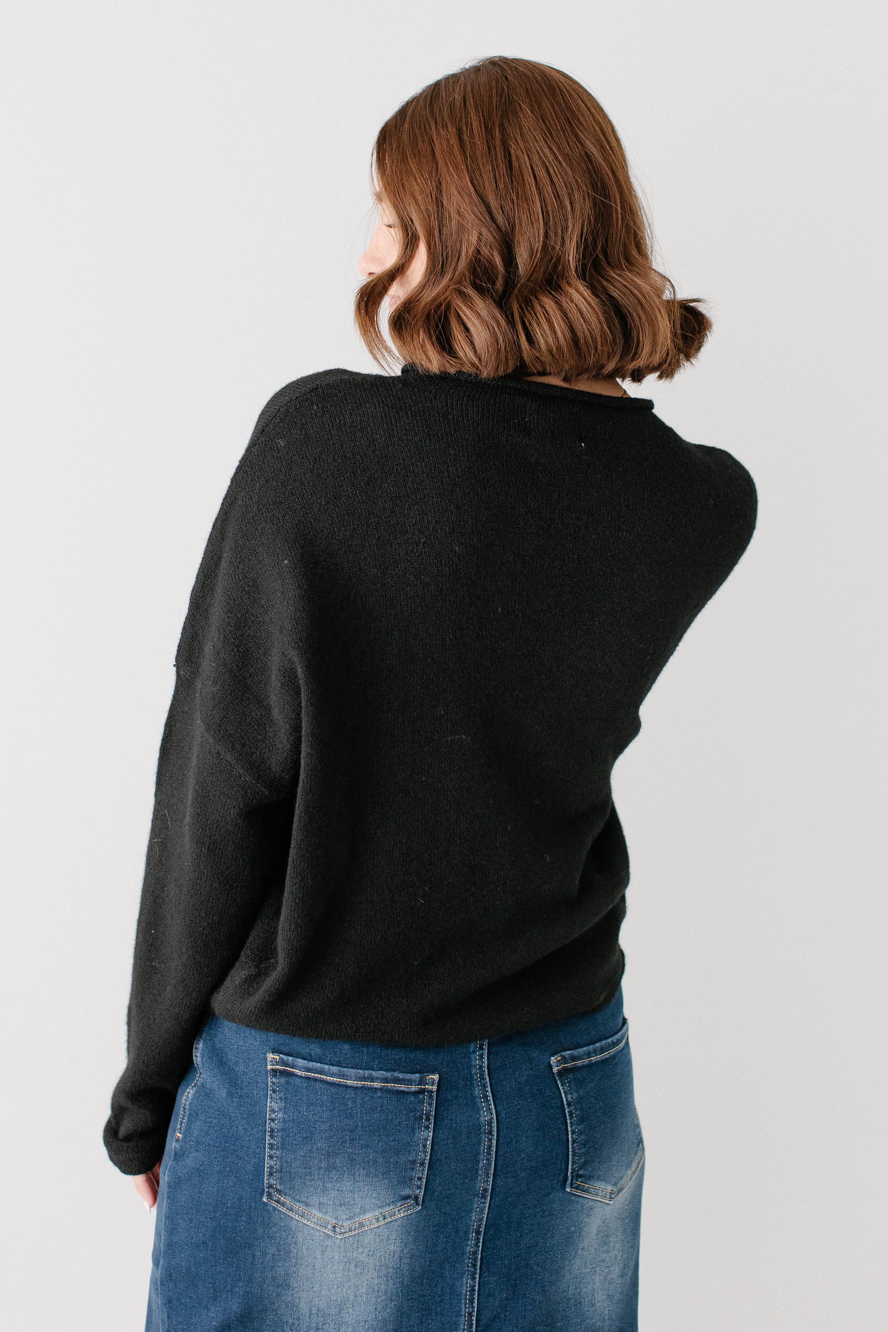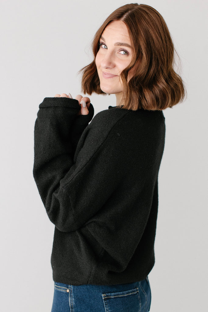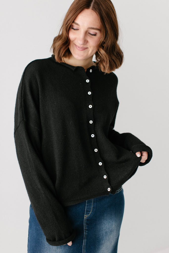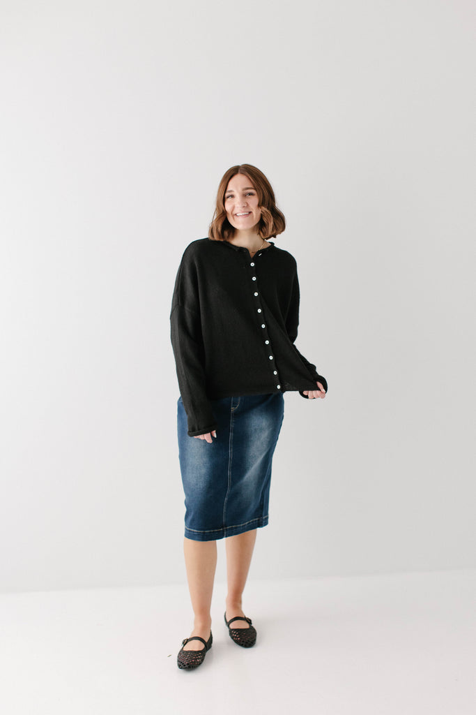 Model in black wearing the 'Jacqueline' Button Down Cardigan in black with the 'Sara' Classic Knee Length Dark Denim Skirt in 29"