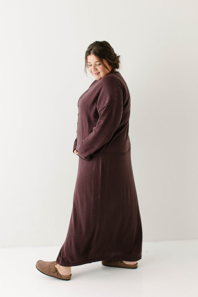 Model wearing the 'Jana' Drop Sleeve Cardigan with the 'Jana' Cotton Blend Midi Sweater Skirt