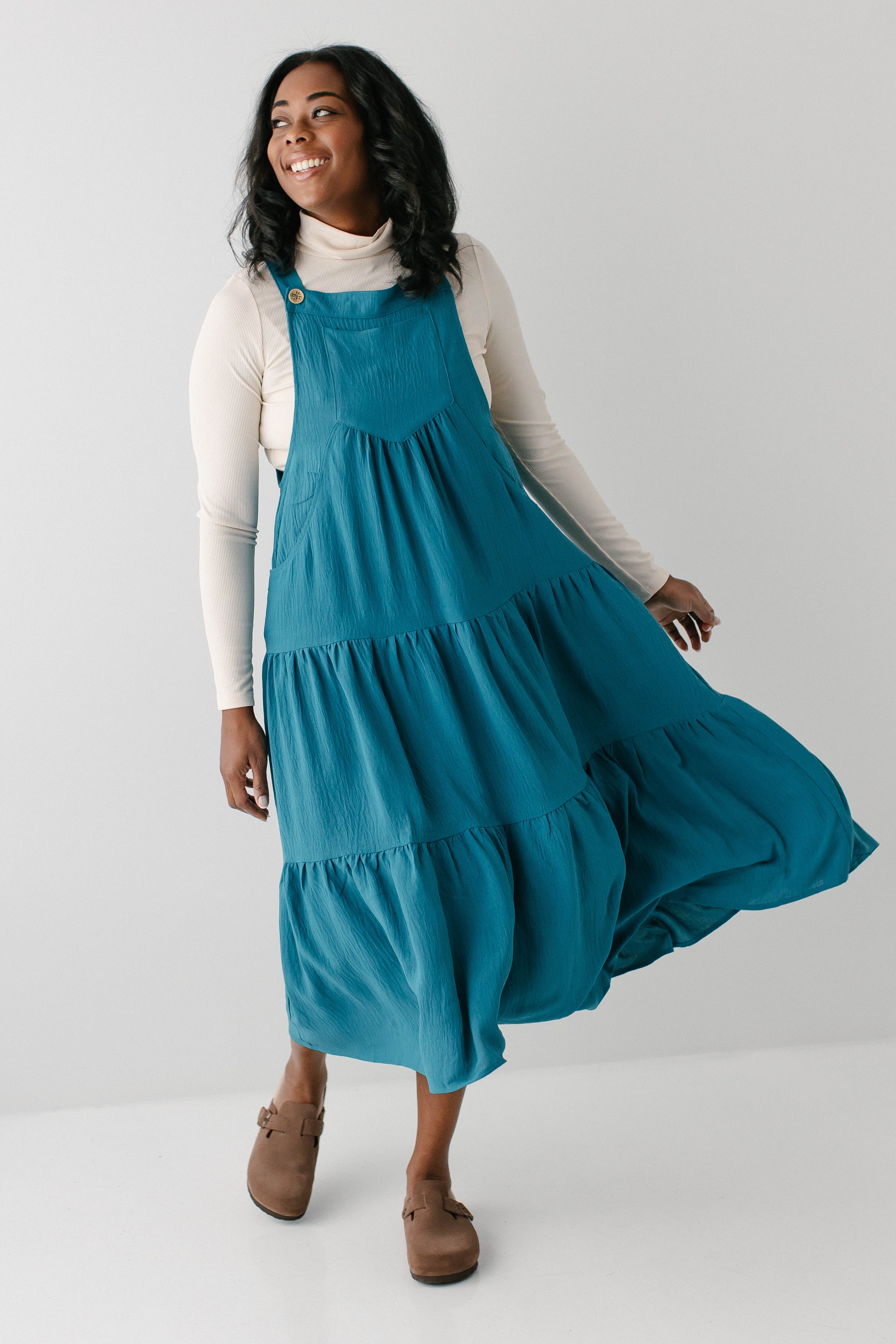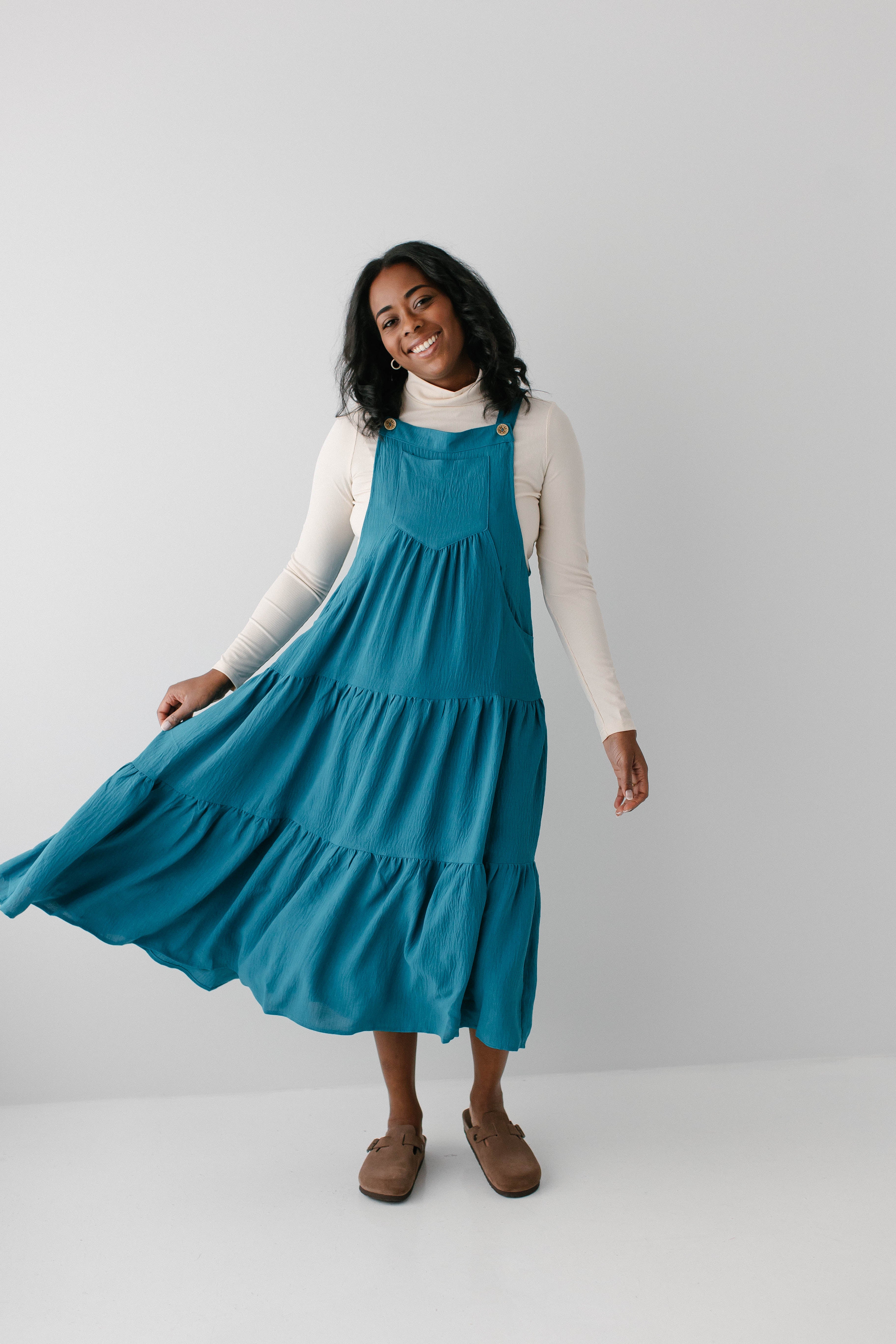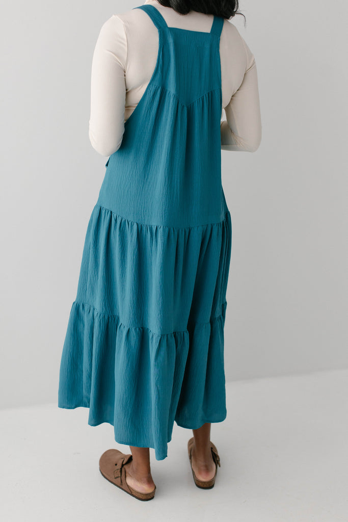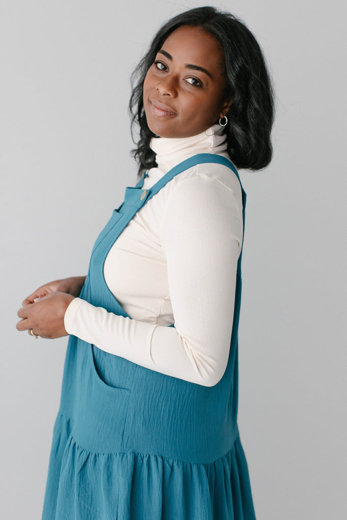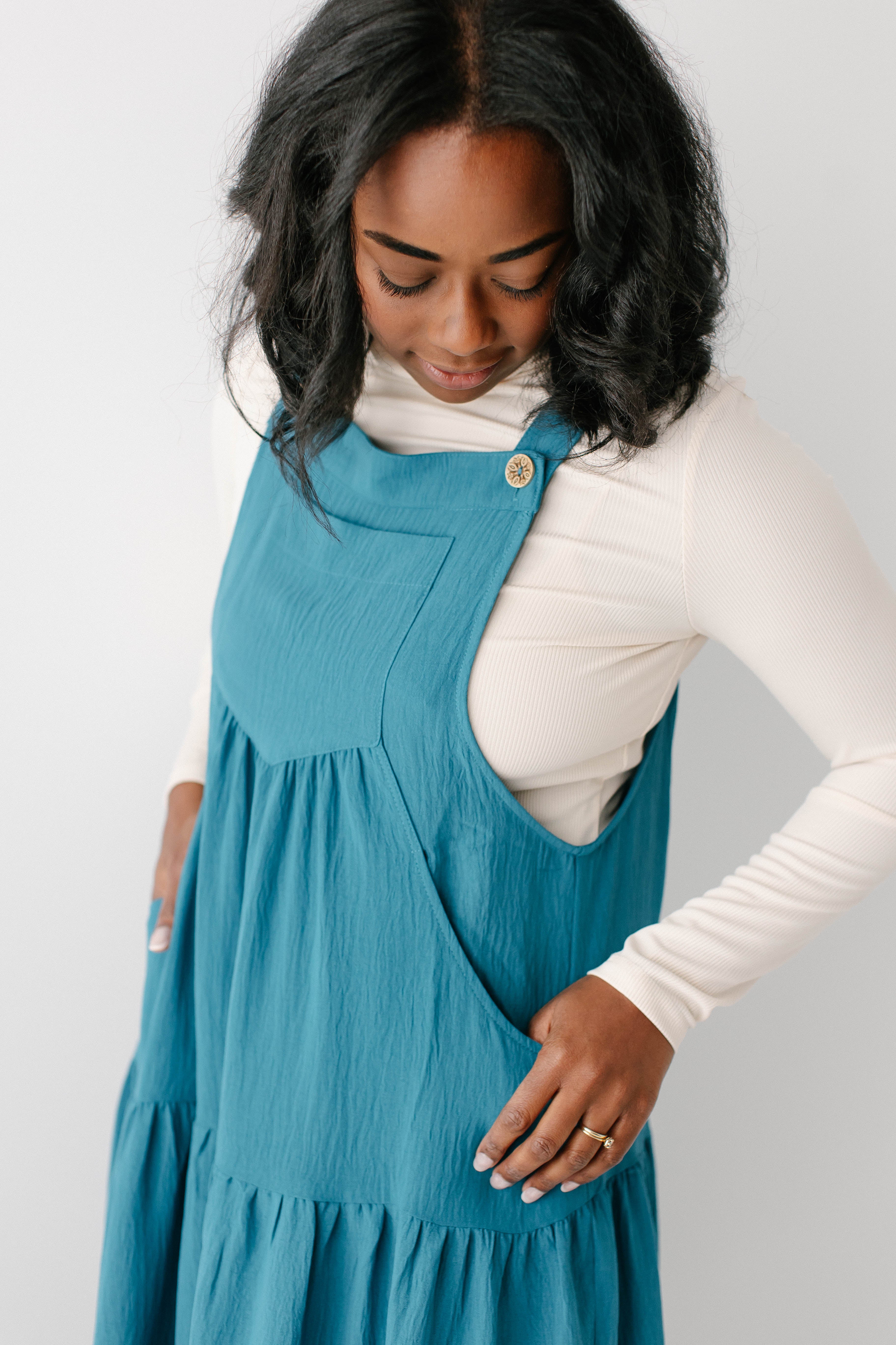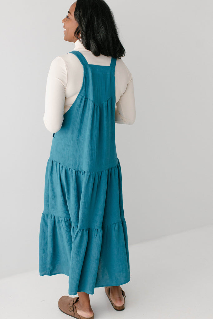 Meet the 'Jasmyn' Tiered Pinafore Dress, the sweetest staple piece! The ‘Jasmyn’ is bright in cheery, having been designed in a delightful teal shade. This dress has a flowy tiered skirt, pockets, and adjustable straps. Pair with a turtleneck and boots for an easy look you are sure to love.