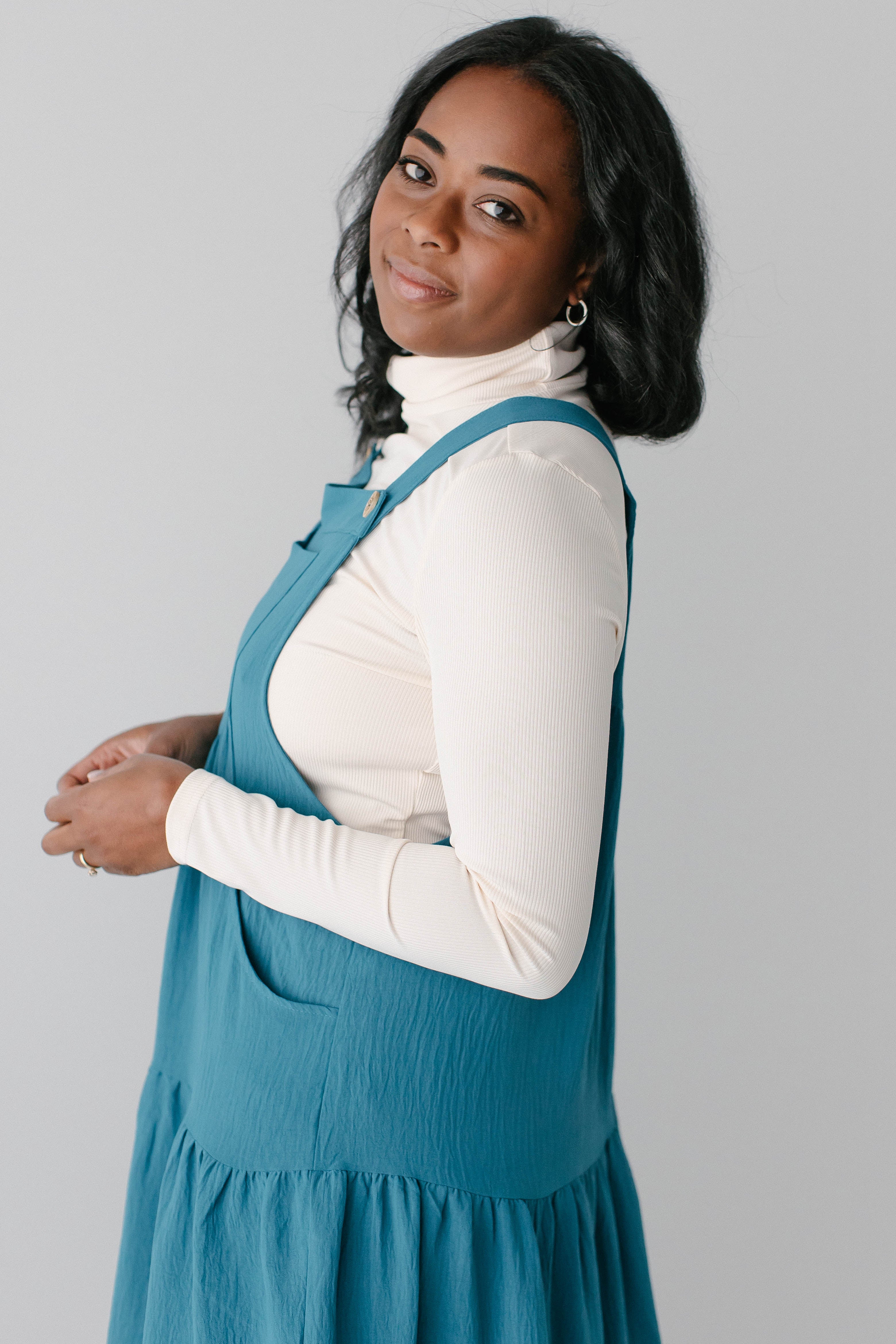 Model wearing the 'Jasmyn' Tiered Pinafore Dress with the 'Zuri' Ribbed Turtleneck in Cream