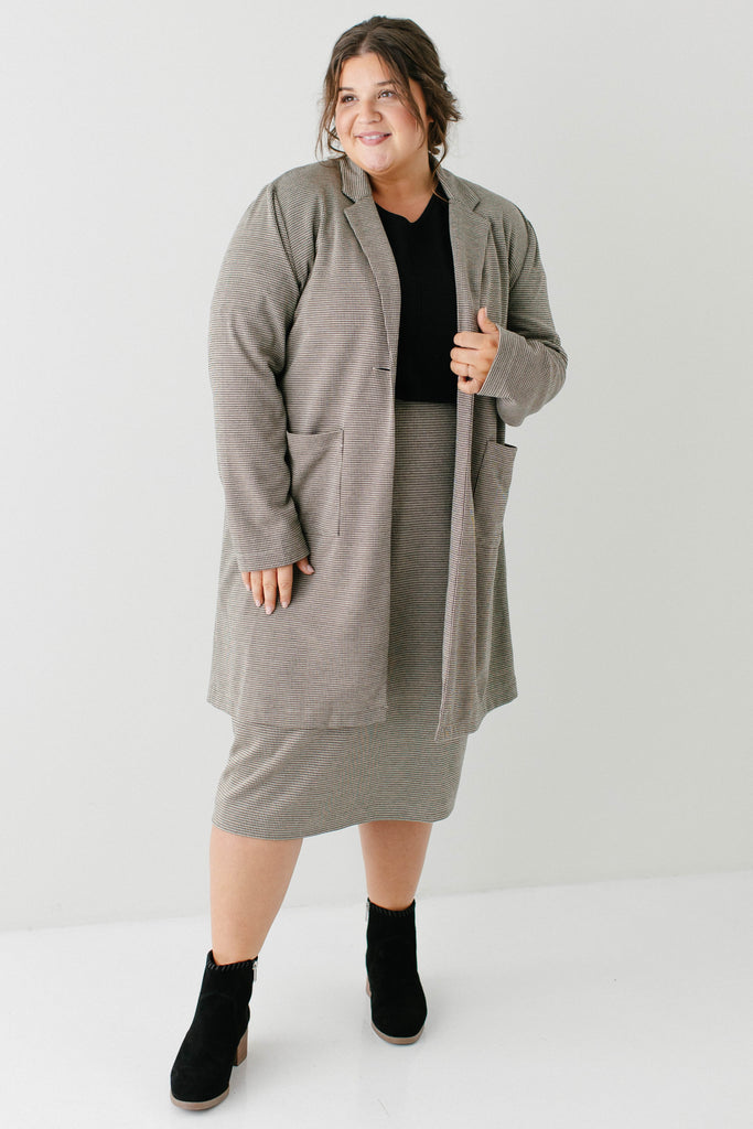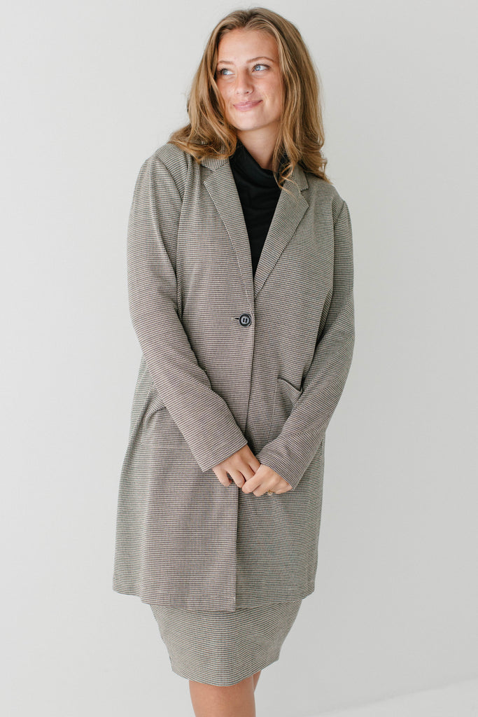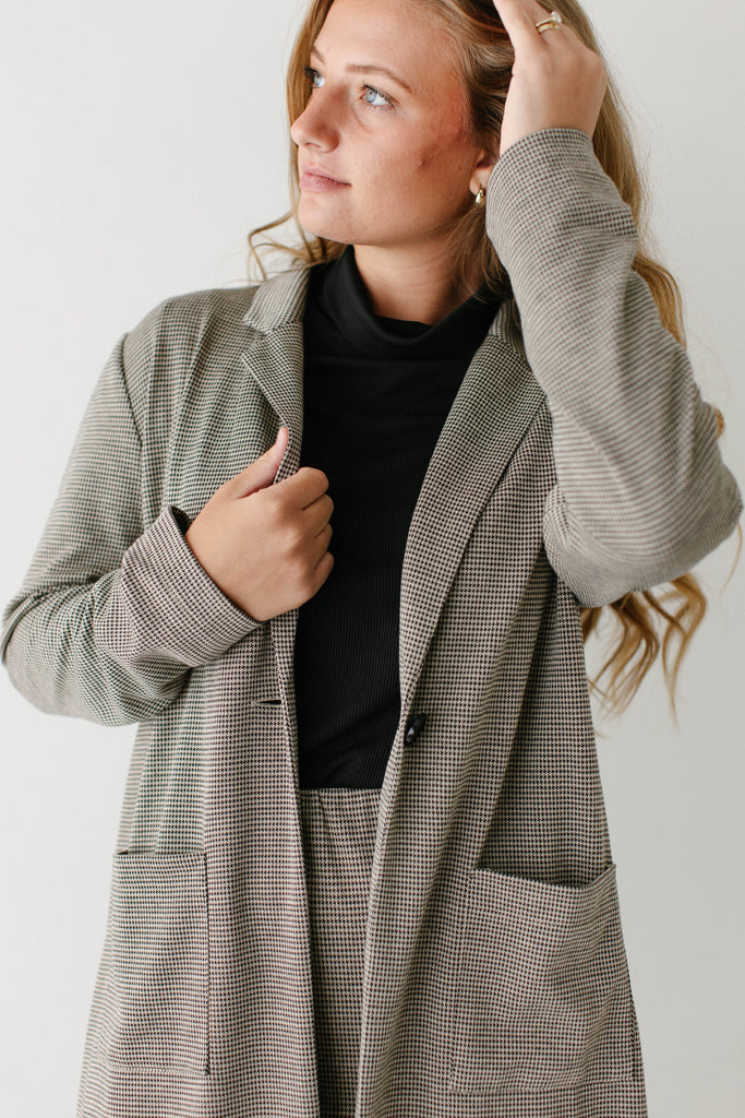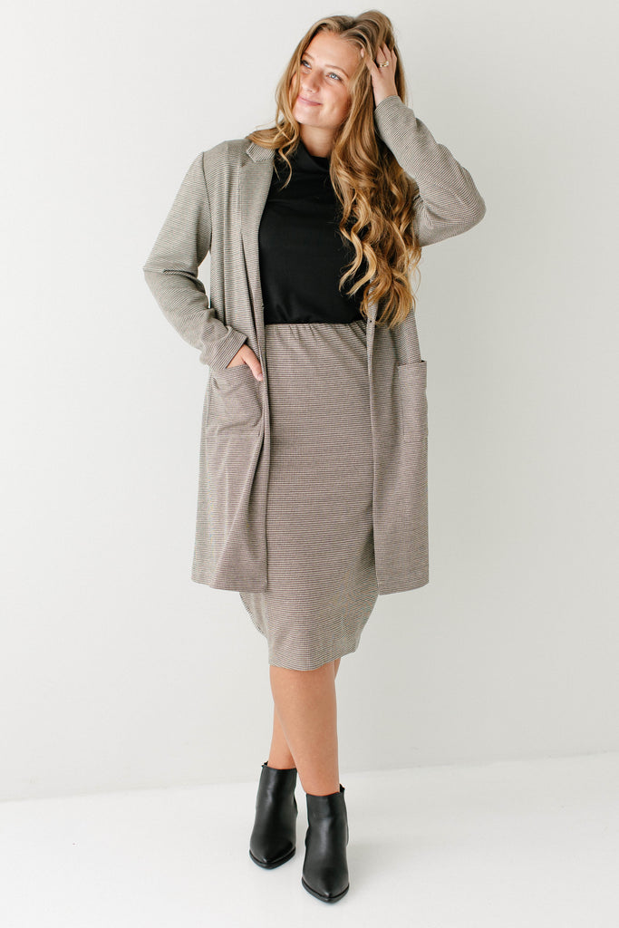 Model wearing the 'Jennifer' Houndstooth Stretch Knit Blazer with the 'Zuri' Ribbed Turtleneck in Black and the 'Corryn' Houndstooth Pencil Midi Skirt in Tan