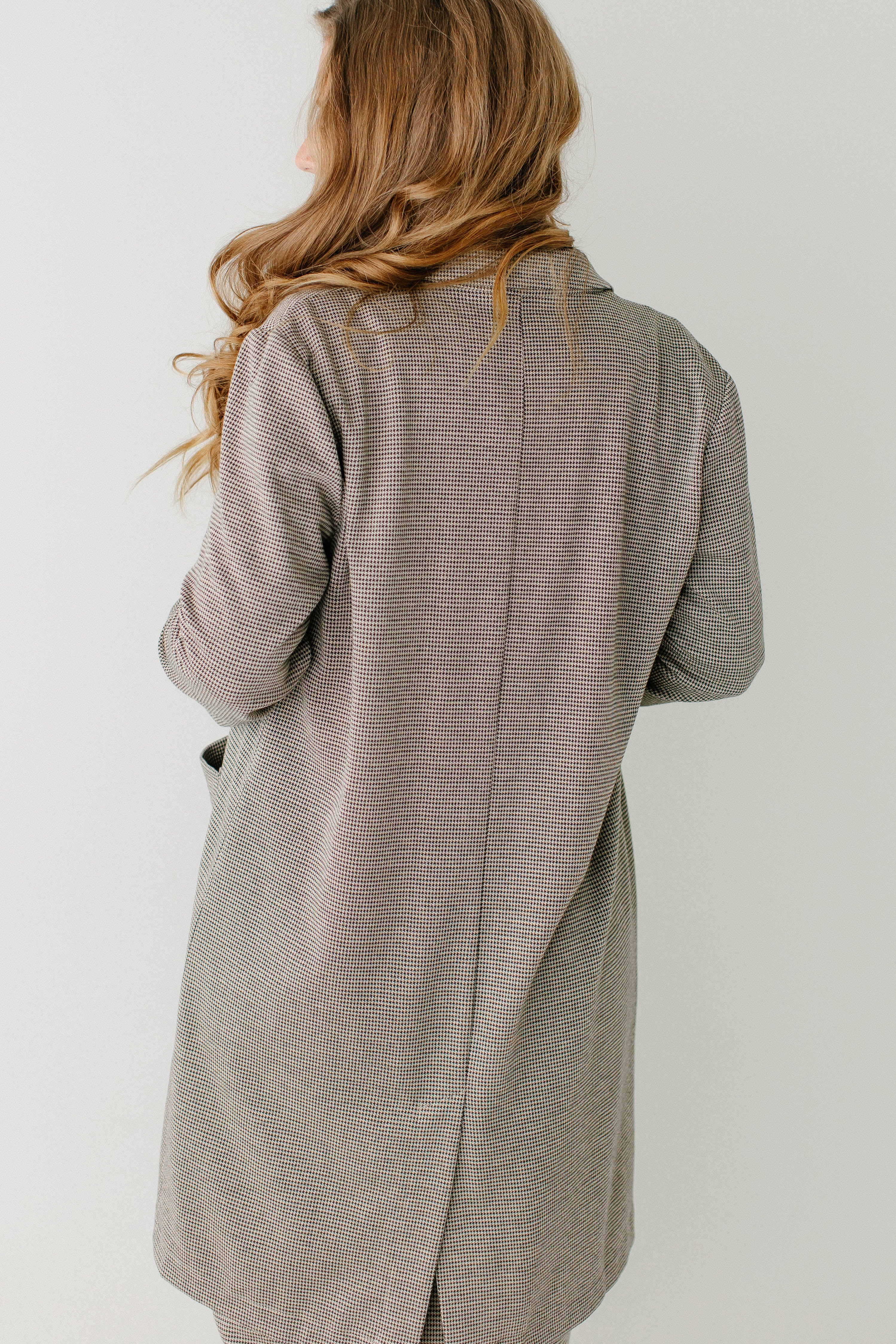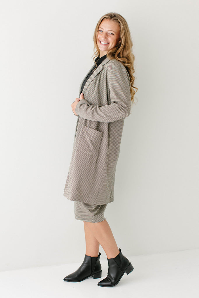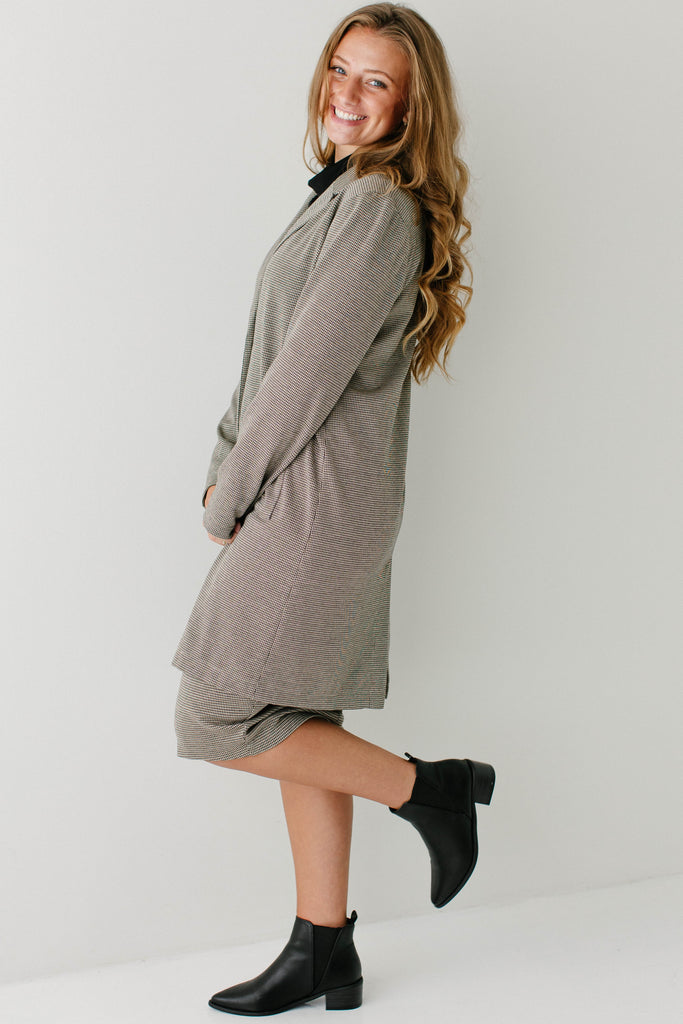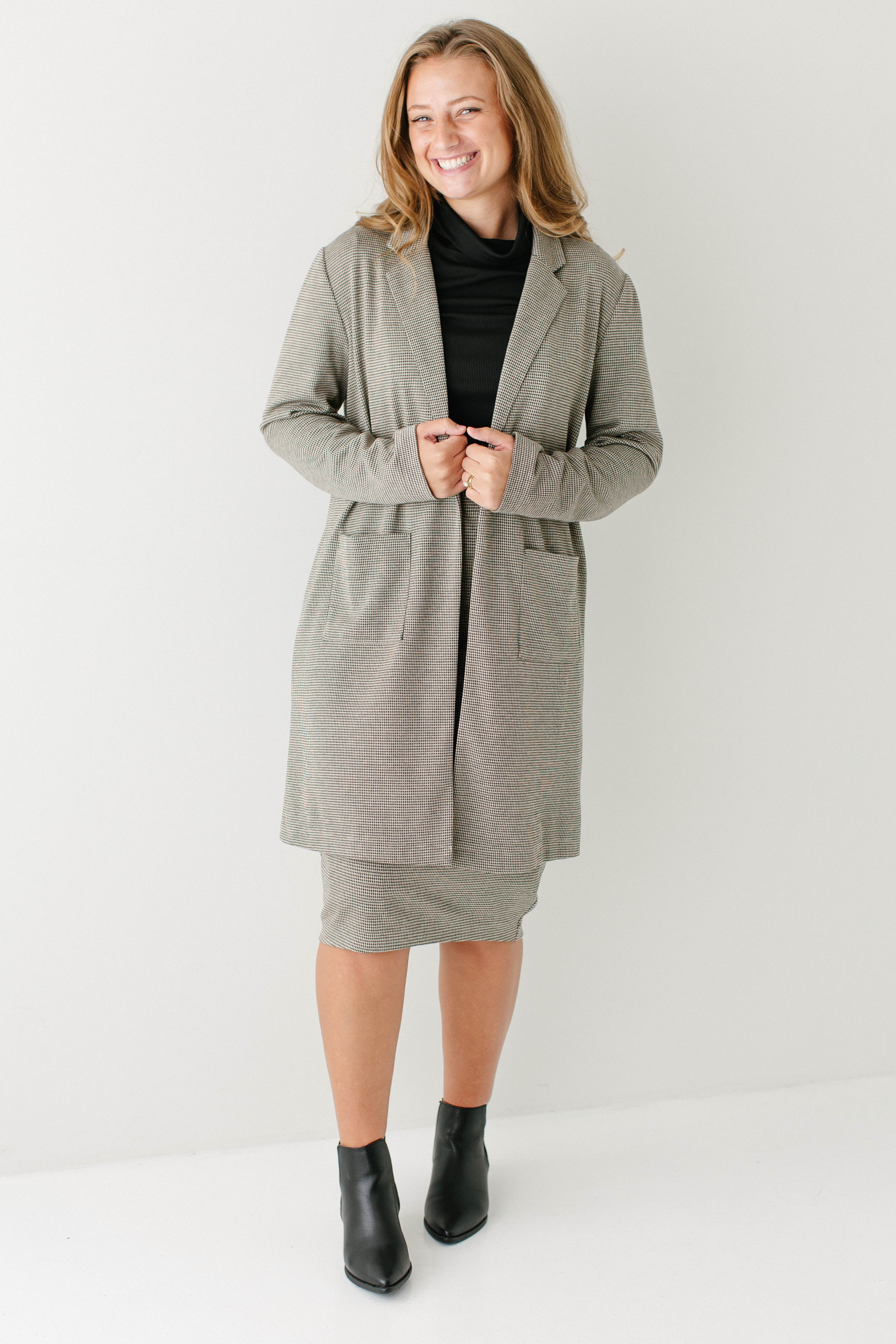 Model wearing the 'Jennifer' Houndstooth Stretch Knit Blazer with the 'Zuri' Ribbed Turtleneck in Black and the 'Corryn' Houndstooth Pencil Midi Skirt in Tan