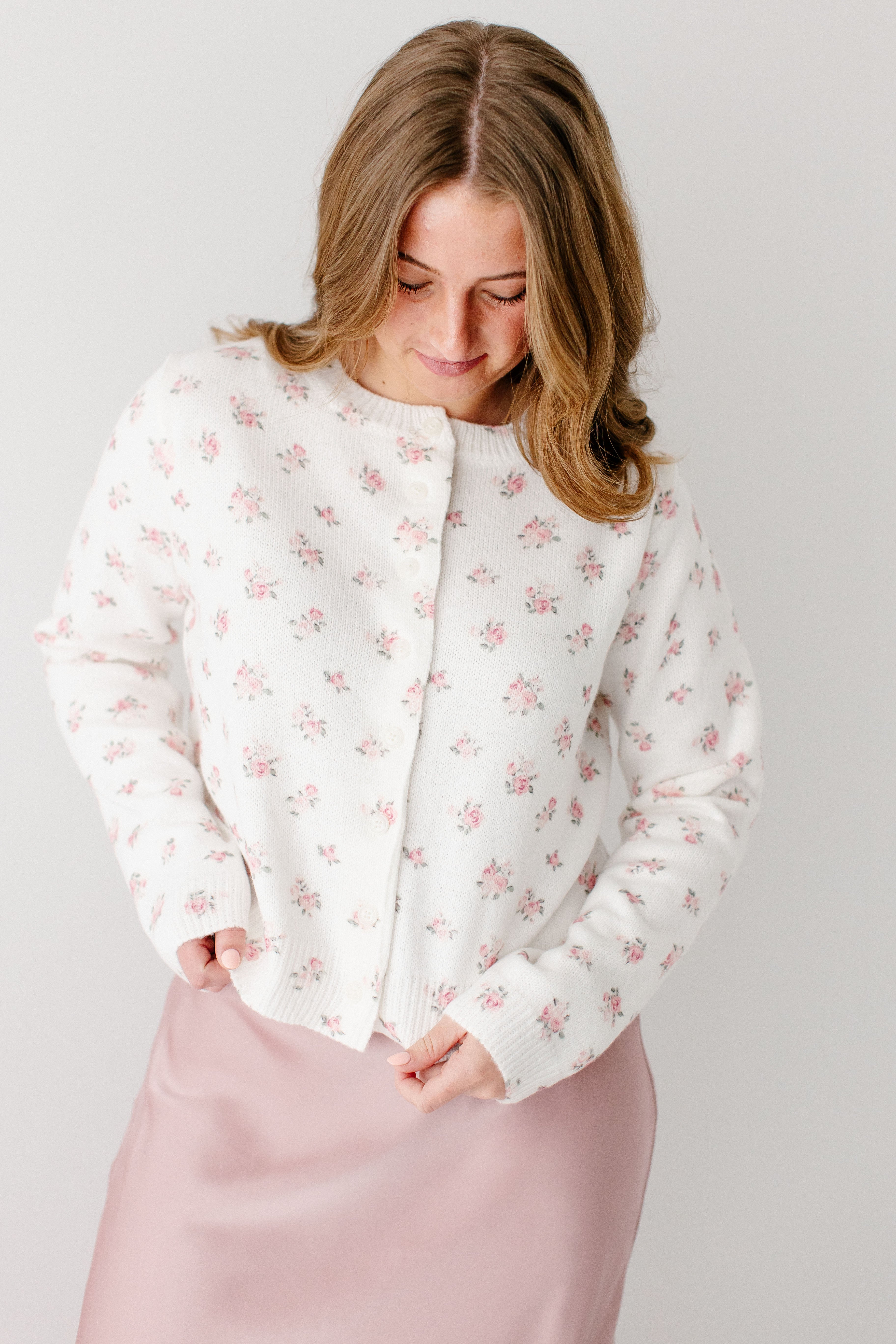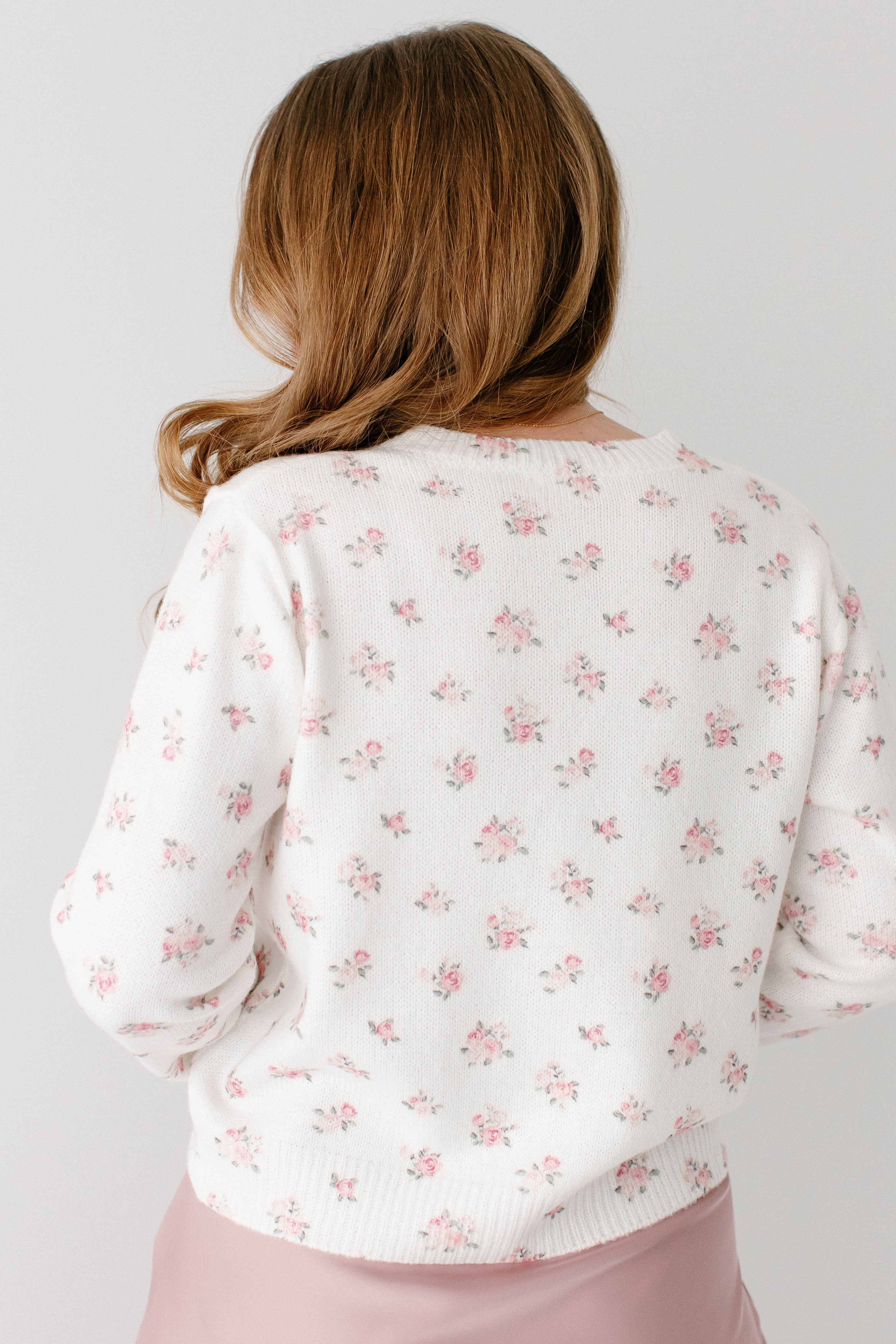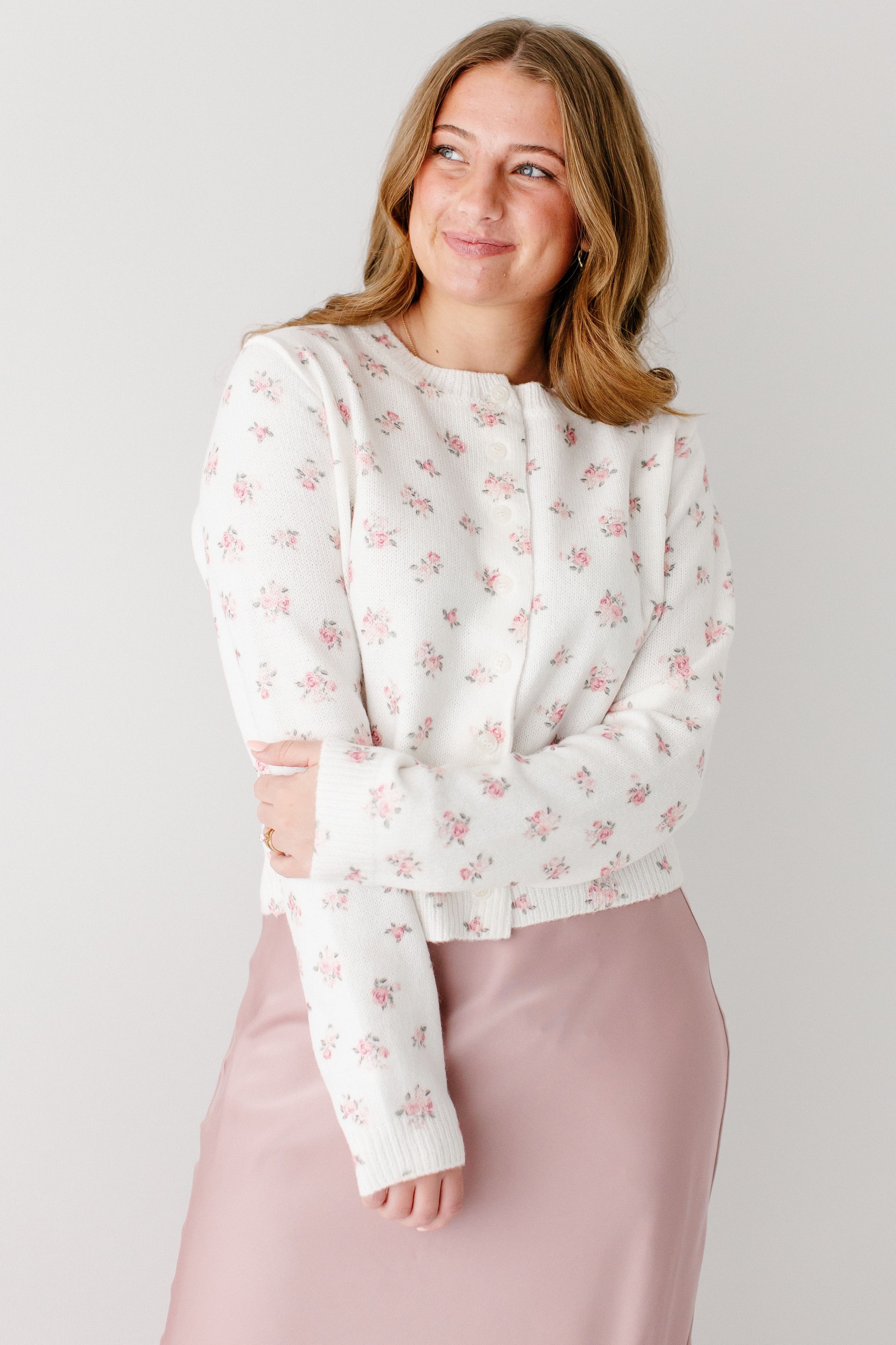 A piece that is both cozy and demure, the 'Jolie' Blush Rose Floral Cardigan is a stunning piece! The dainty blush-colored rose floral detail adds elegance and class, just dress up with a solid tiered or slip skirt, or dress down with your favorite denim piece!