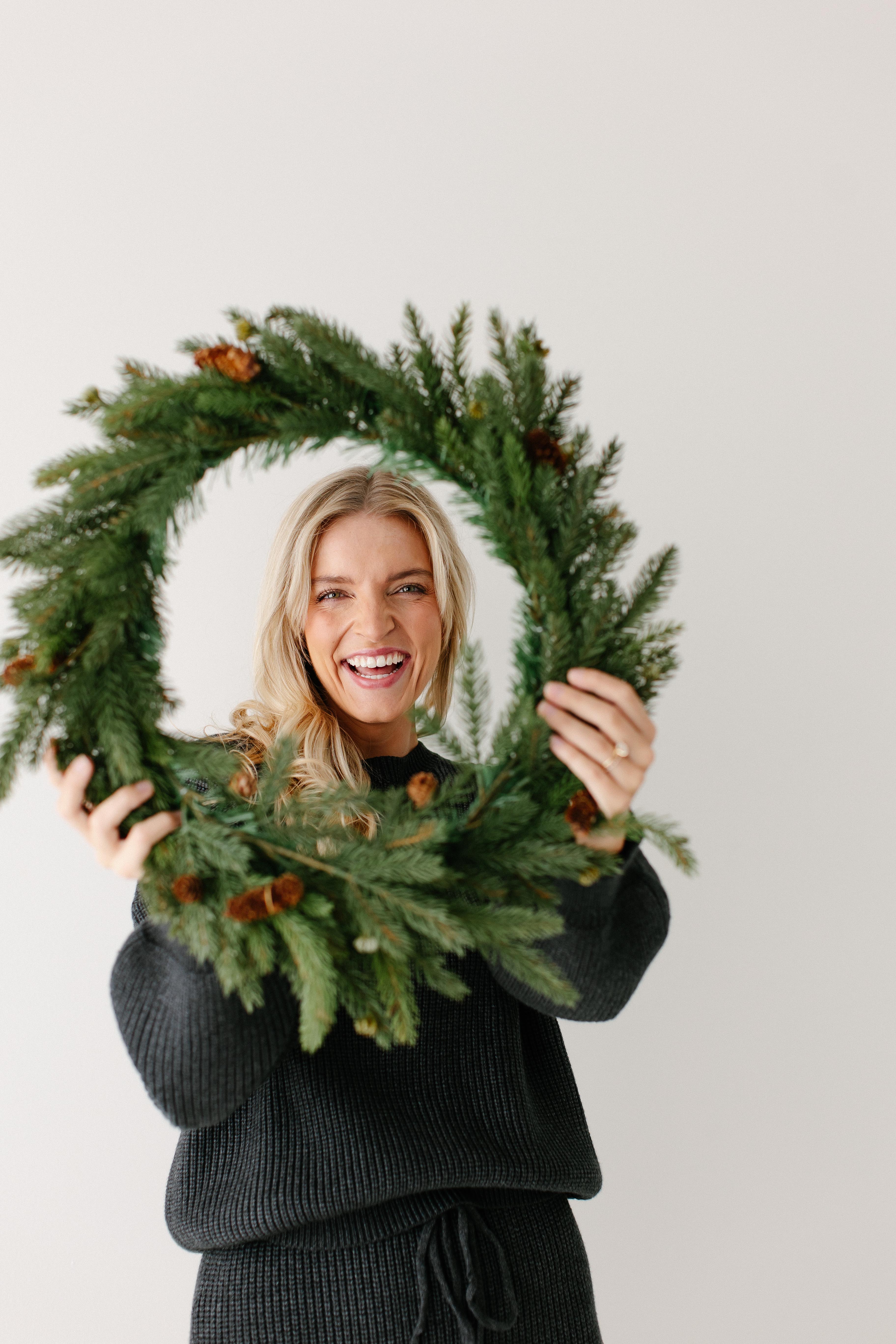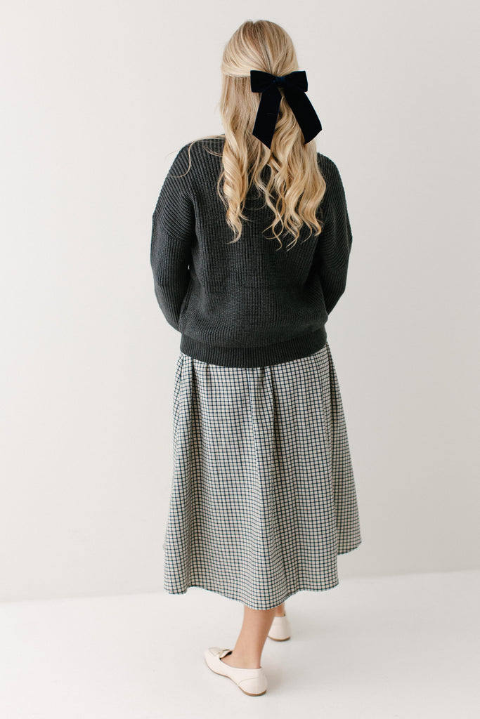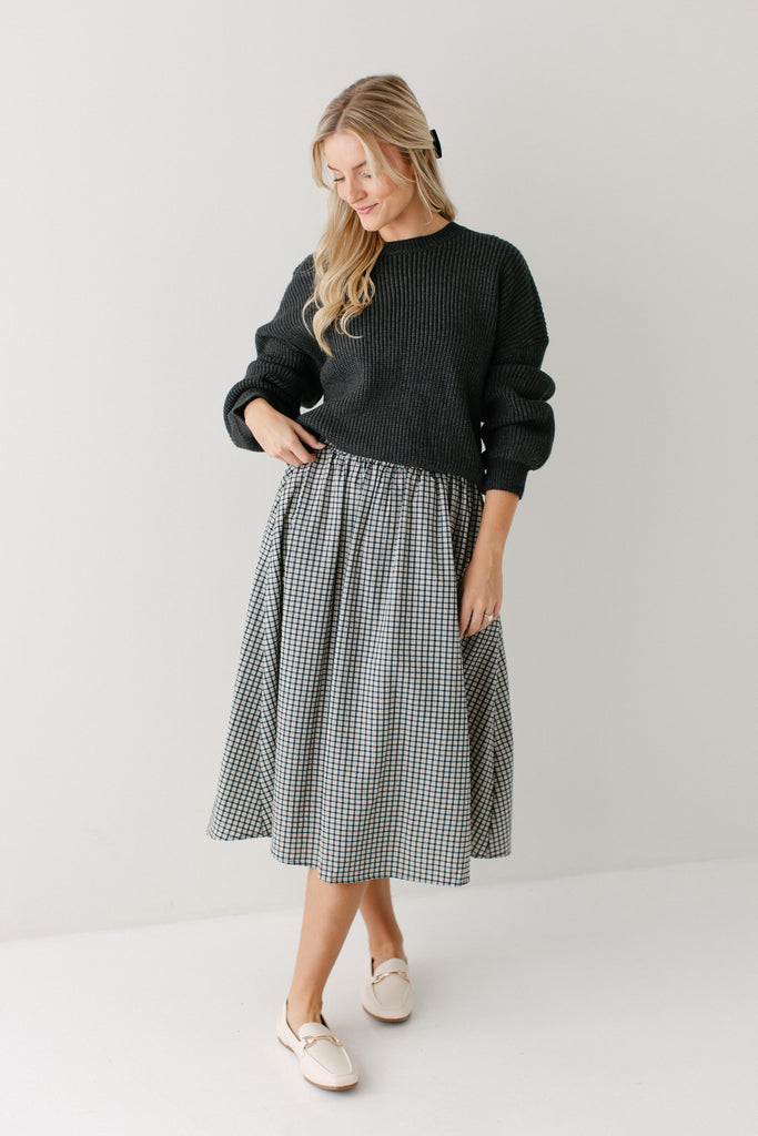 Model wearing the 'Jordyn' Drop Sleeve Sweater with the 'Candace' Navy Plaid A-Line Midi Skirt