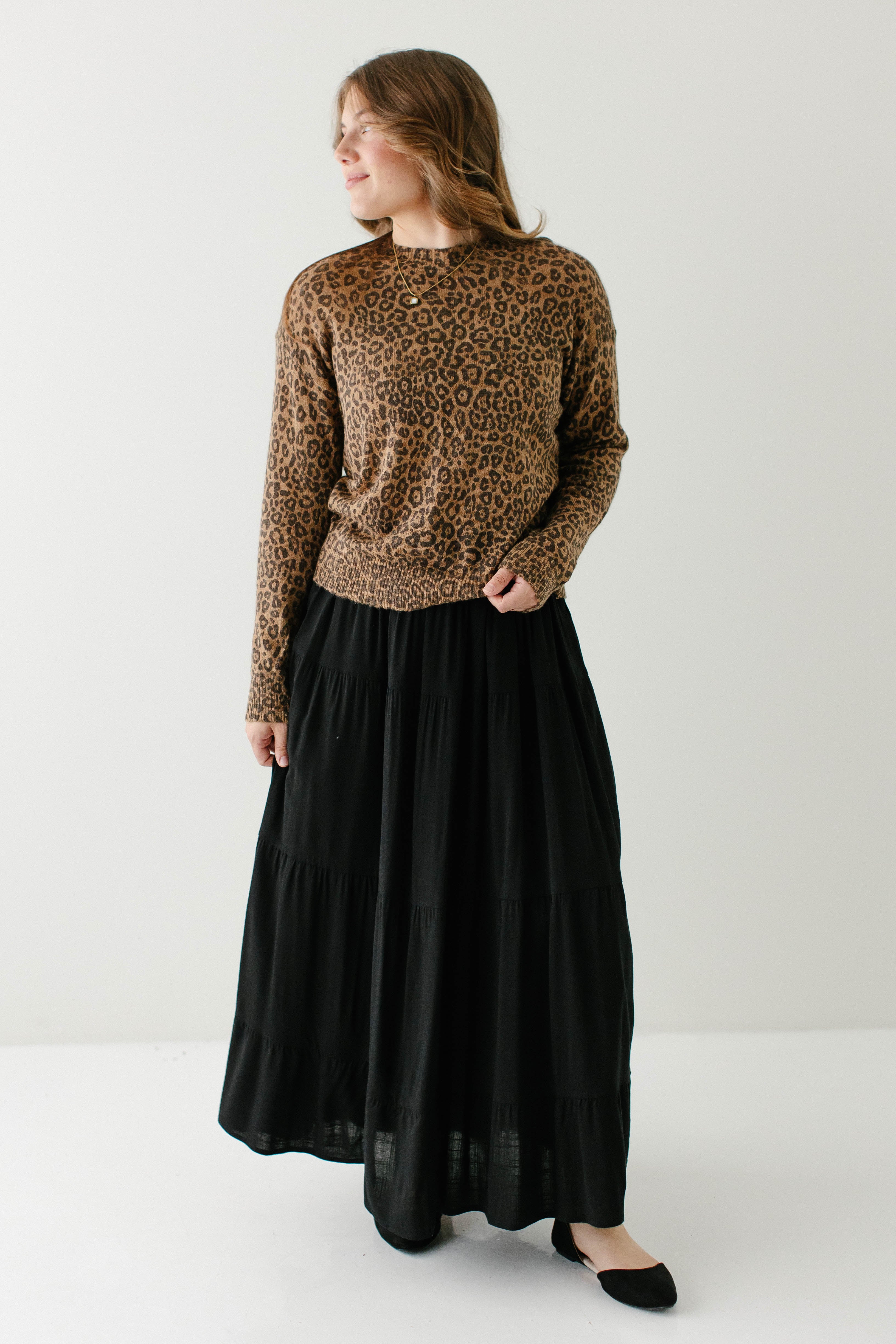 Model wearing the 'Journey' Leopard Print Sweater Top with the 'Addison' Tiered Maxi Skirt
