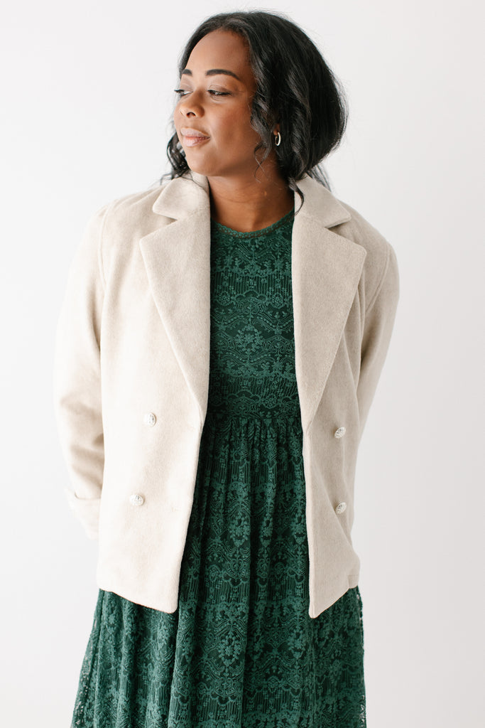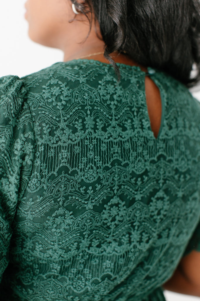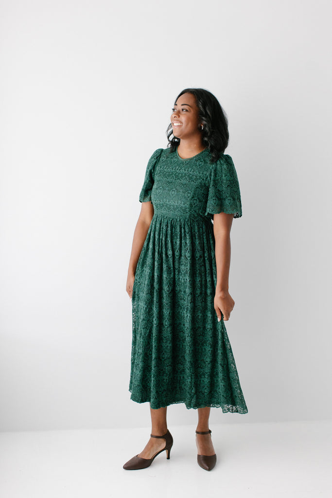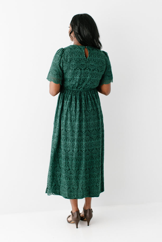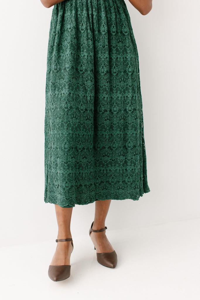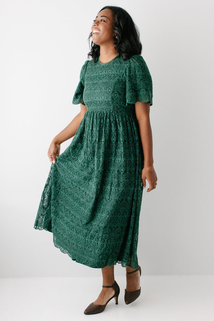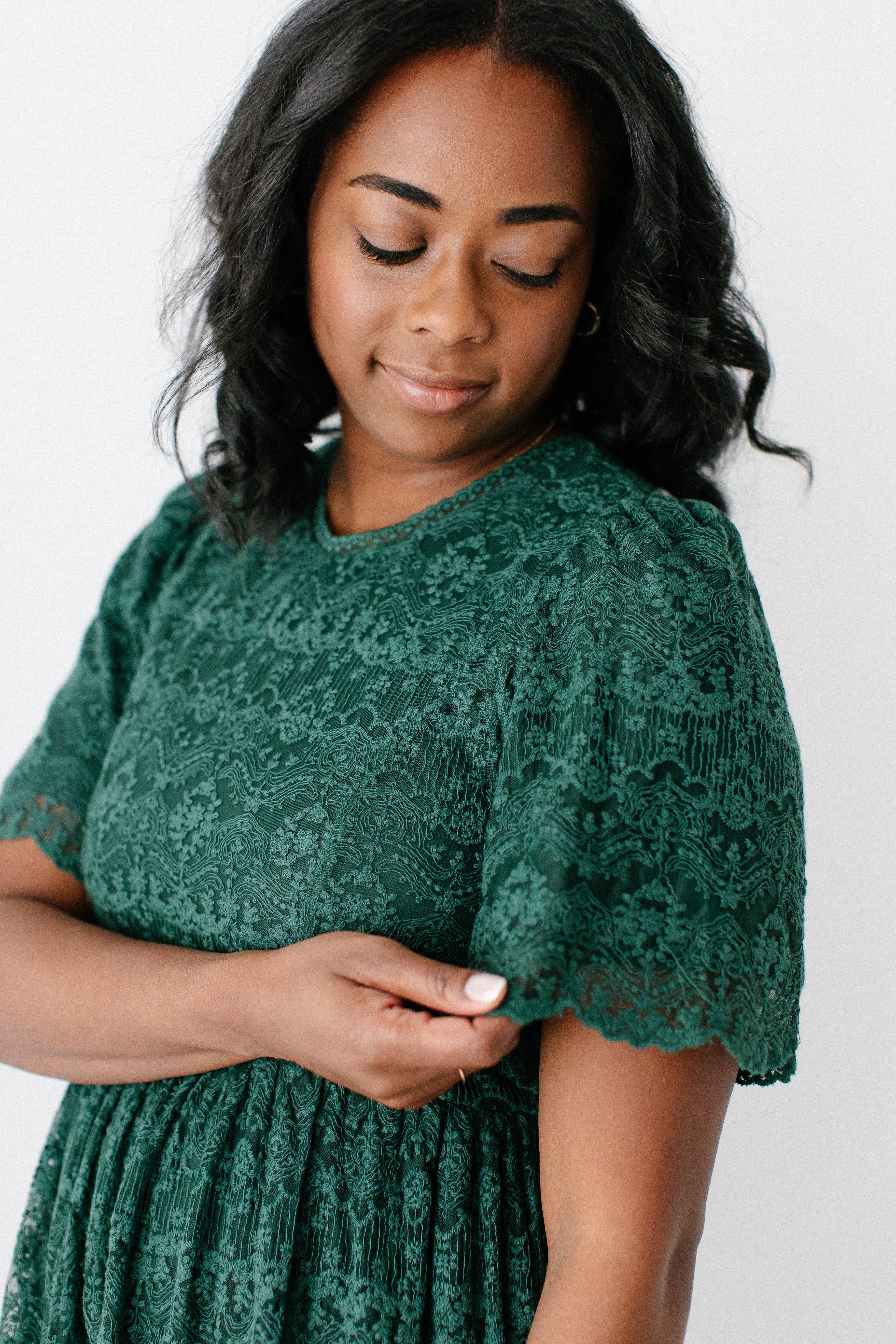 Lace dresses are the perfect closet staple! The 'Juniper' Lace Overlay Maxi Dress is made from embroidered stretch lace fabric in a beautiful forest green, scalloped edging, is fully lined, and has the modest neckline and skirt length that you love! Pair the ‘Juniper’ with your favorite peacoat and heels for the perfect outfit for any of your holiday events.