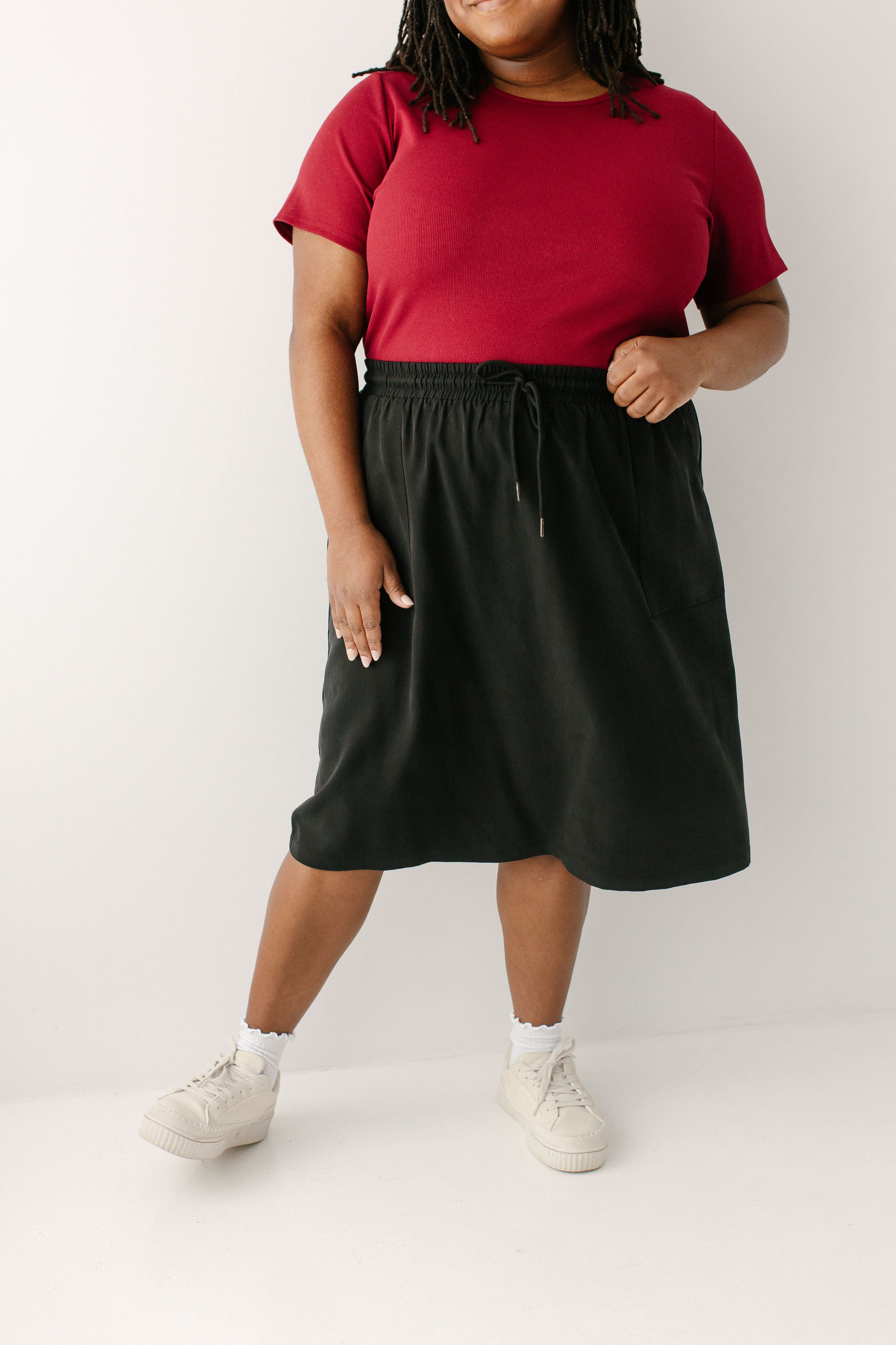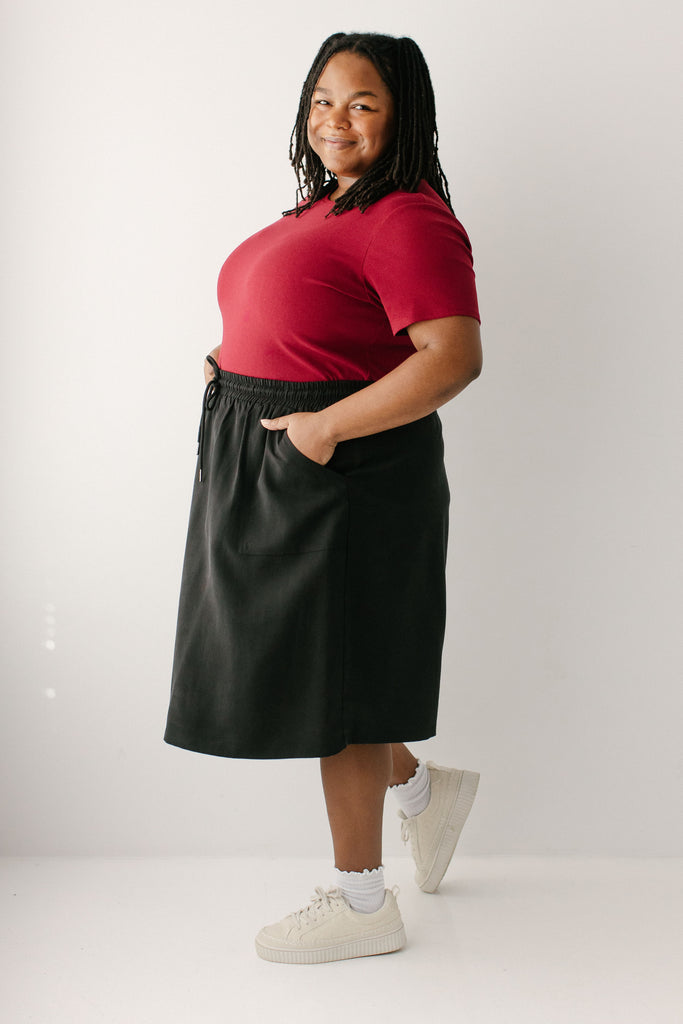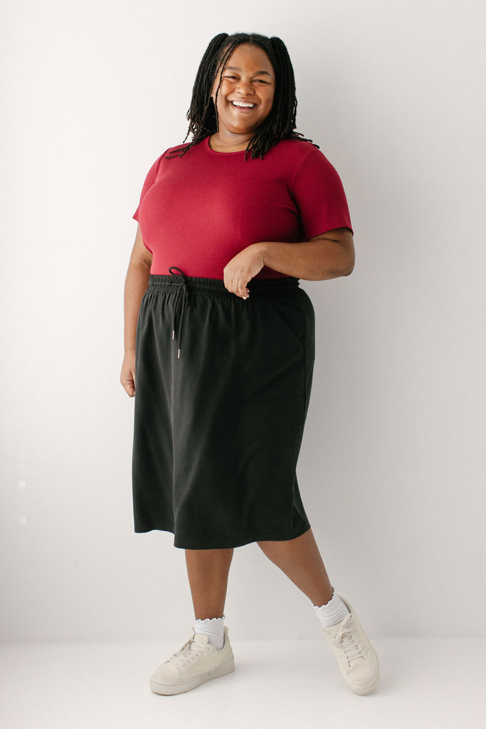 Model wearing the 'Shelly' Short Sleeve Ribbed Top in Crimson (coming soon!) with the 'Katrina' Drawstring Tencel Skirt