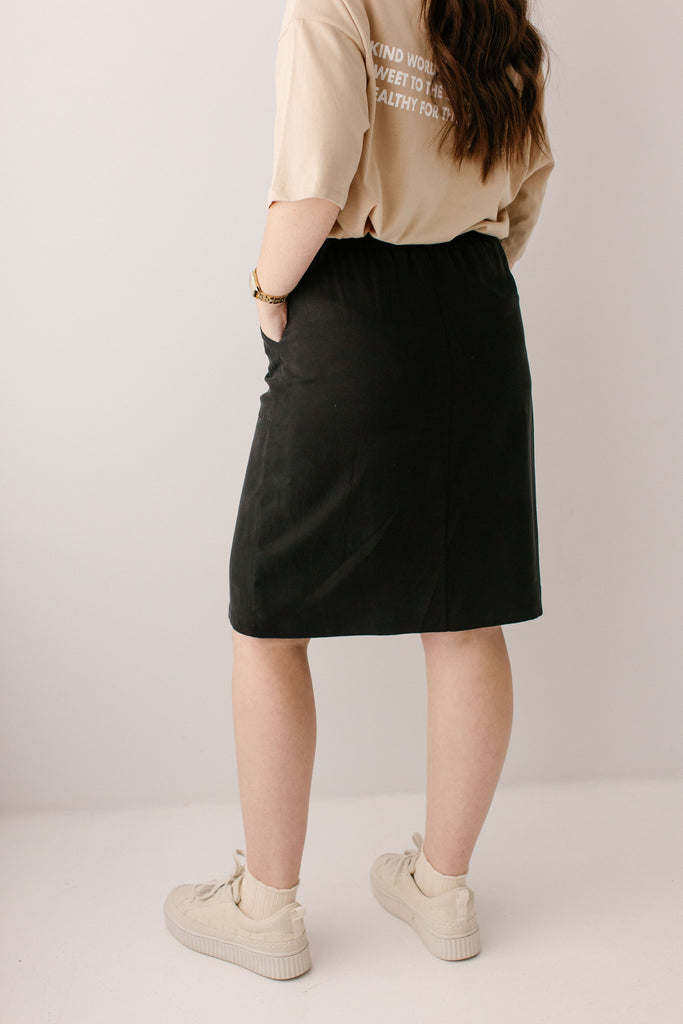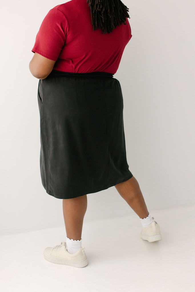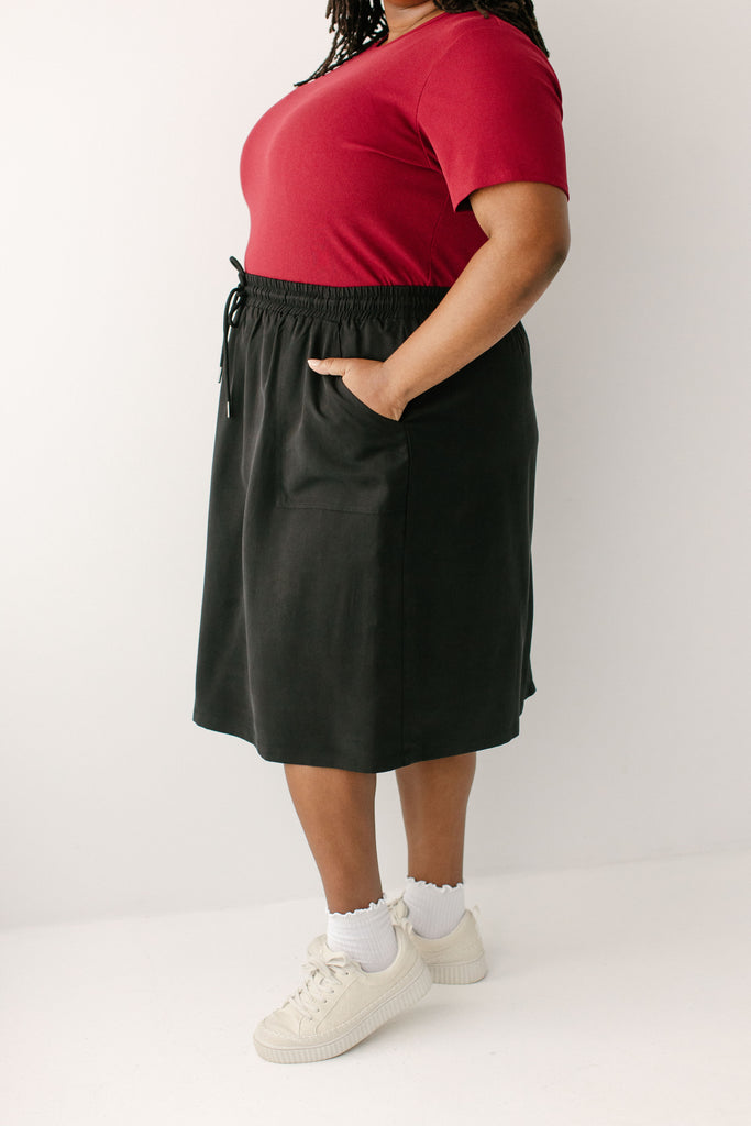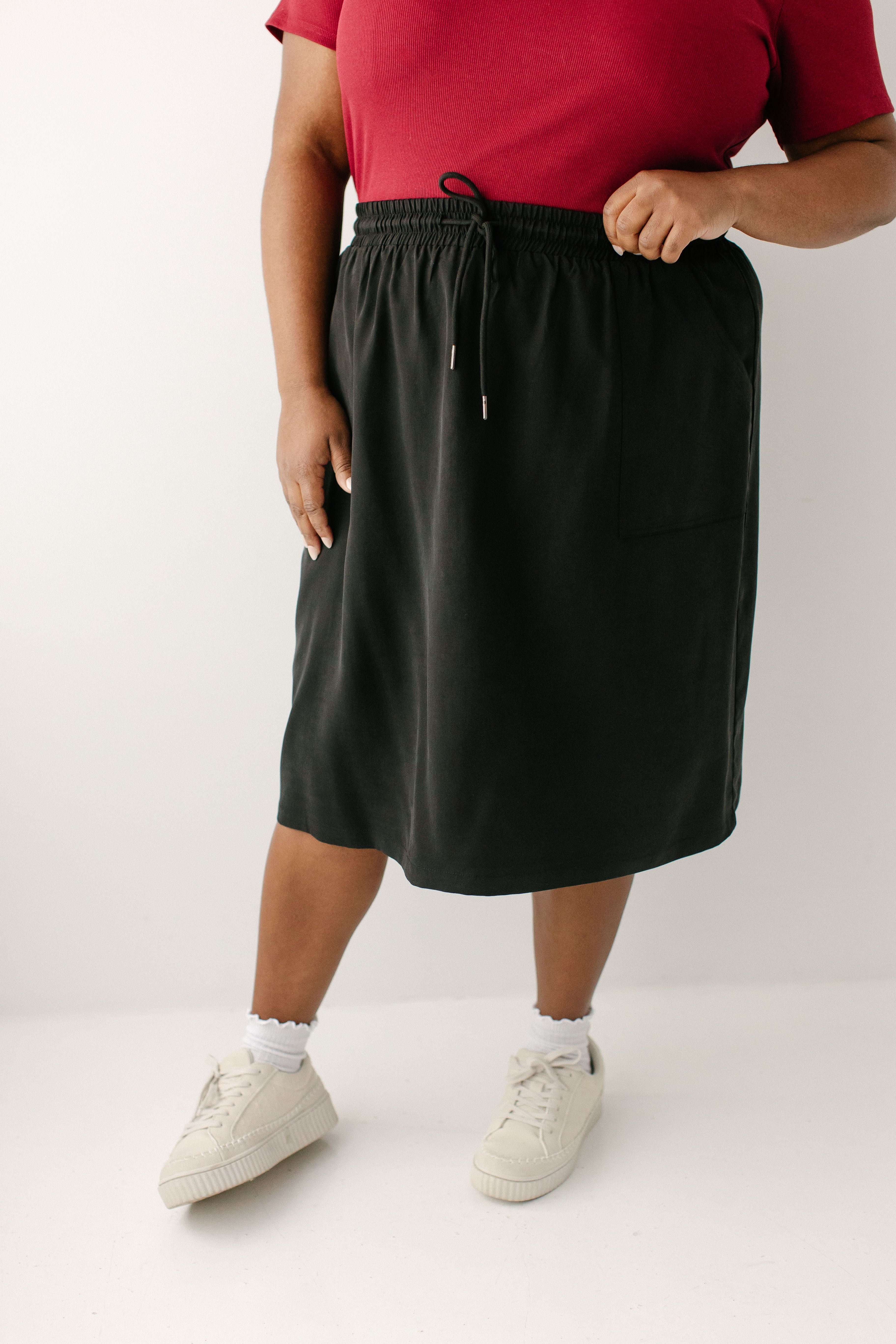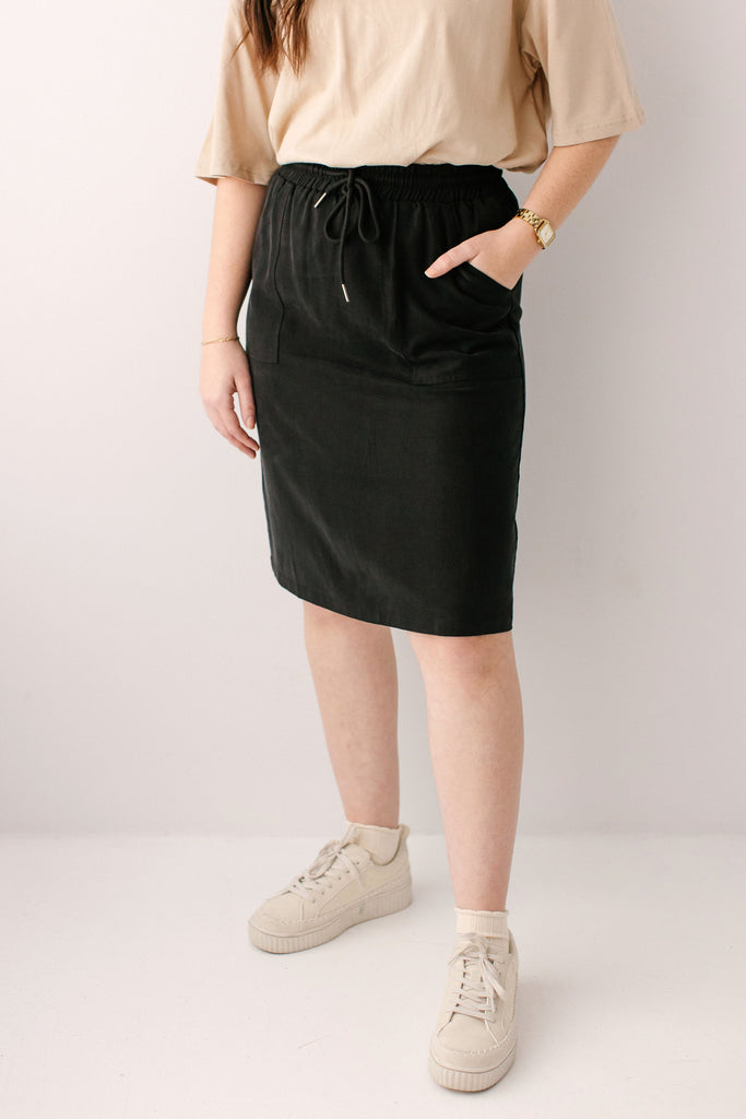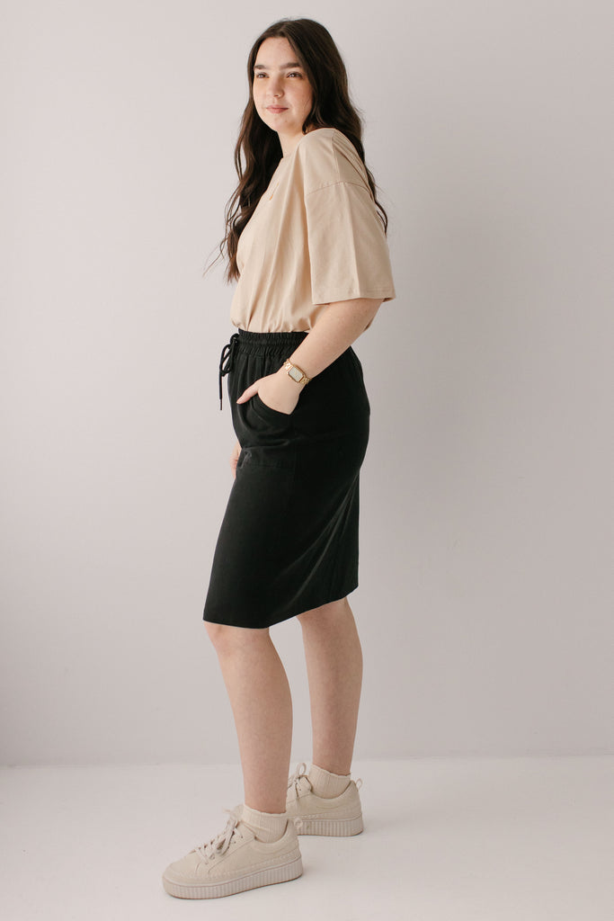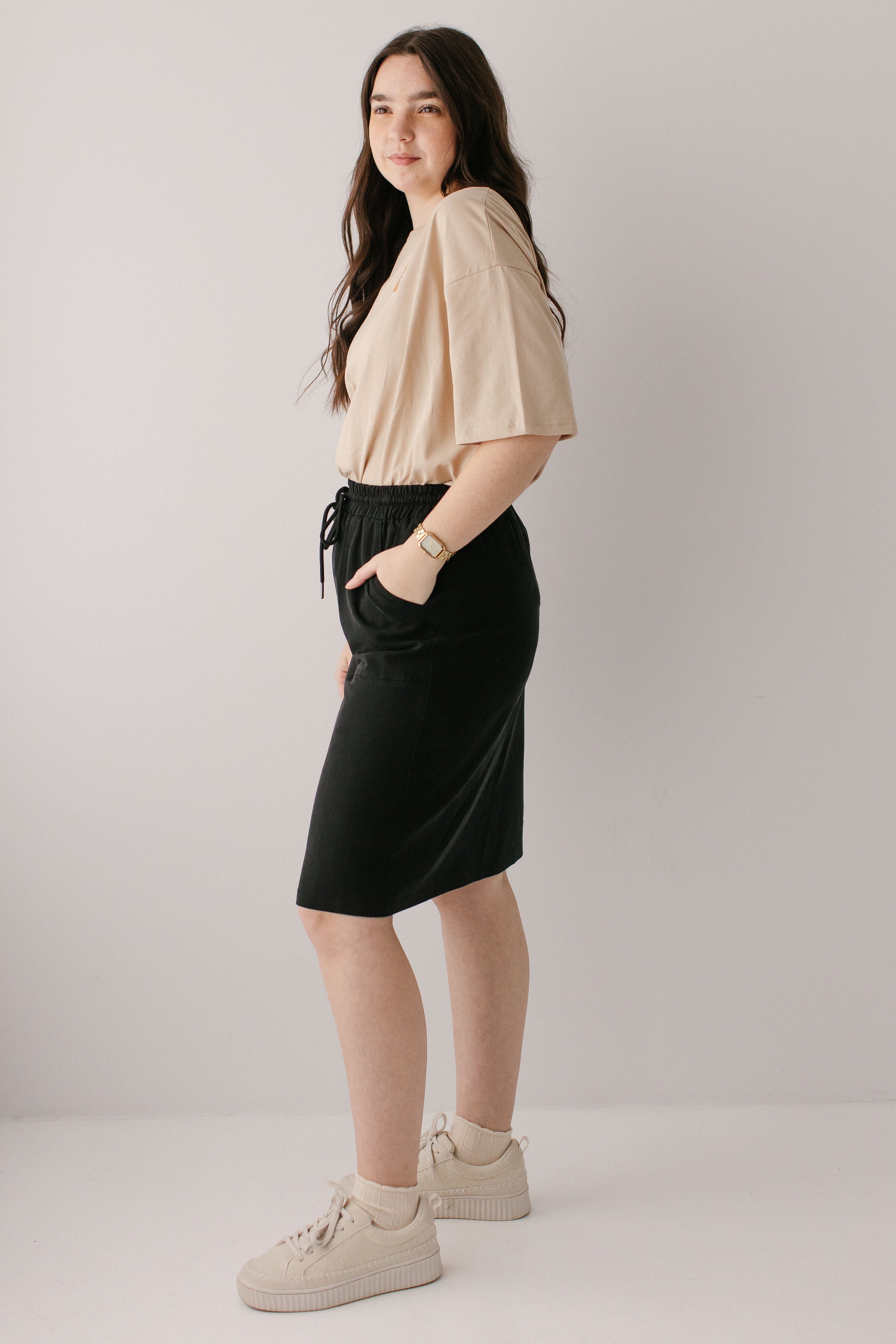 Meet the 'Katrina' Drawstring Tencel Skirt, the comfiest active skirt you will own! Made from a Tencel/linen blend fabric, this skirt is durable and comfortable and features a tie-waist, front pockets, and versatile black color. Pair the ‘Katrina’ with leggings and a classic tee for your morning run! Exclusively designed by us with you in mind.
