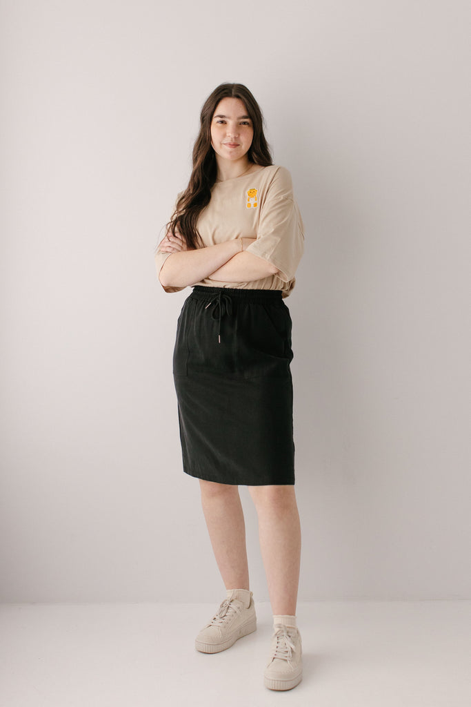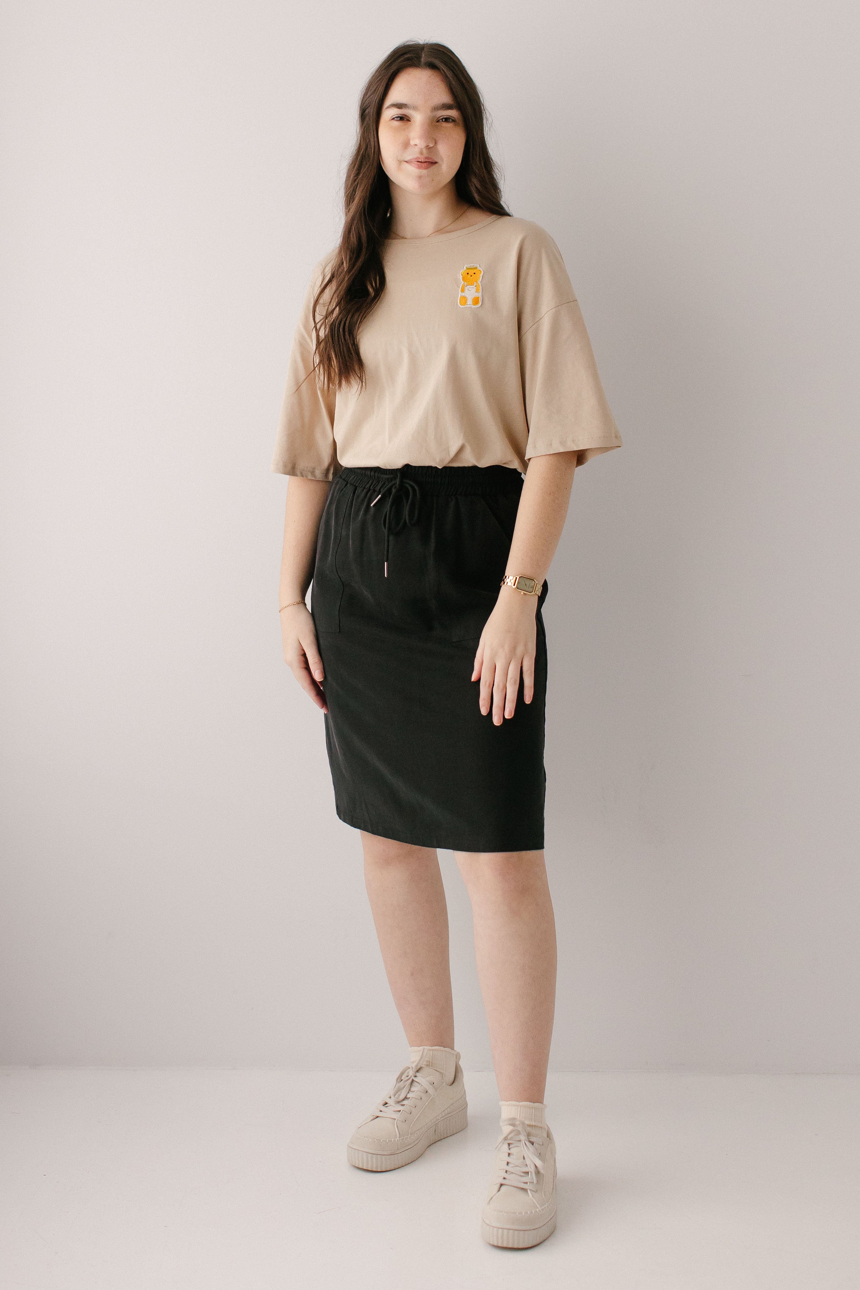 Model wearing the 'Honey Bear' Graphic Tee (coming soon!) with the 'Katrina' Drawstring Tencel Skirt