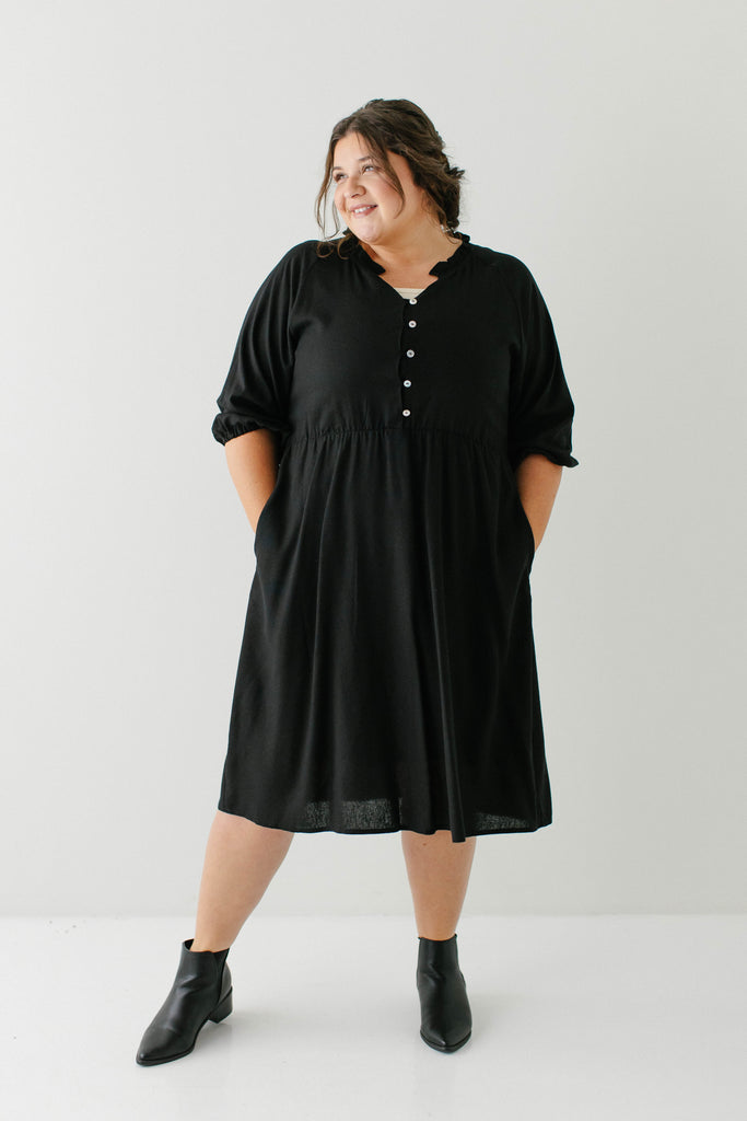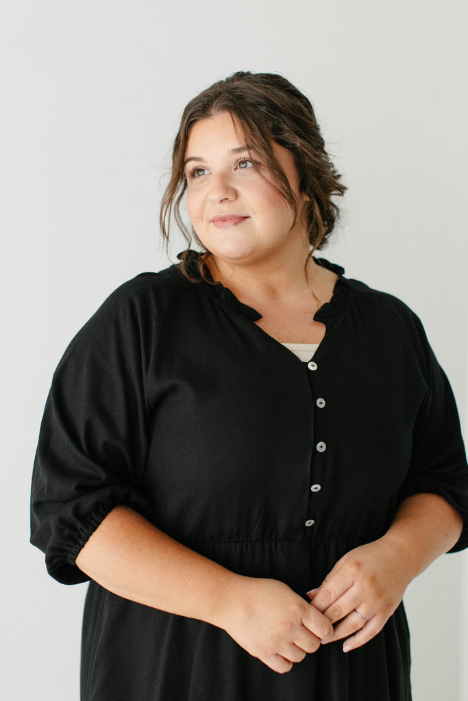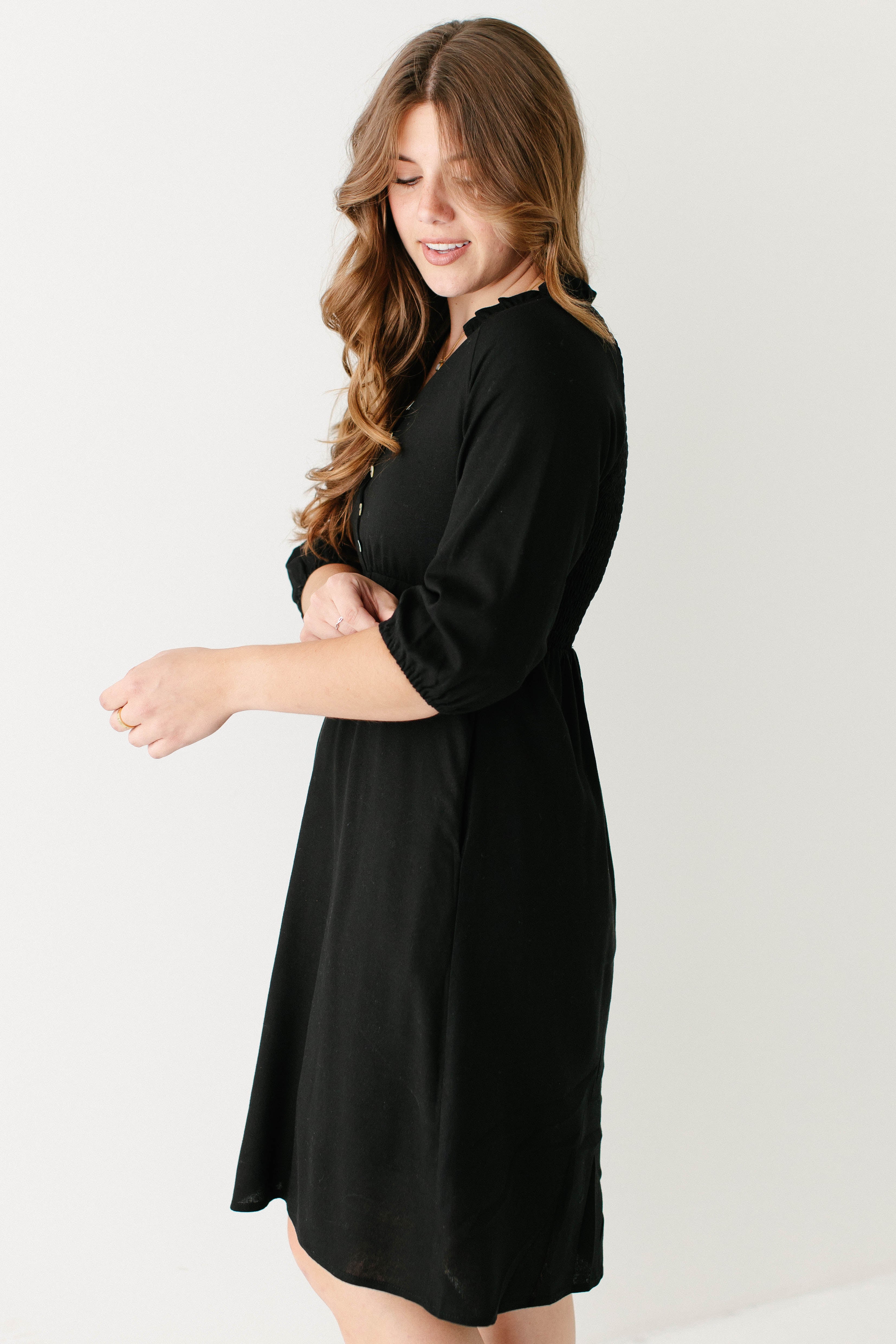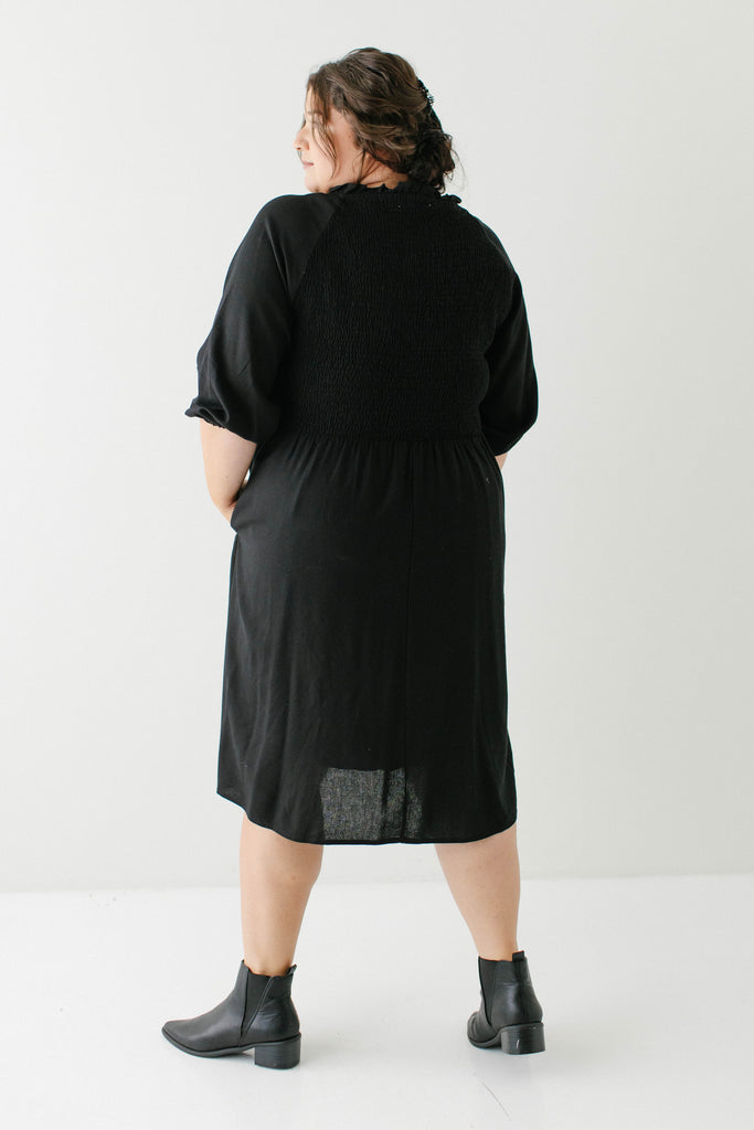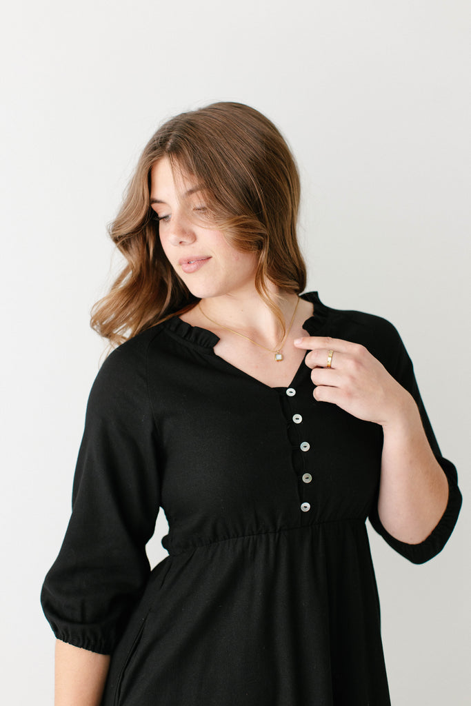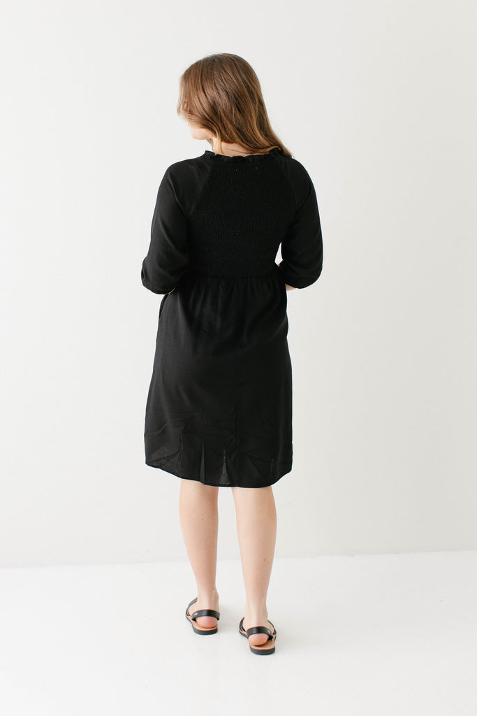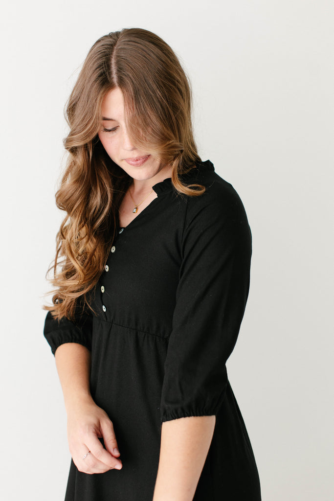 Introducing the 'Kenzi' Ruffle Detail Knee Length Dress, the cutest little black dress! Featuring a ruffled modest v-neckline, functional buttons, ¾ elastic sleeves, and smocking on the back, this dress is full of the cutest feminine details that will ensure the most flattering fit. Pair the ‘Kenzi’ with your favorite jacket or cardigan for the chilly months, or wear with a light sweater for the warmer days. Exclusively designed by us with you in mind.