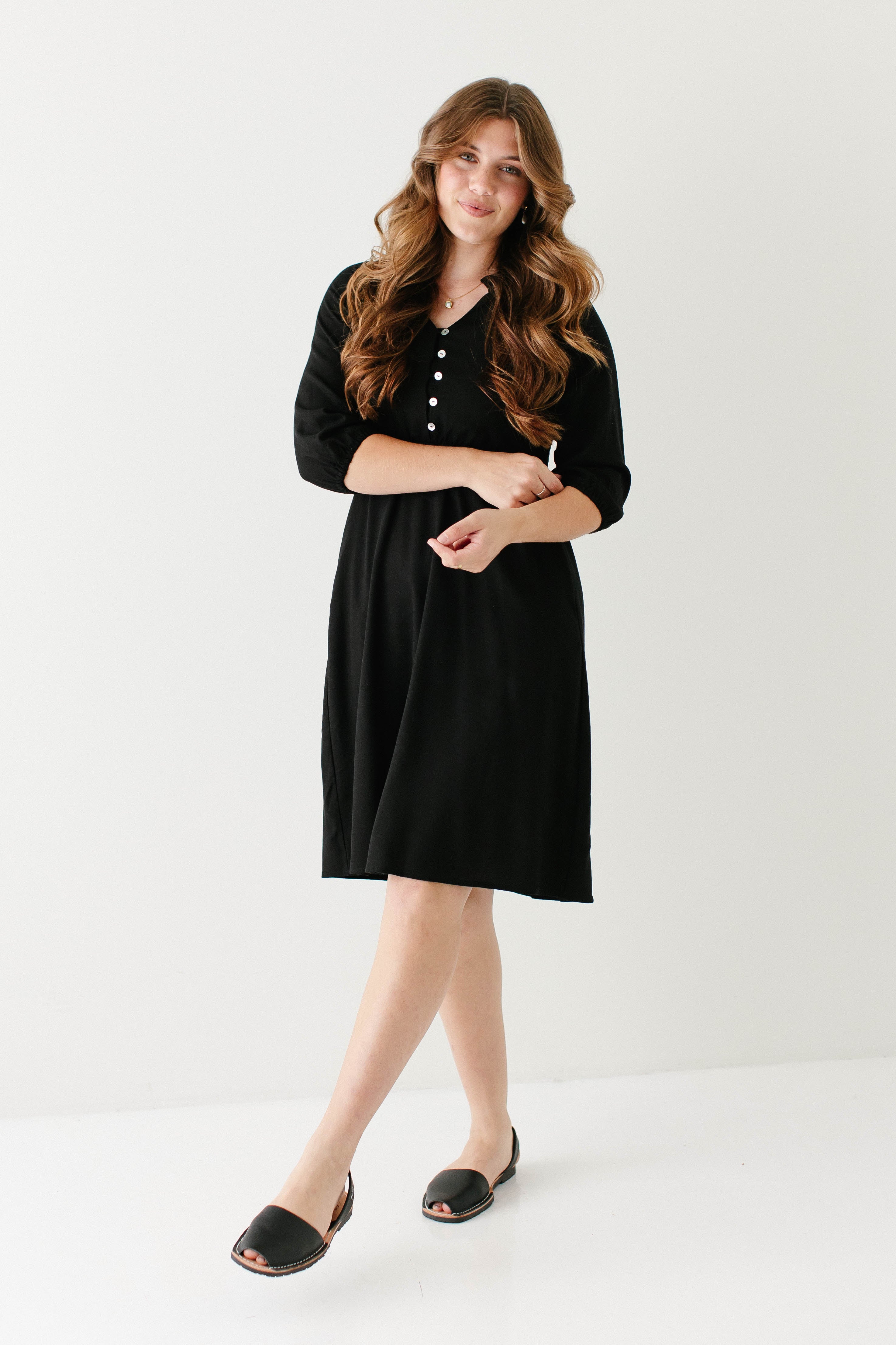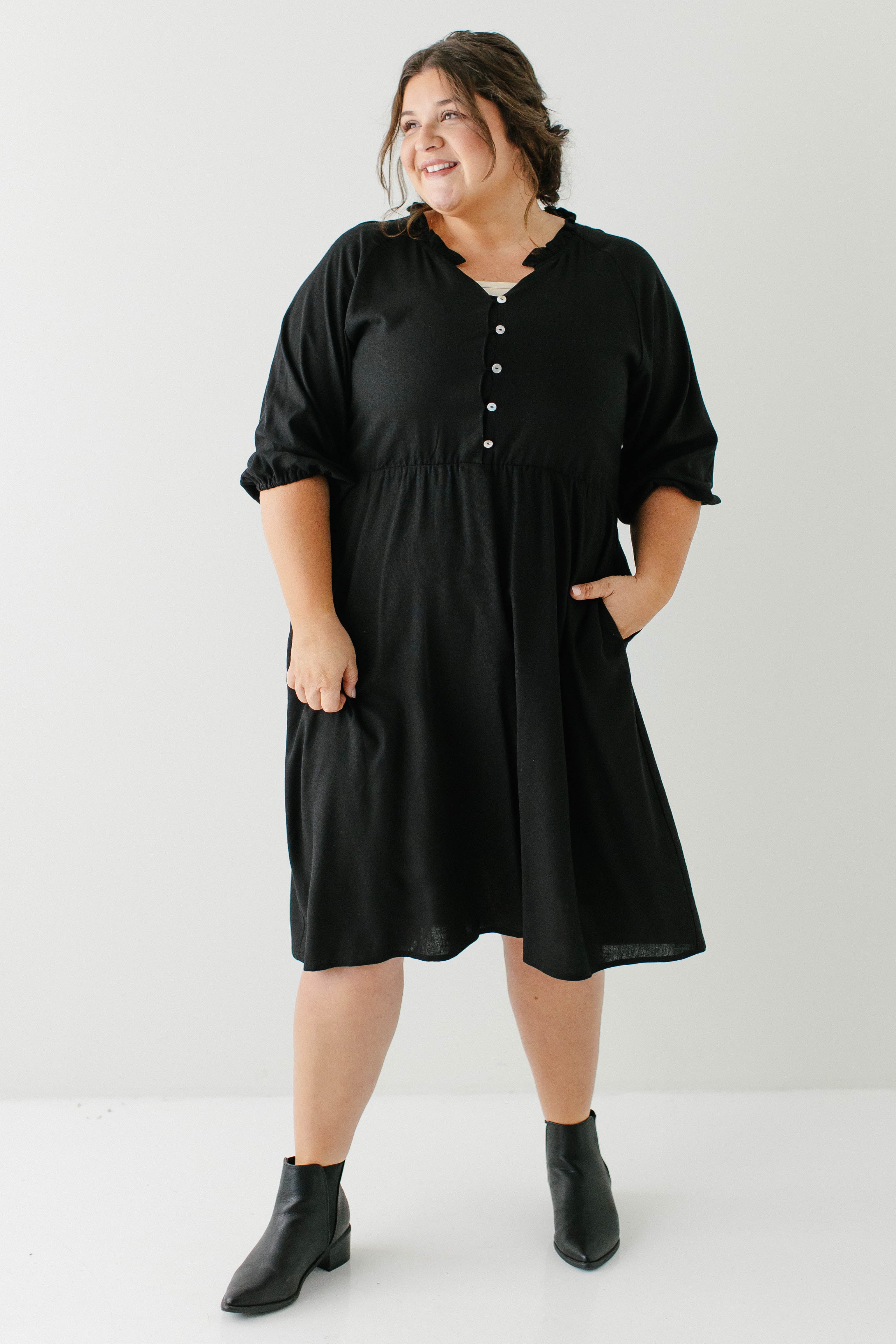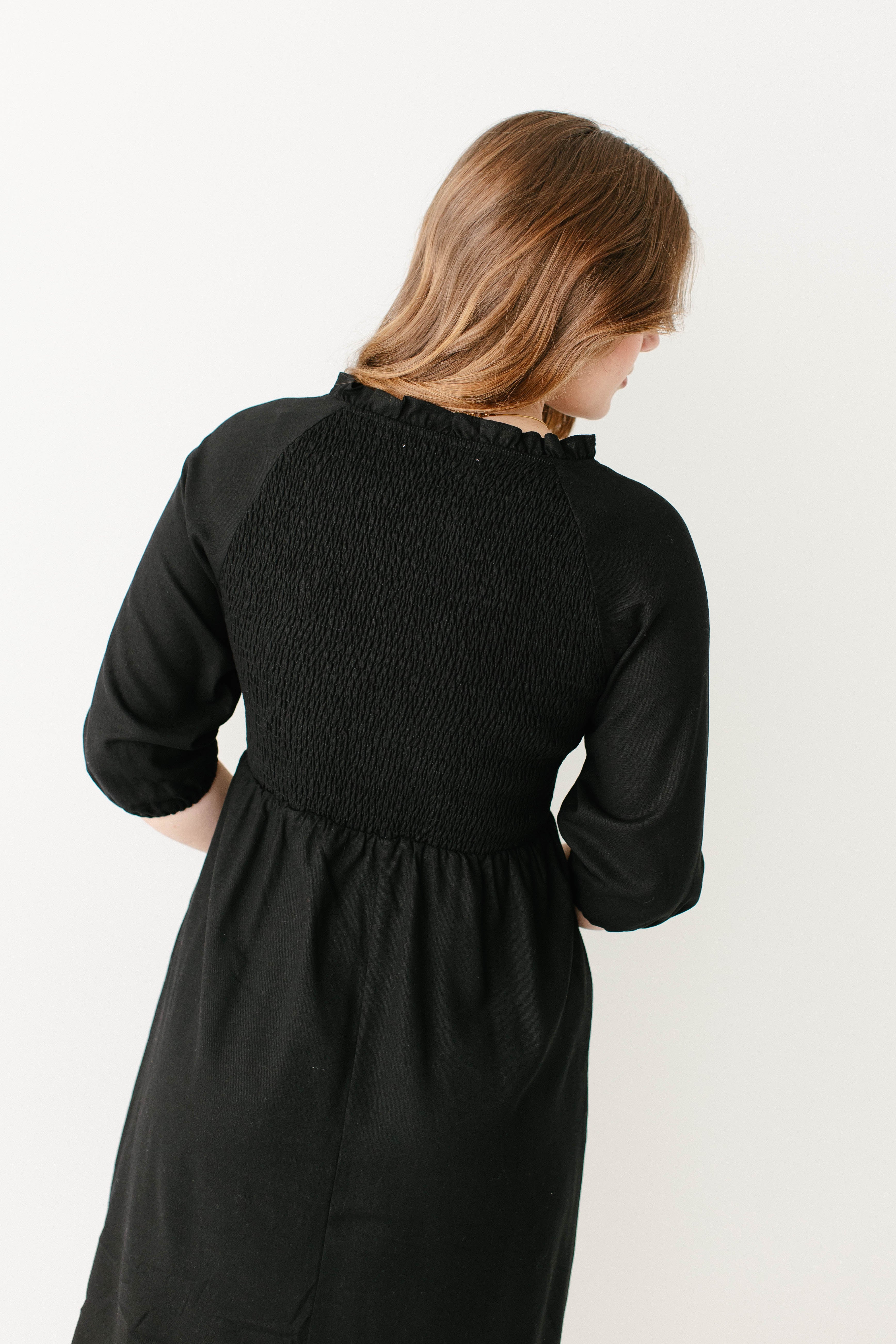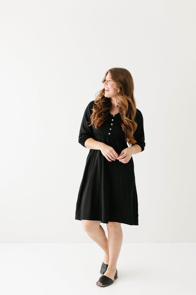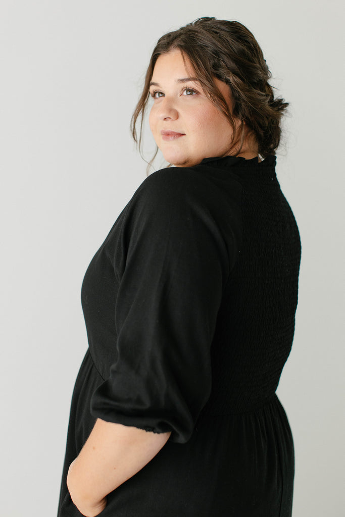 Introducing the 'Kenzi' Ruffle Detail Knee Length Dress, the cutest little black dress! Featuring a ruffled modest v-neckline, functional buttons, ¾ elastic sleeves, and smocking on the back, this dress is full of the cutest feminine details that will ensure the most flattering fit. Pair the ‘Kenzi’ with your favorite jacket or cardigan for the chilly months, or wear with a light sweater for the warmer days. Exclusively designed by us with you in mind.