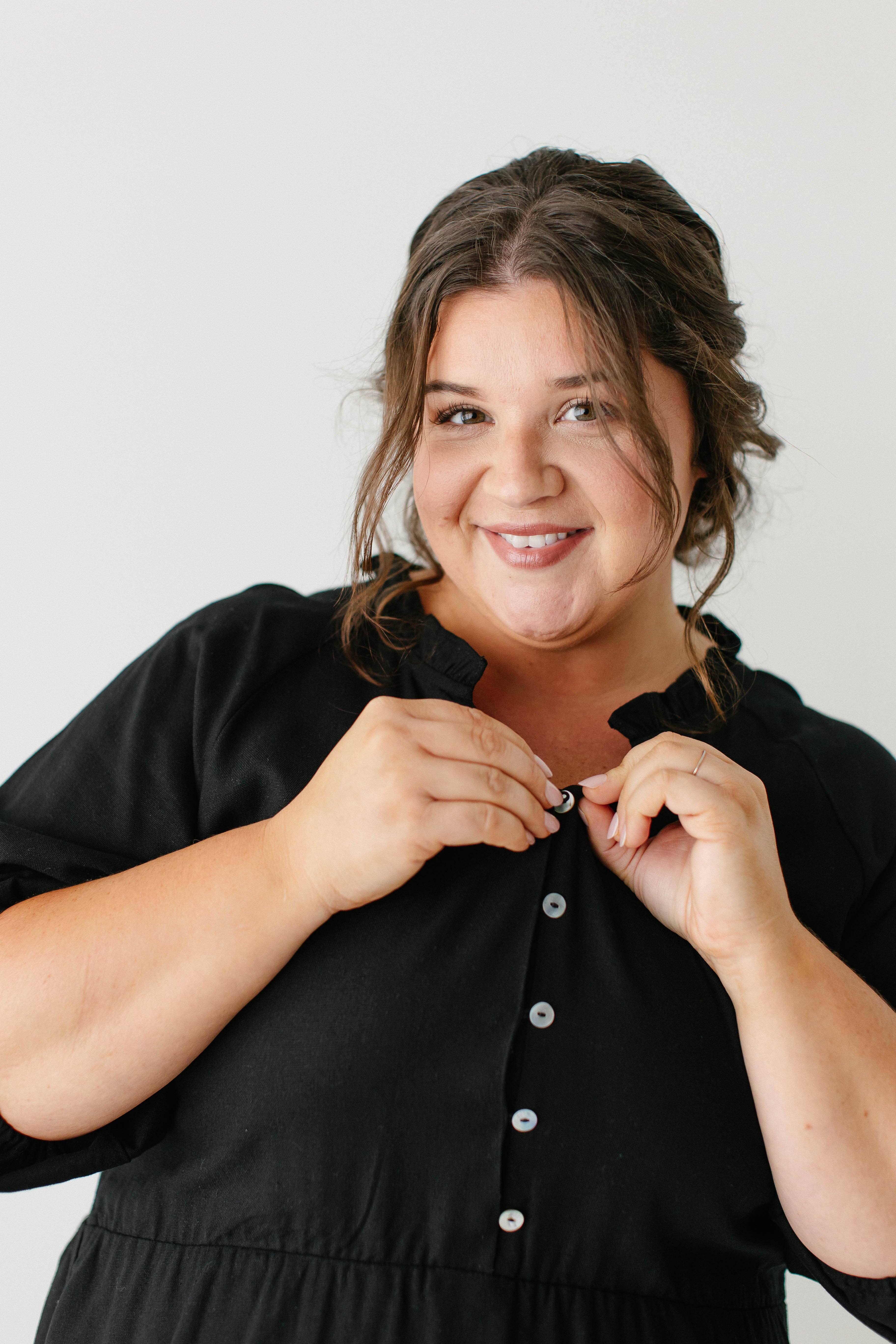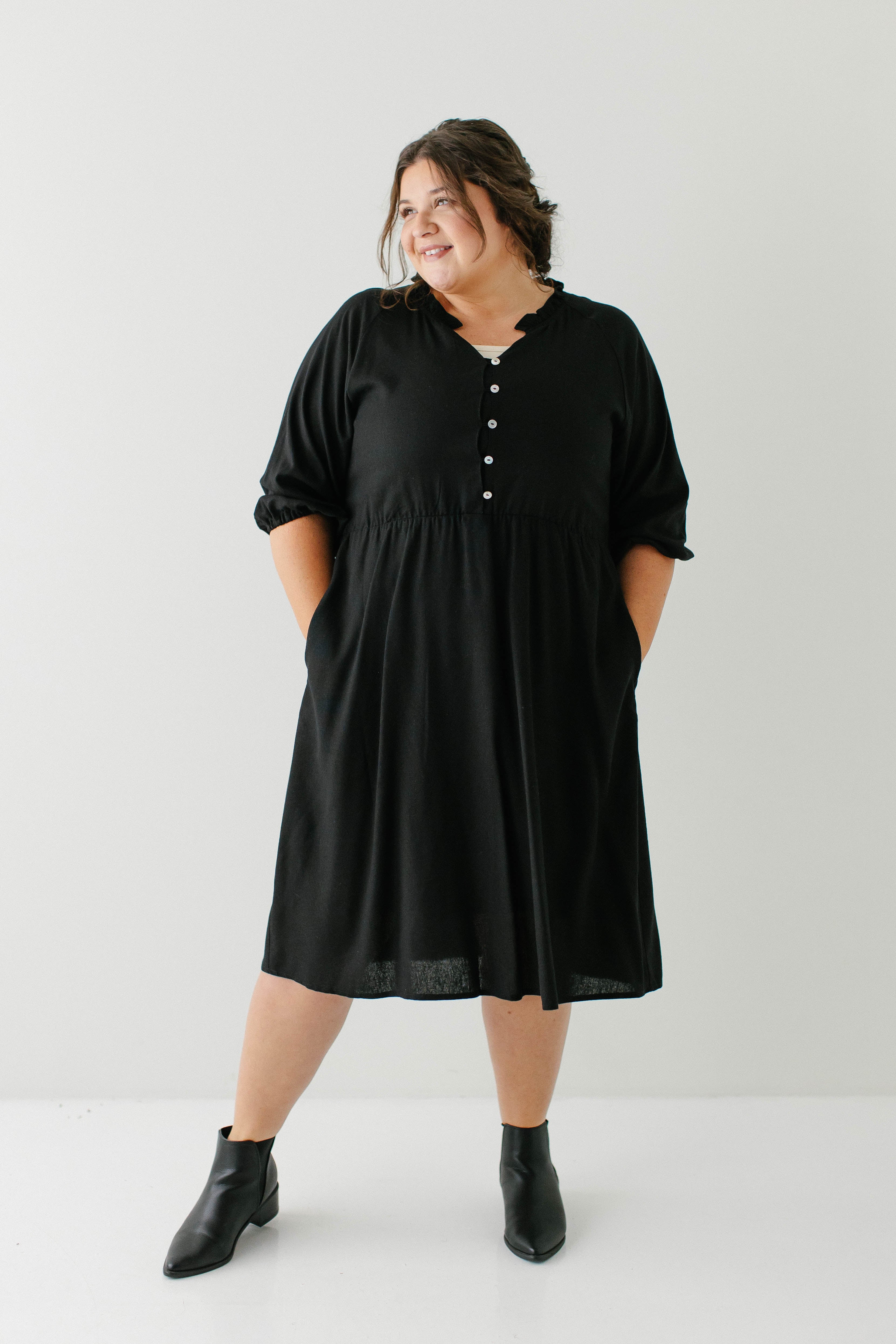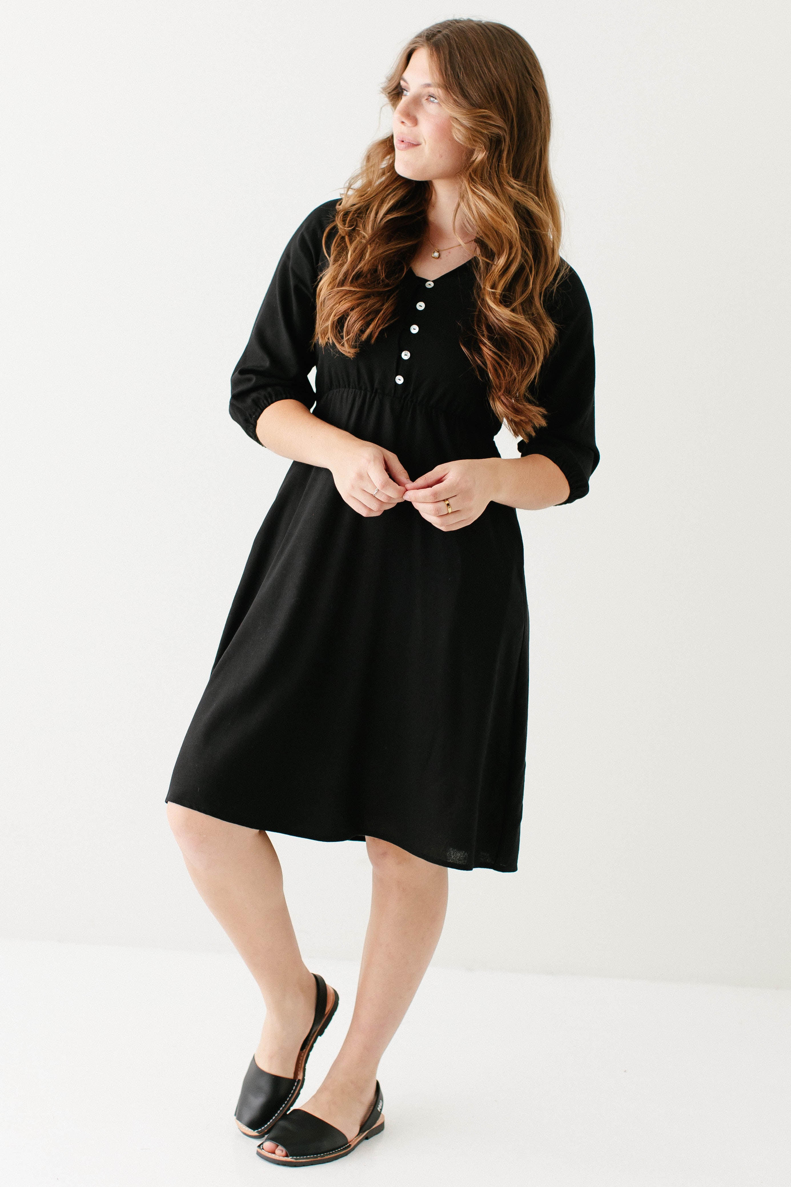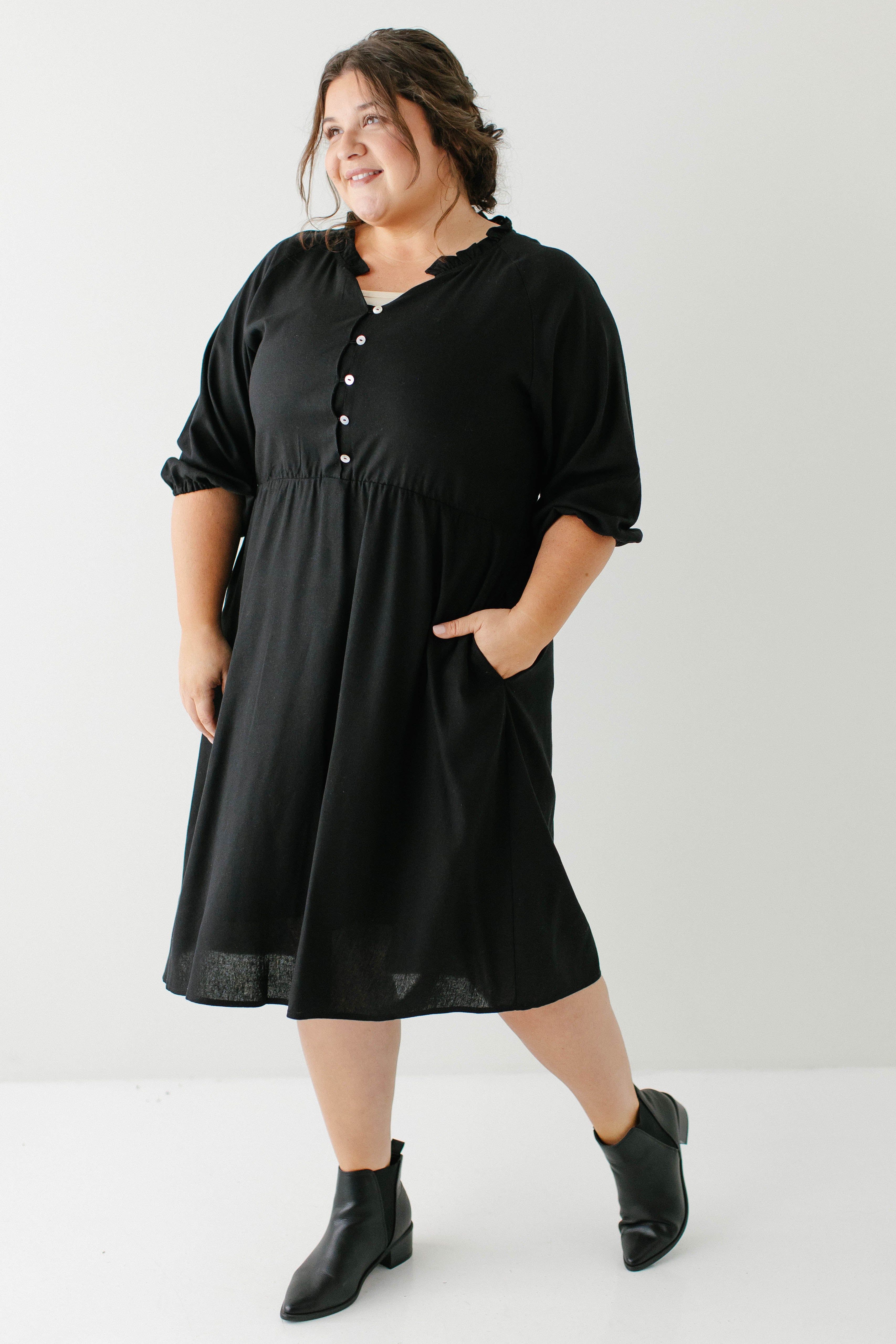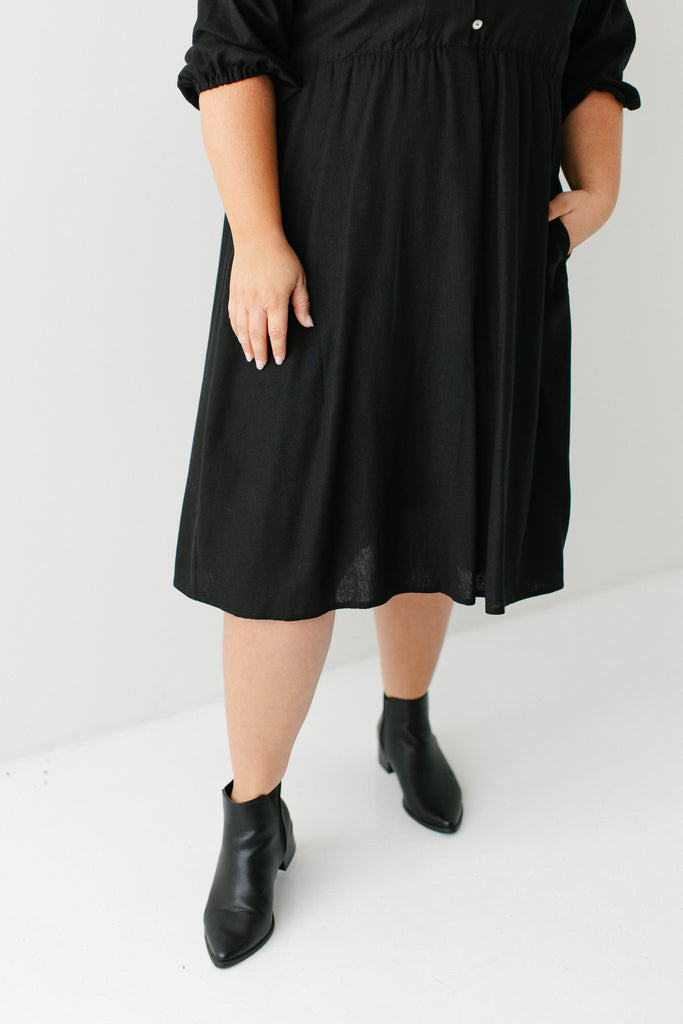 Introducing the 'Kenzi' Ruffle Detail Knee Length Dress, the cutest little black dress! Featuring a ruffled modest v-neckline, functional buttons, ¾ elastic sleeves, and smocking on the back, this dress is full of the cutest feminine details that will ensure the most flattering fit. Pair the ‘Kenzi’ with your favorite jacket or cardigan for the chilly months, or wear with a light sweater for the warmer days. Exclusively designed by us with you in mind.