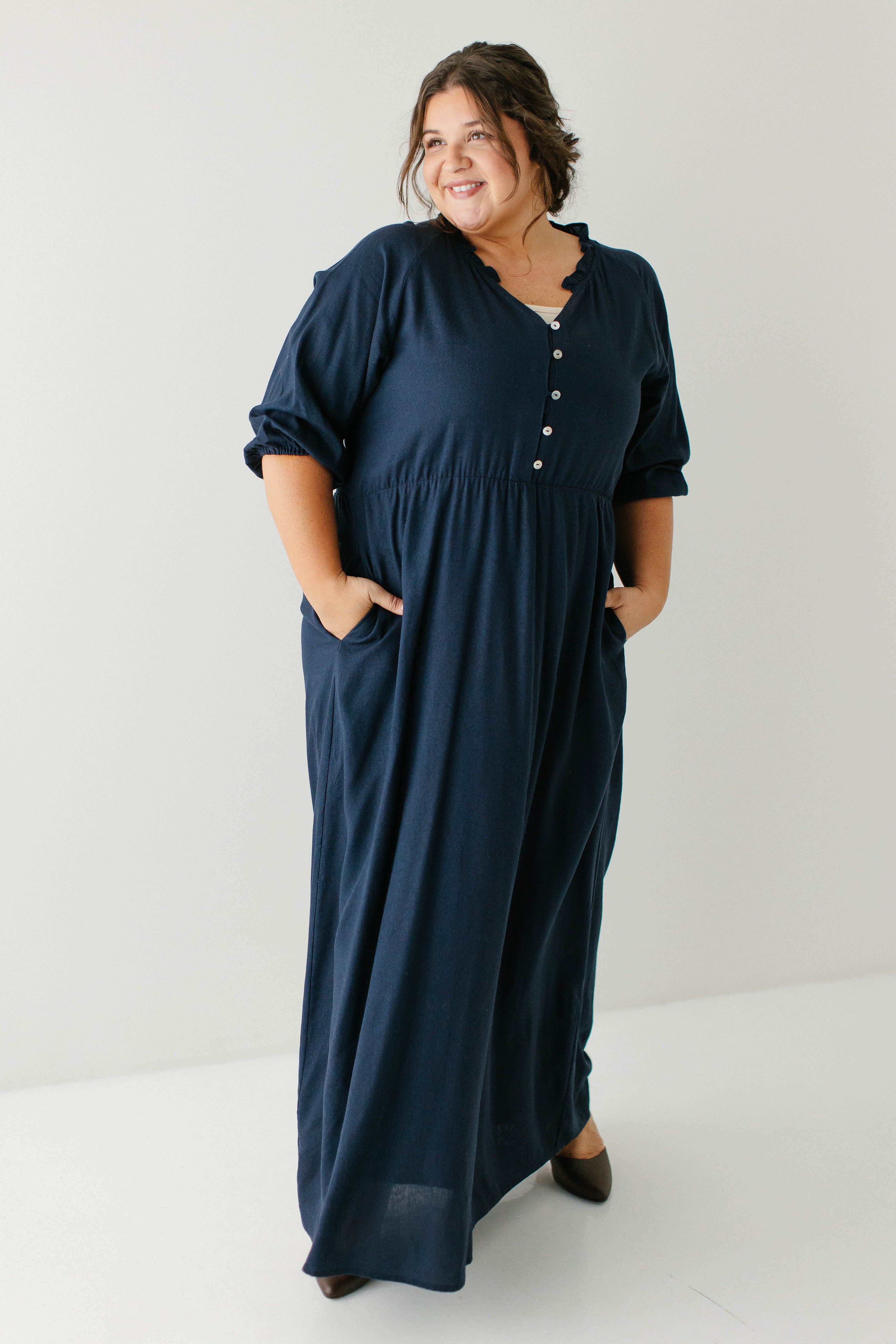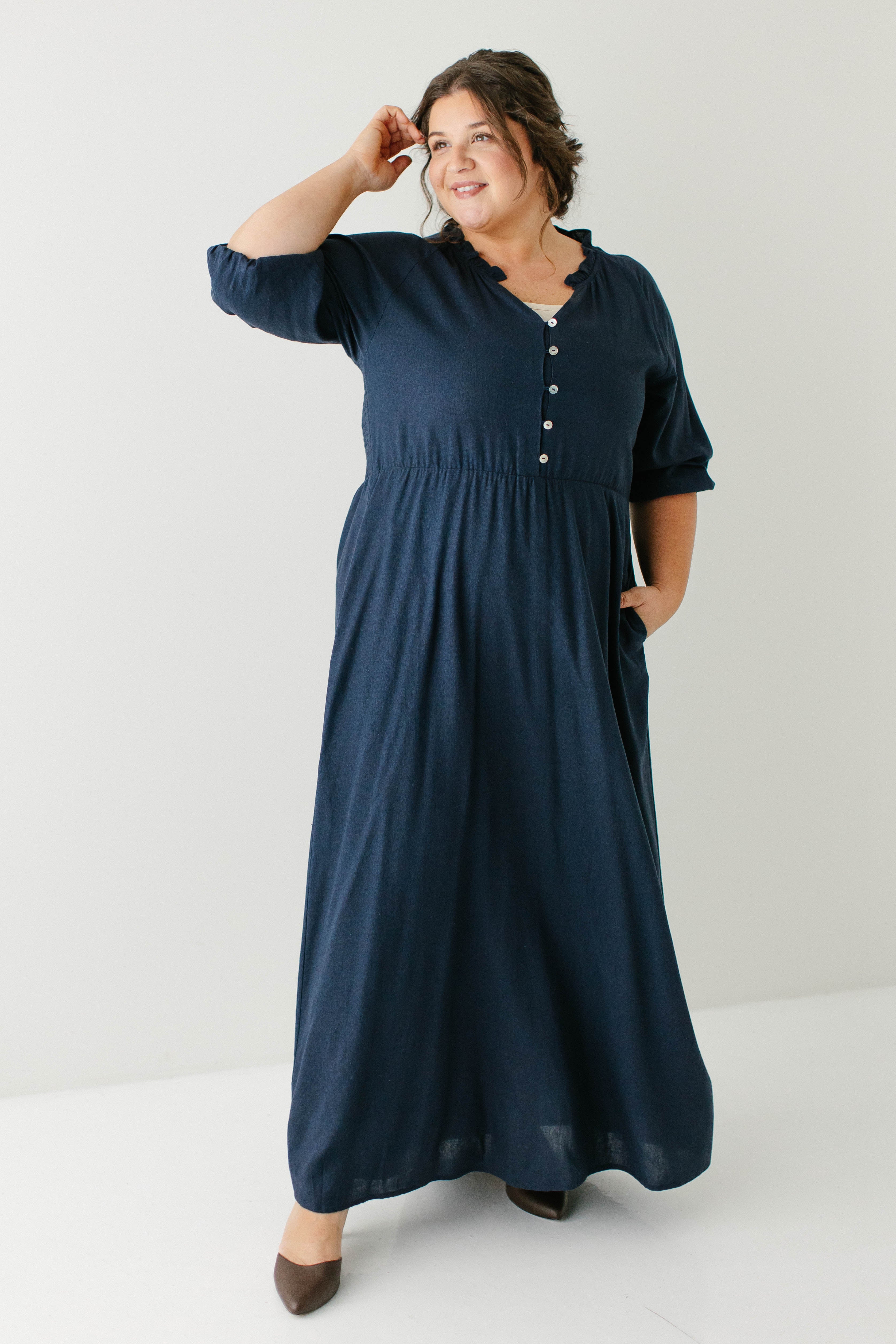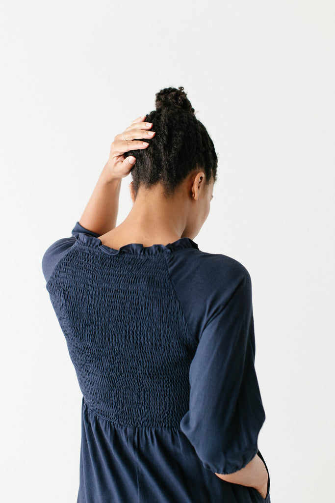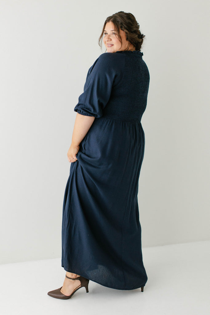 Introducing the 'Kenzi' Ruffle Detail Maxi Dress, the cutest navy maxi dress! Featuring a ruffled modest v-neckline, functional buttons, ¾ elastic sleeves, and smocking on the back, this dress is full of the cutest feminine details that will ensure the most flattering fit. Pair the ‘Kenzi’ with your favorite jacket or cardigan for the chilly months, or wear with a light sweater for the warmer days. Exclusively designed by us with you in mind.
