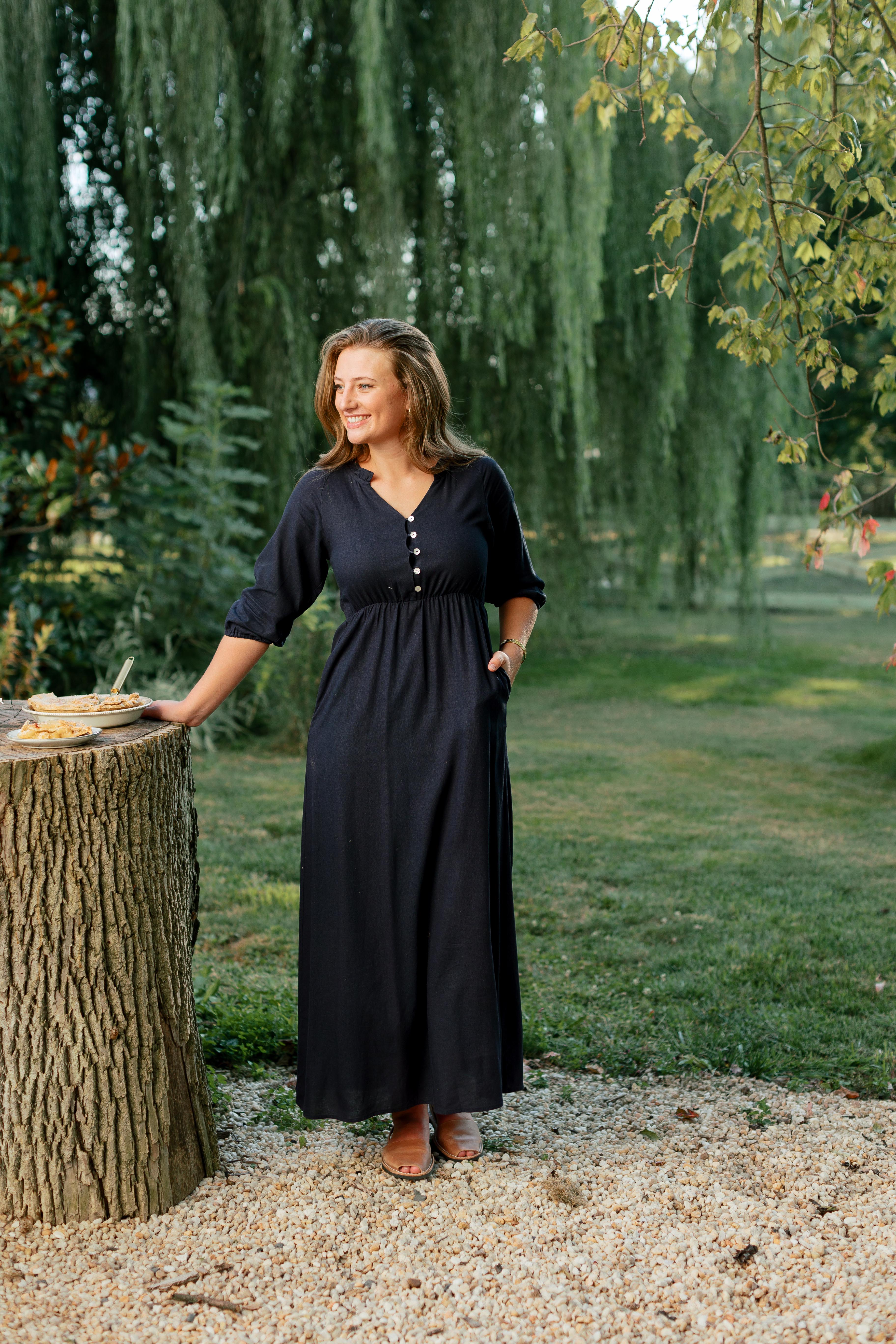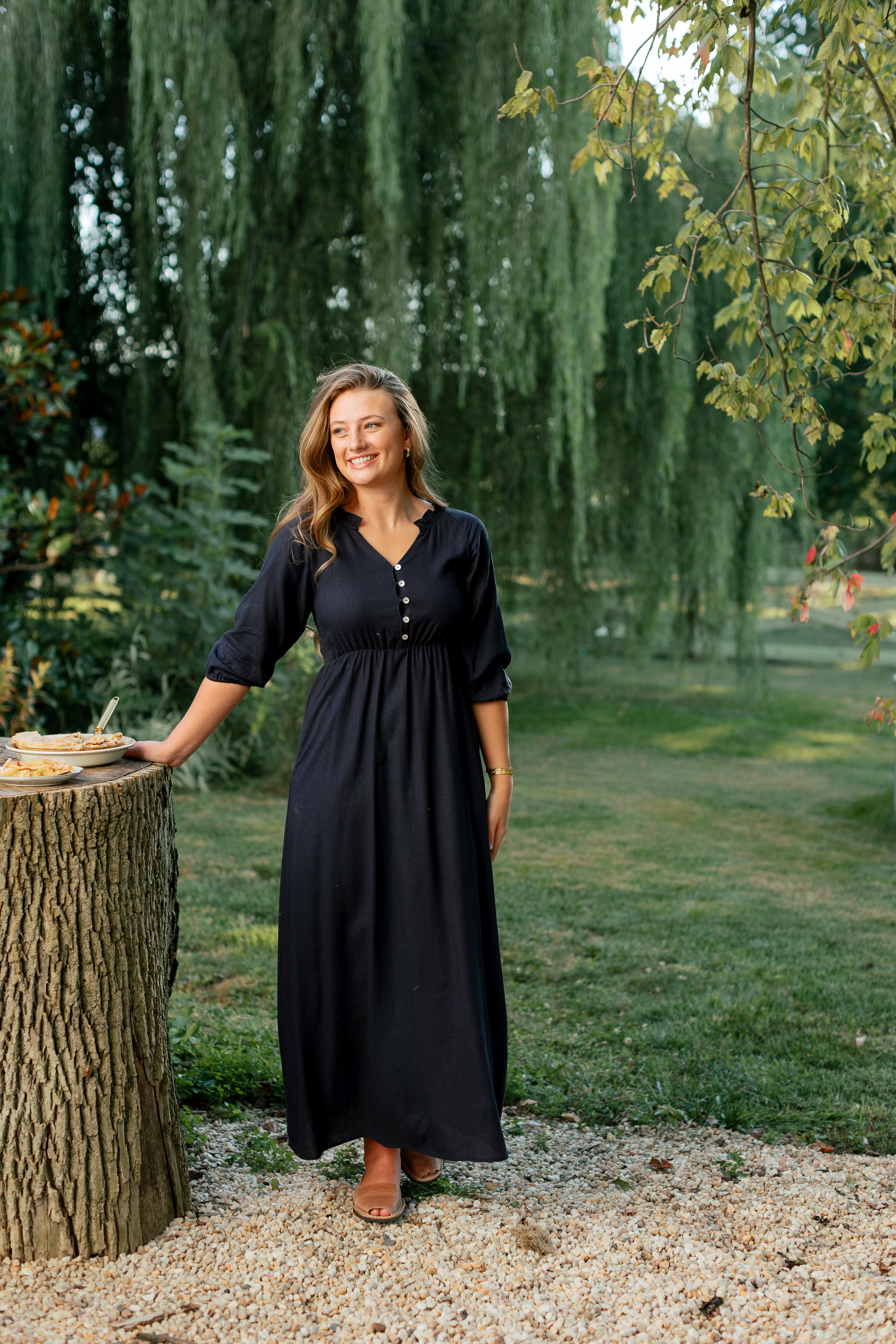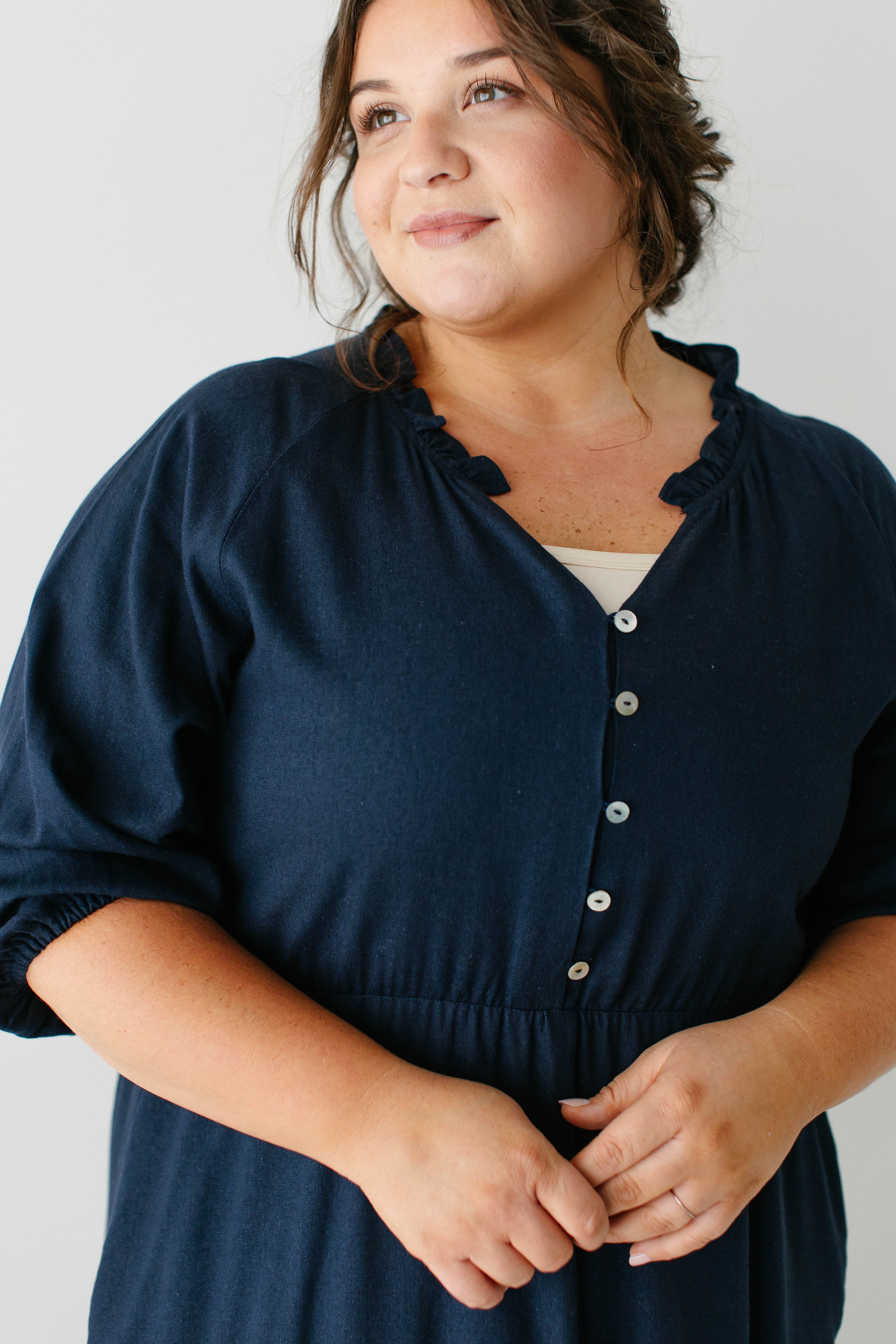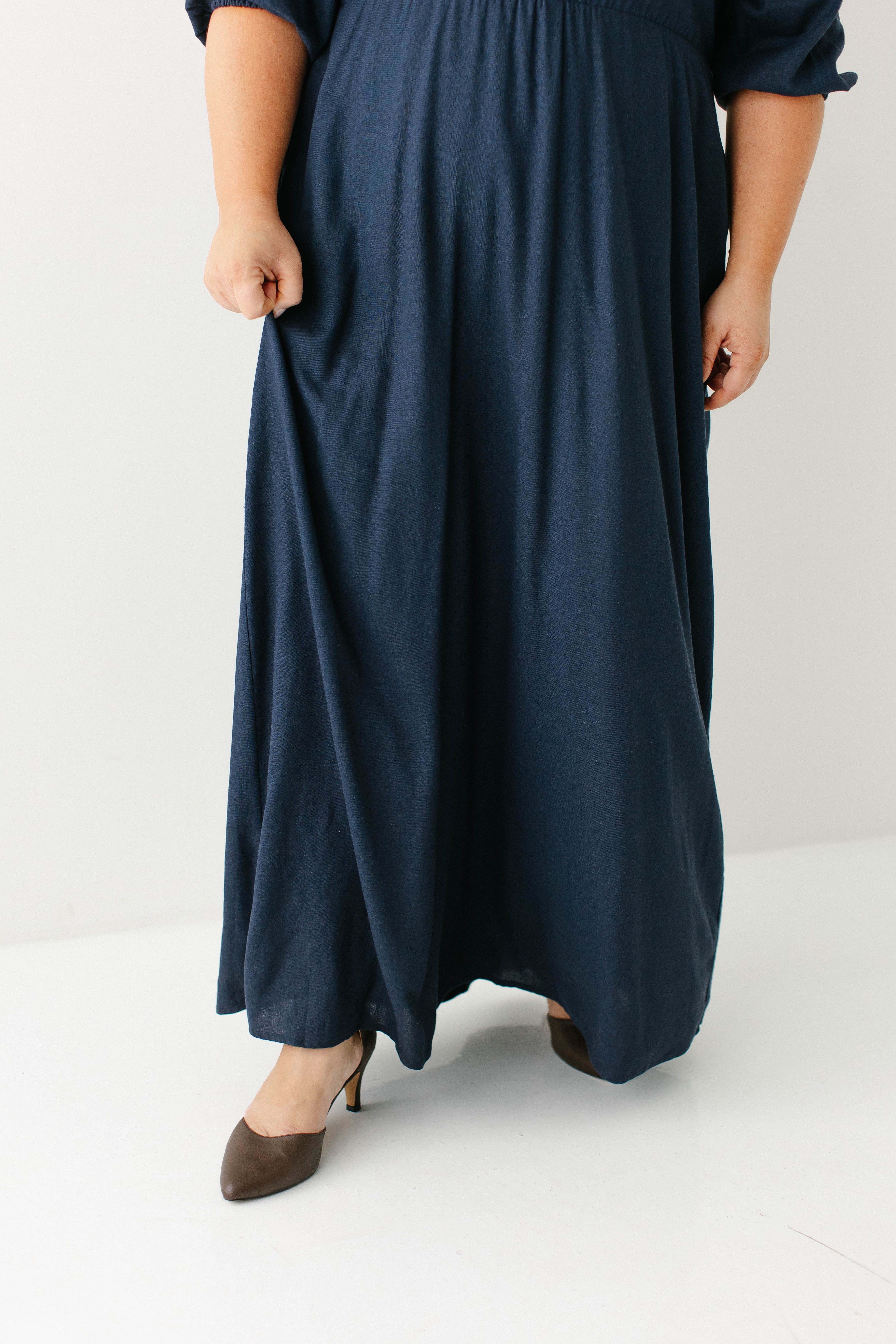 Introducing the 'Kenzi' Ruffle Detail Maxi Dress, the cutest navy maxi dress! Featuring a ruffled modest v-neckline, functional buttons, ¾ elastic sleeves, and smocking on the back, this dress is full of the cutest feminine details that will ensure the most flattering fit. Pair the ‘Kenzi’ with your favorite jacket or cardigan for the chilly months, or wear with a light sweater for the warmer days. Exclusively designed by us with you in mind.