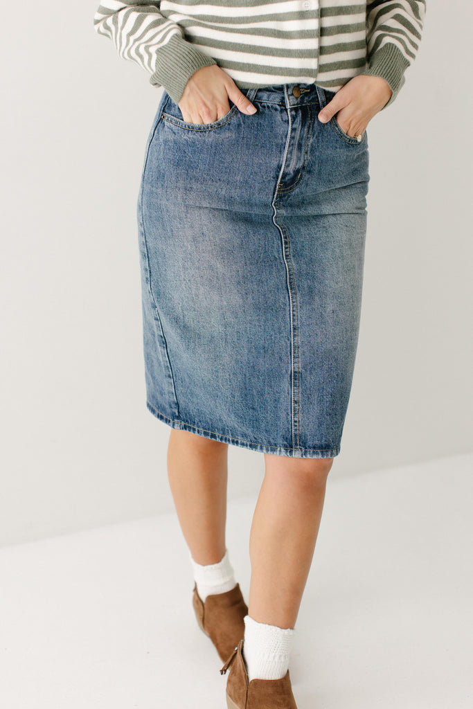 The 'Kyra' is one of our own exclusive denim skirts. Designed with everyday wear in mind, this skirt will pair well with just about any casual top in your wardrobe! This denim skirt is 100% cotton and does not have any stretch, giving it a vintage vibe we love! Every woman needs a classic, straight denim skirt in her closet, and this skirt is an excellent, durable choice! Available in light or vintage wash.