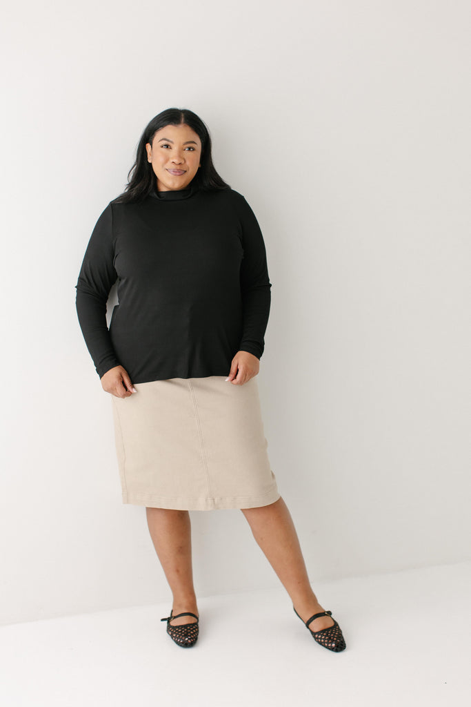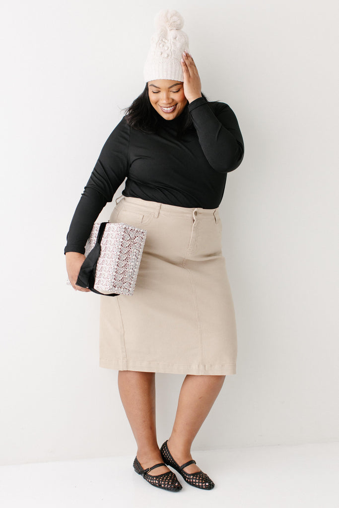 Jean skirts do not have to only be in denim! Introducing the ‘Leah’ Knee Length Stretch Denim Skirt, which comes in a classy khaki color, perfect for all your professional needs. The simplicity of the ‘Leah’ allows for easy styling and the button fly allows for extra stylish flair. Pair with a simple blouse for a modest outfit for work. Exclusively designed by us with you in mind.
