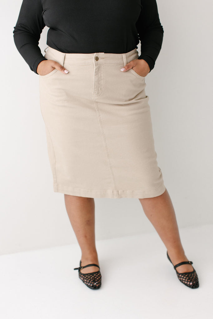 Wearing the 'Leah' Knee Length Stretch Denim Skirt in Khaki with the 'Tiffany' Linen Blend Button Down Top