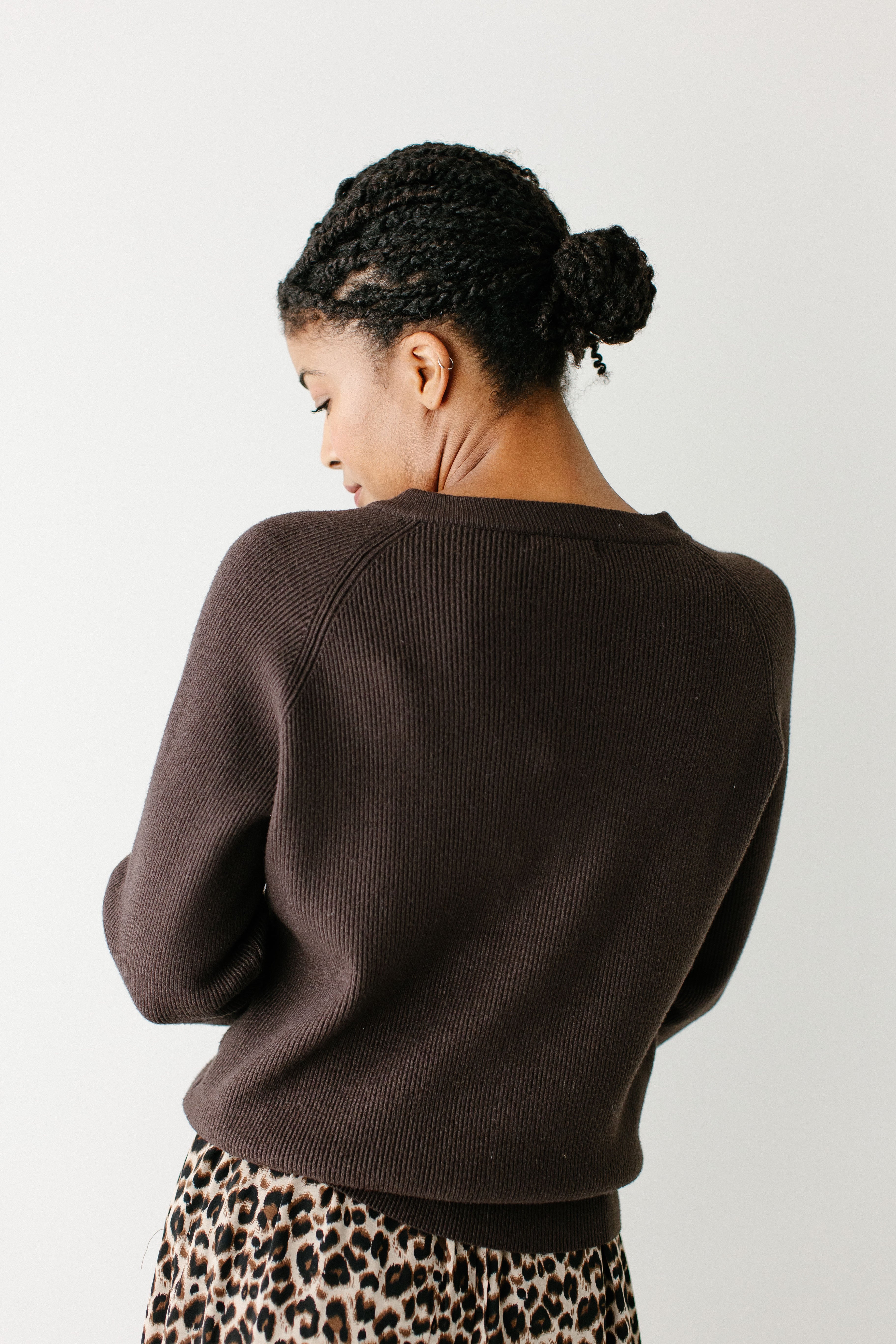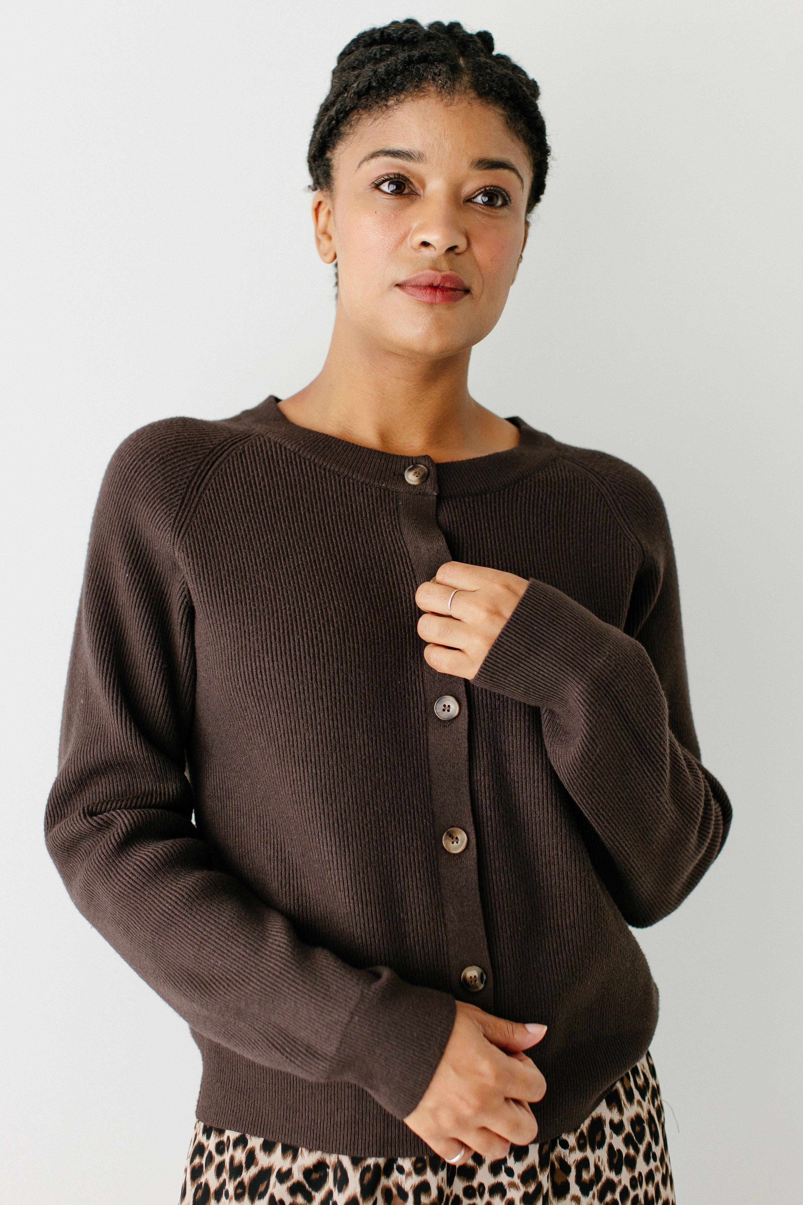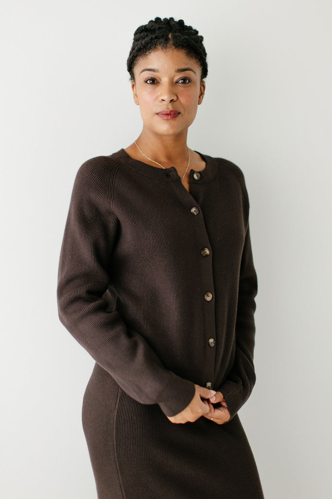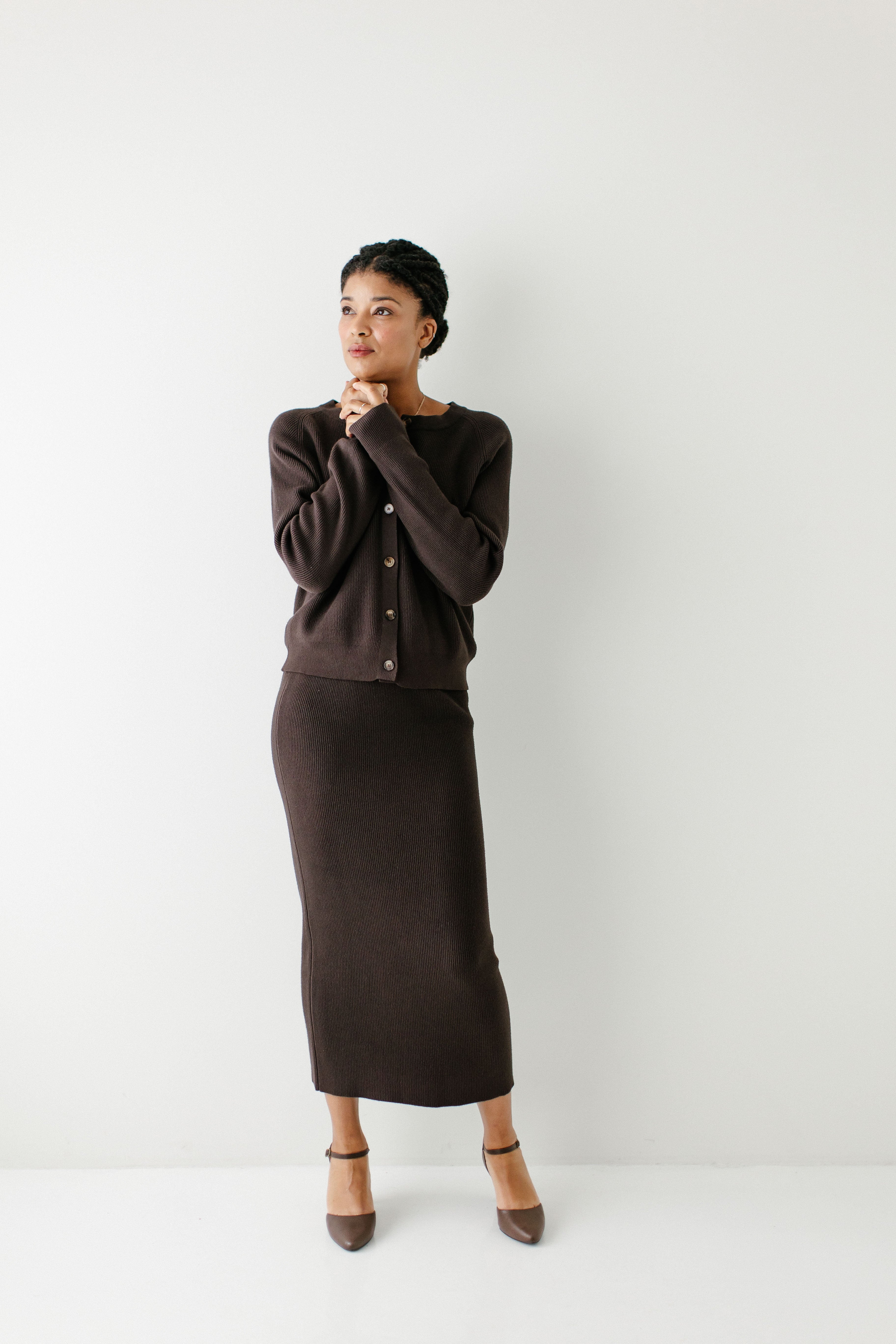 A perfect sweater that is versatile and beautiful - the 'Legacy' Ribbed Button Down Cardigan! A raglan sleeve style made with a classic ribbed detail in a rich chocolate brown shade, the opportunities truly are endless! Pair the ‘Legacy’ with it’s matching skirt or layer over your favorite dress for a cozy autumn look.