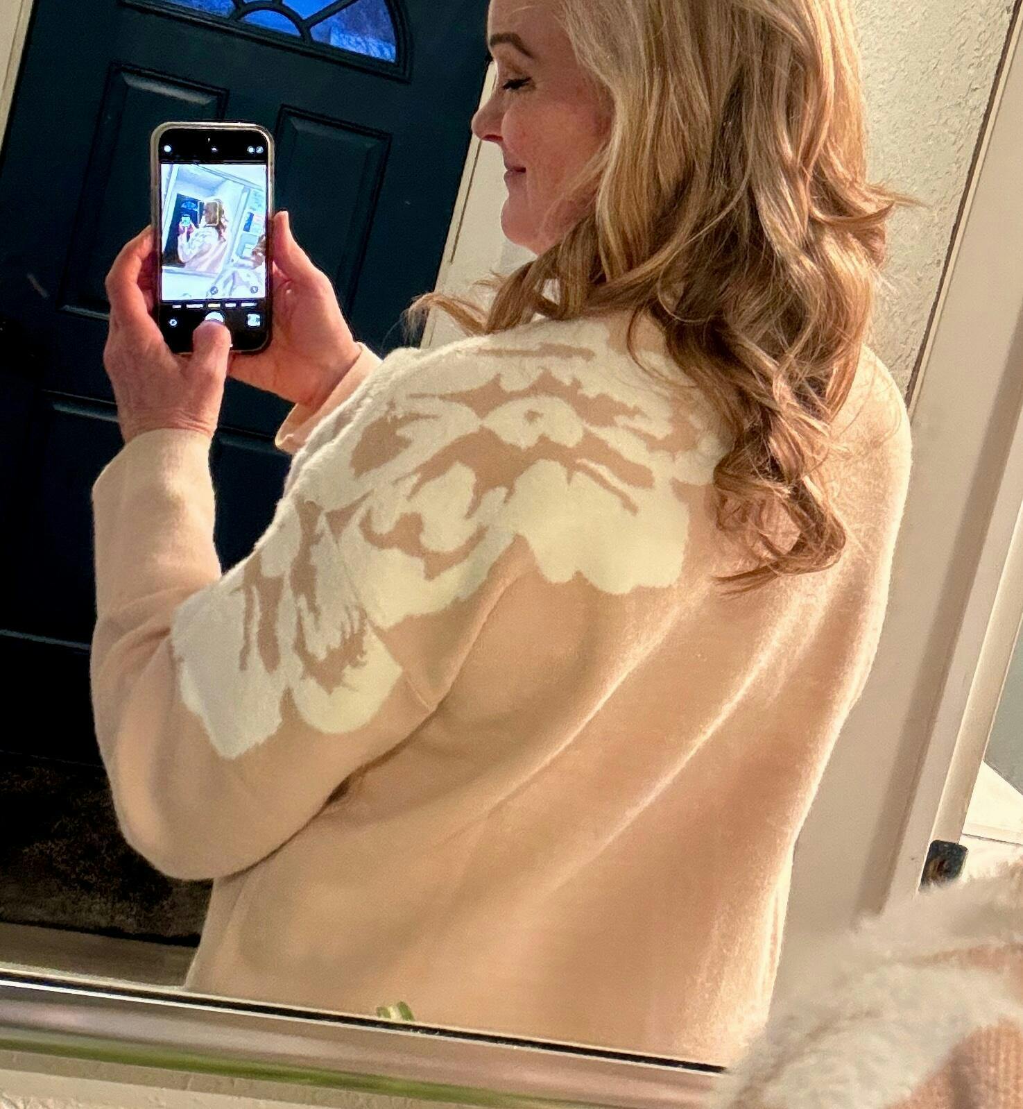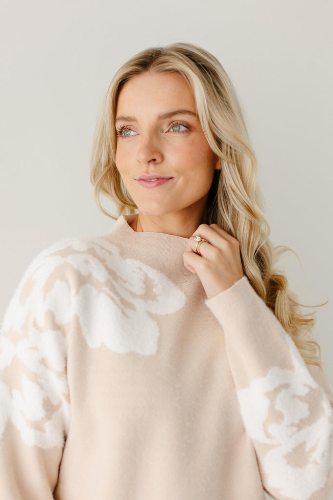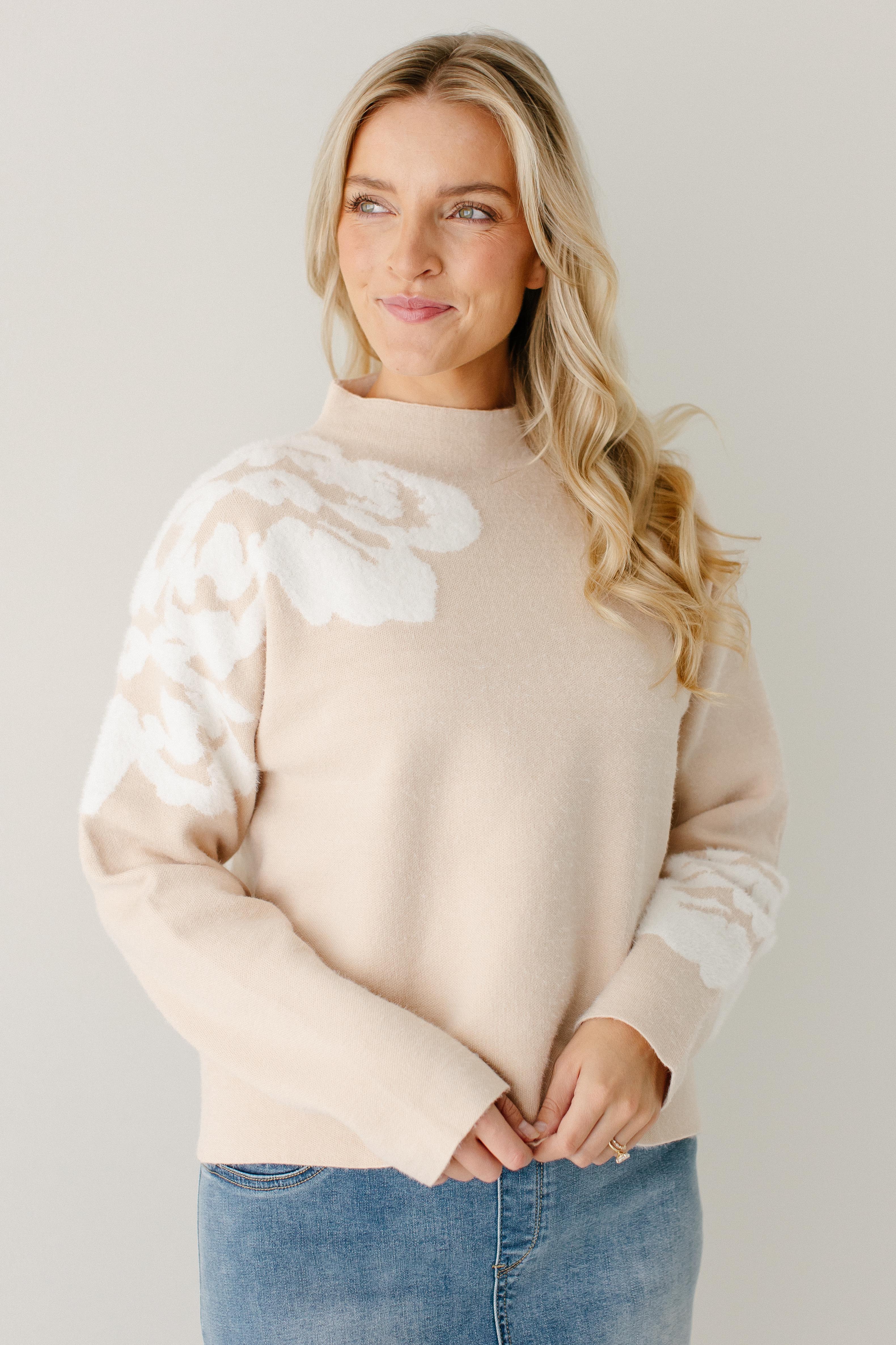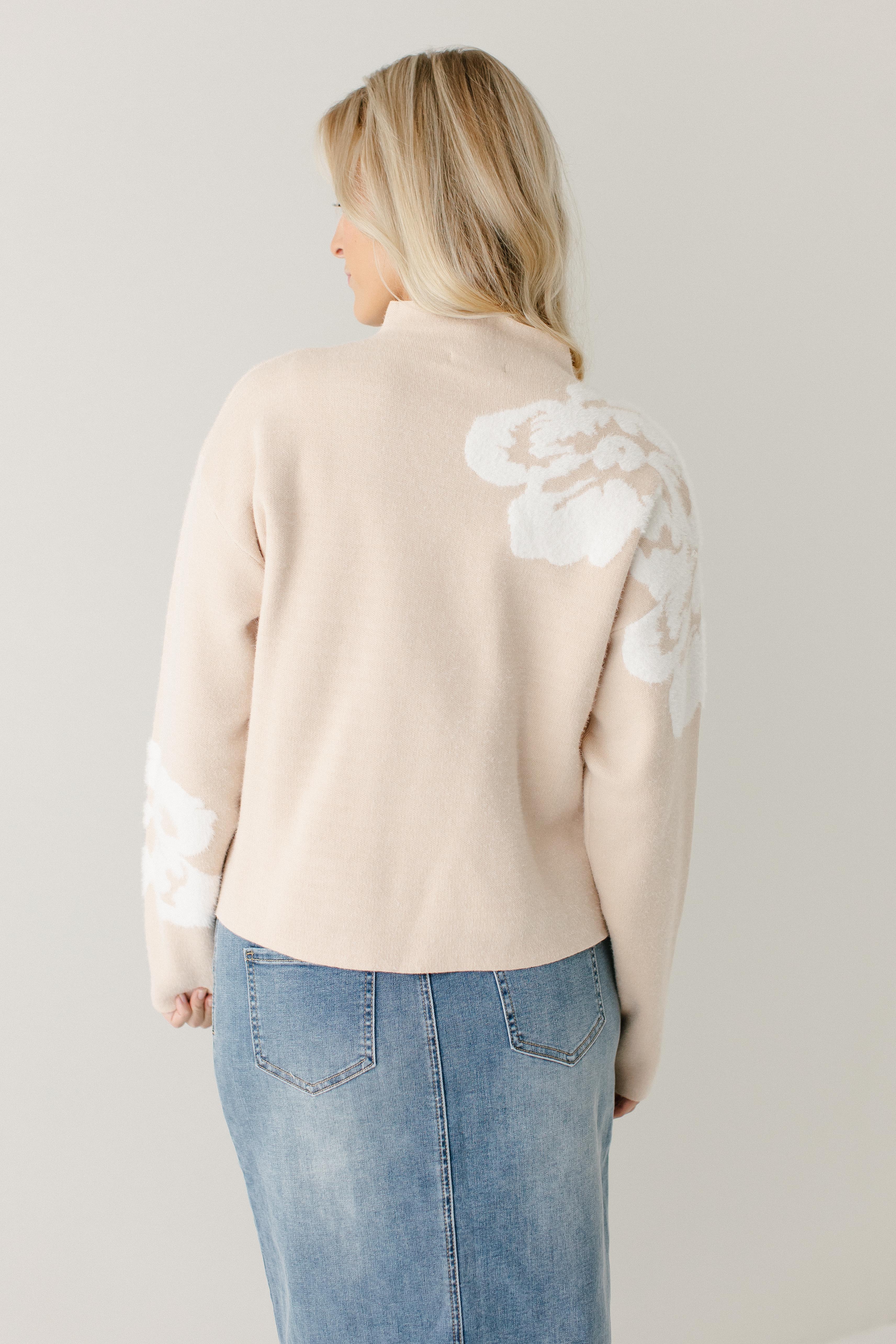 Get ready for Thanksgiving dinner with the 'Lorna' Flower Detail Mock Neck Sweater! This sweater is made out of luxuriously soft knit fabric with the cutest fuzzy floral design on the shoulder and sleeve, and the slightly cropped style pairs perfectly with your favorite high-waisted skirt. Dress the ‘Lorna’ up or down, with your favorite denim or knit skirt!