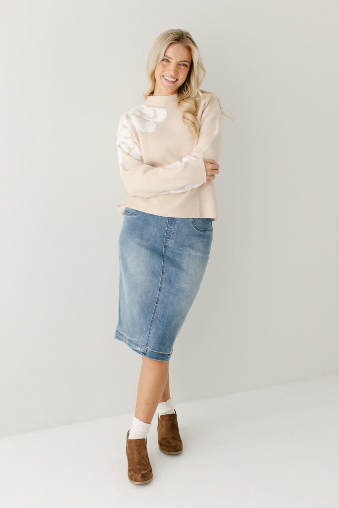 Model wearing the 'Lorna' Flower Detail Mock Neck Sweater with the 'Sara' Classic Knee Length Skirt in Medium Wash in 29"