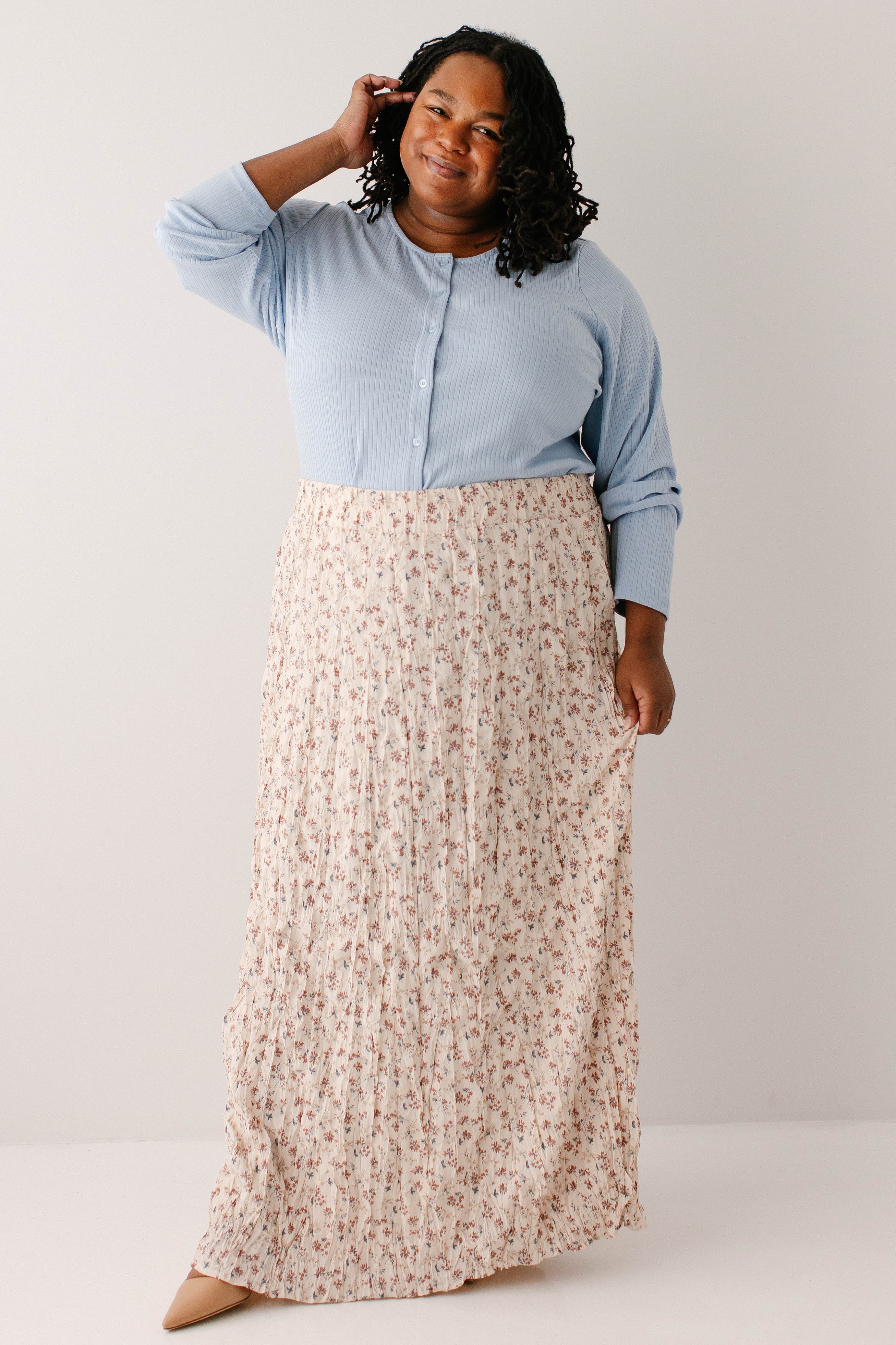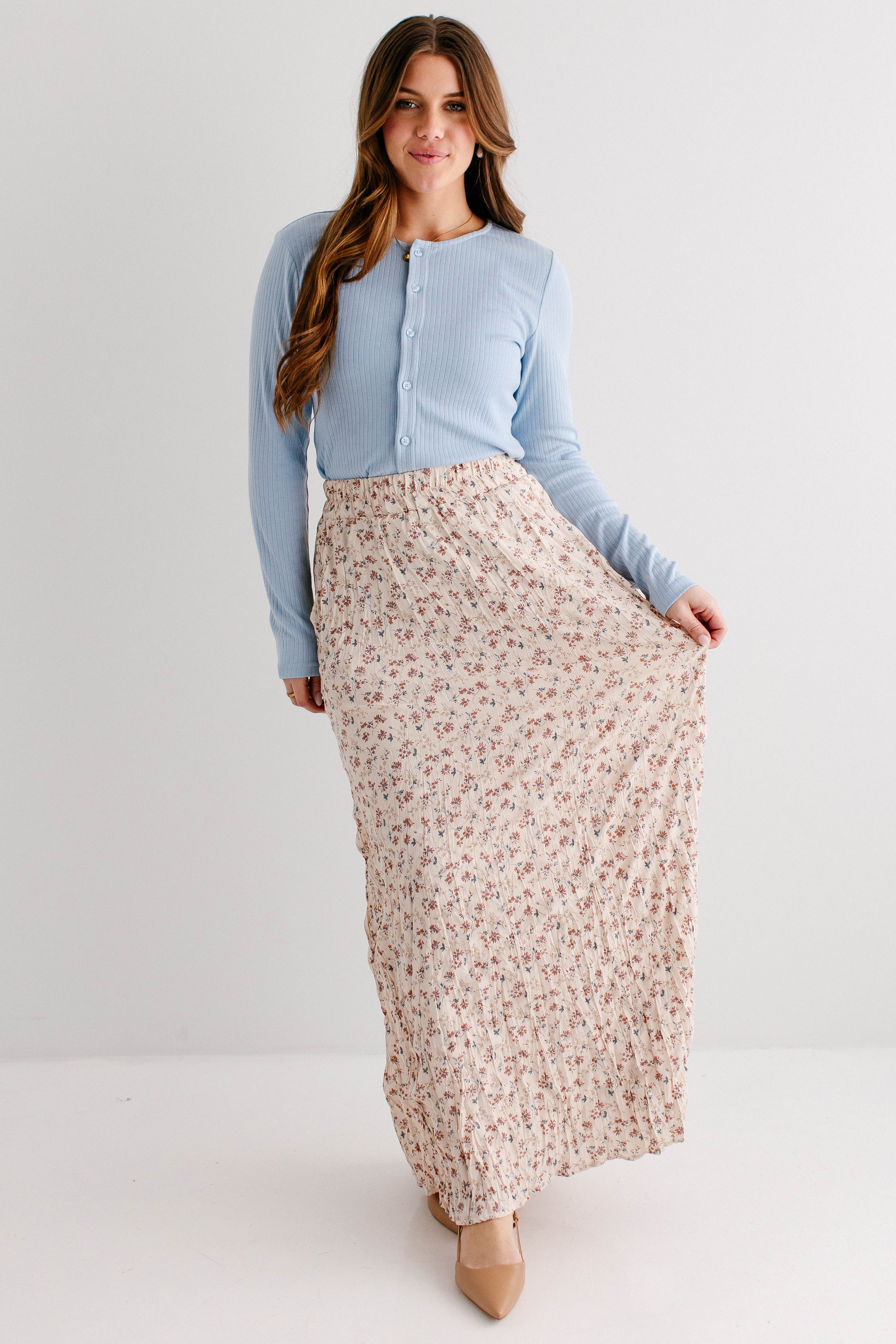 Model wearing the 'Buttercup' Pointelle Knit Button Down Top in Sky Blue with the 'Lotus' Floral Print Maxi Skirt