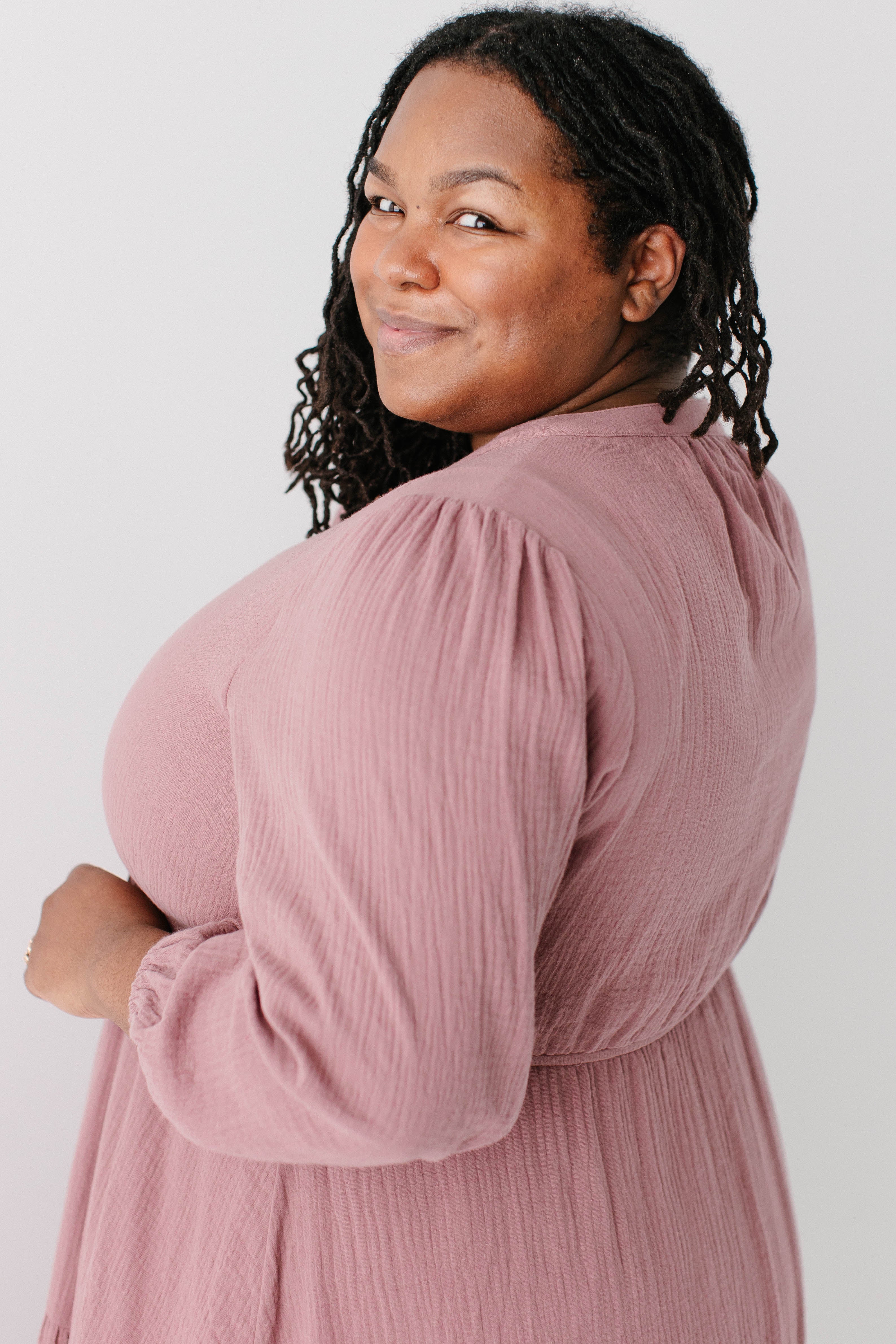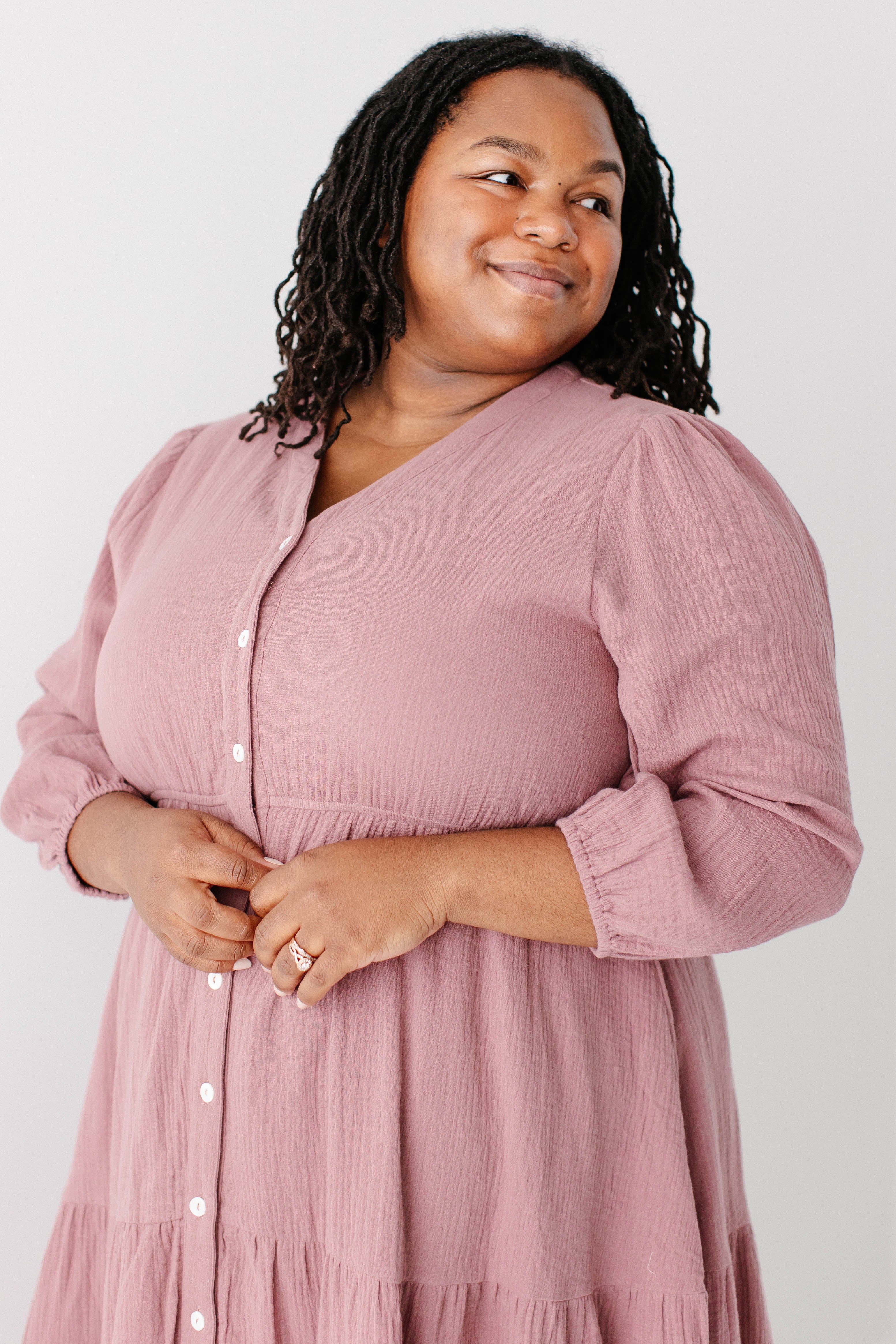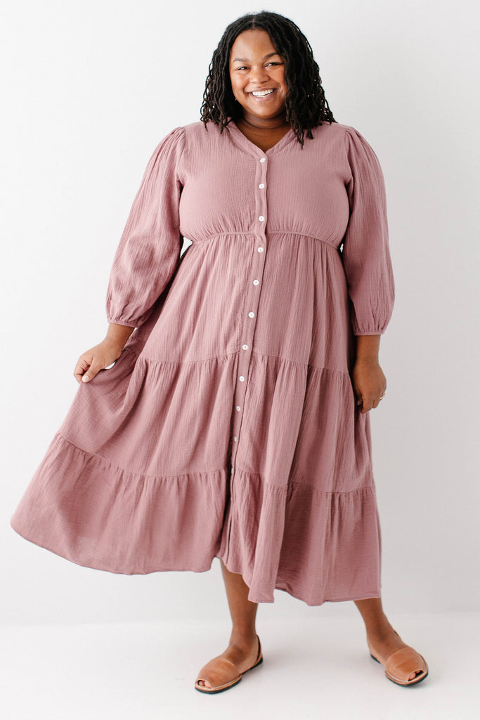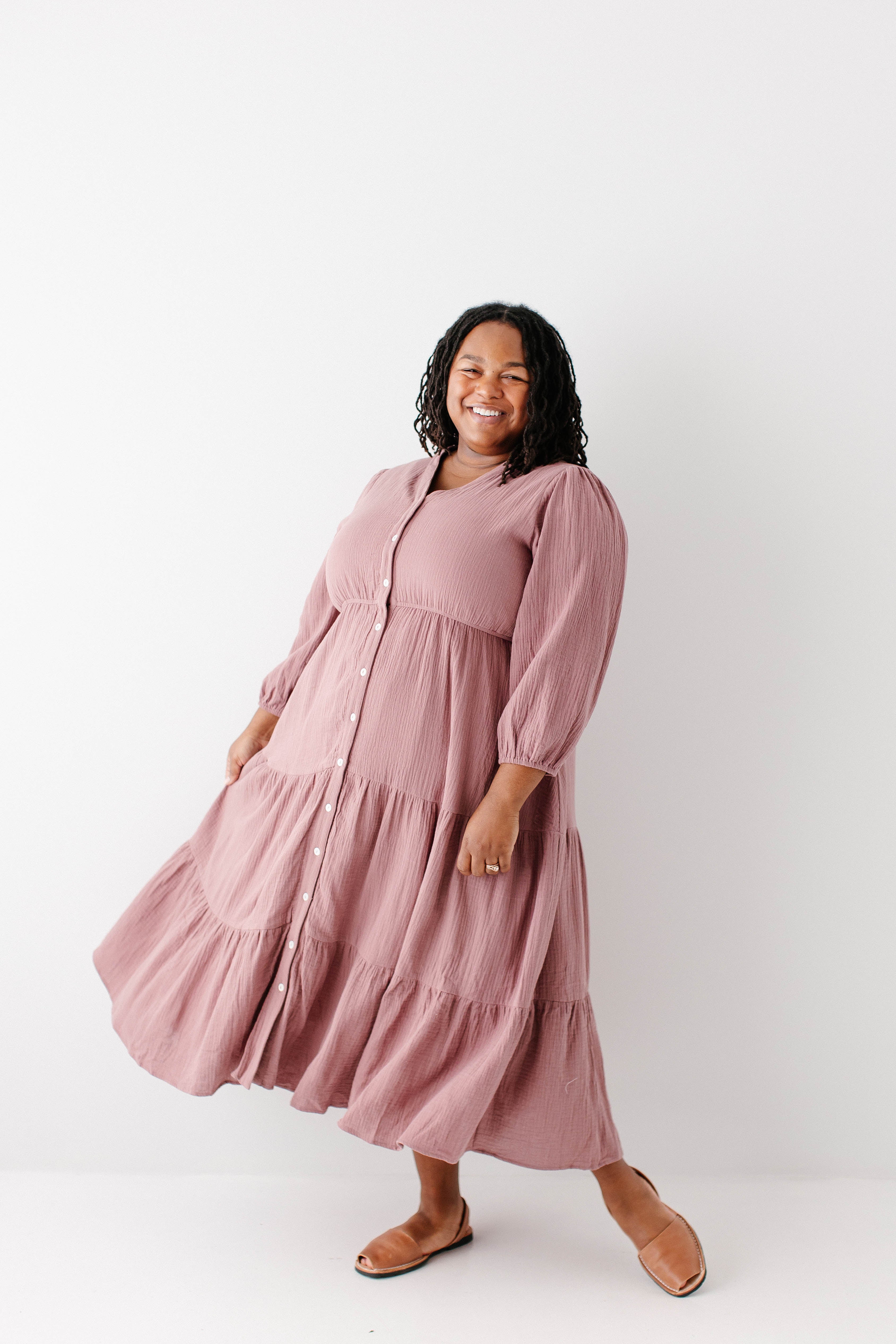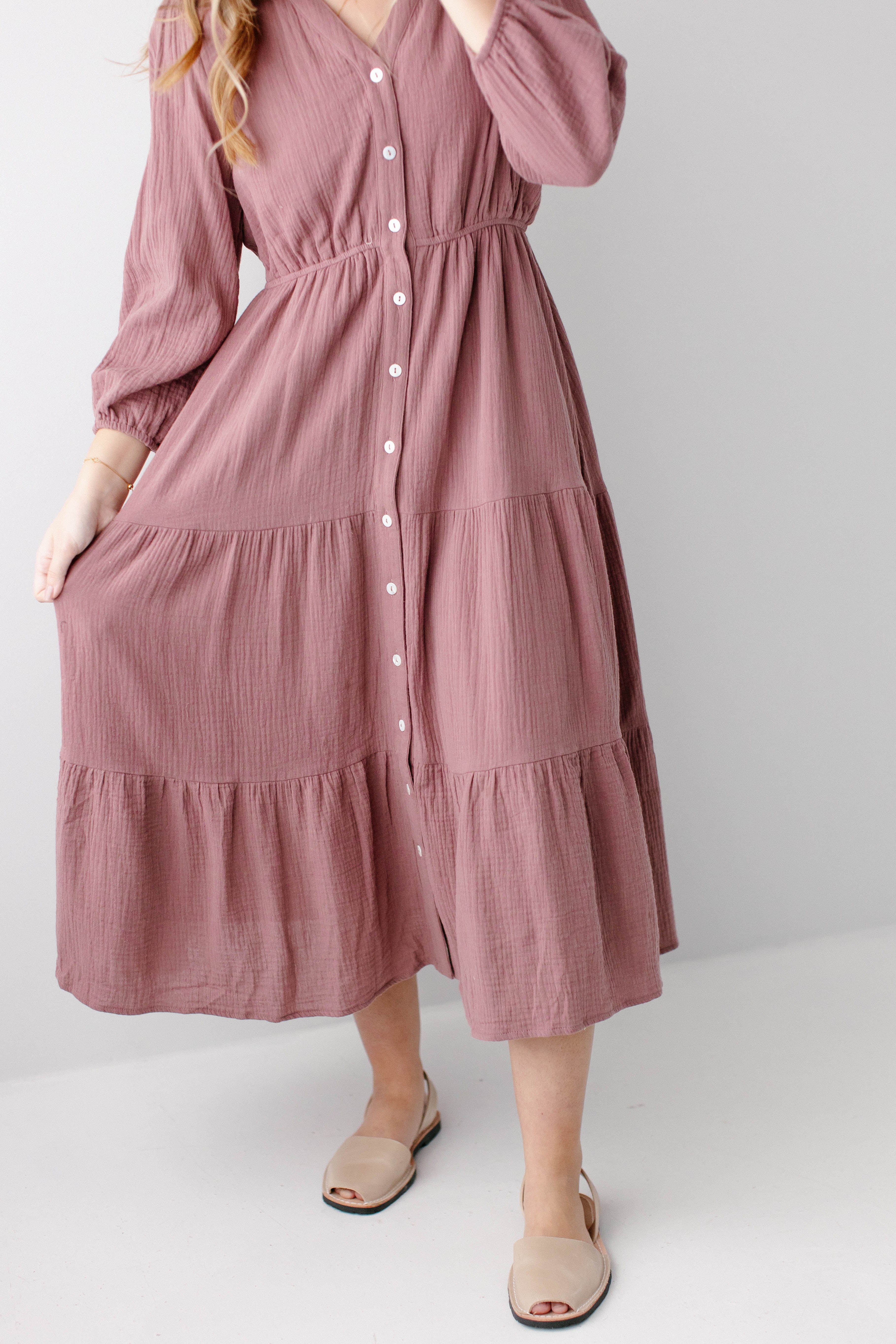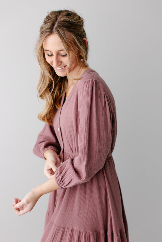 There are so many things to love about the ‘Louisa’ dress - ¾ length sleeves with elastic at the bottom, modest V-neck, nursing friendly buttons with hooks between the bodice for full coverage, cotton gauze outer layer with a breathable cotton lining, and tiered A-line style skirt - all in a beautiful, dusty mauve shade that transitions well between seasons. Exclusively designed by us with you in mind.