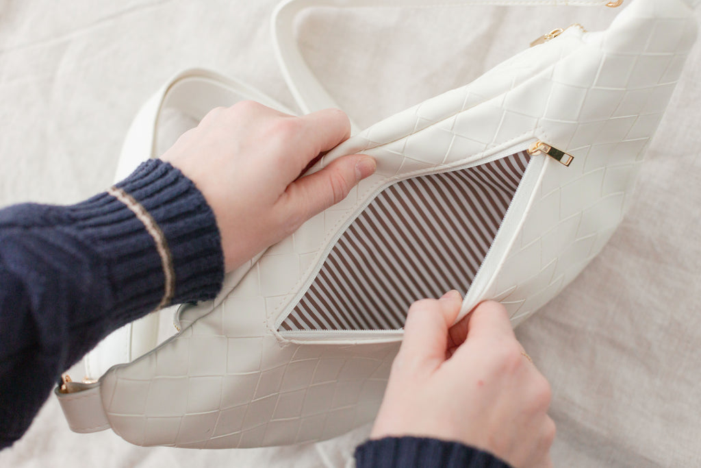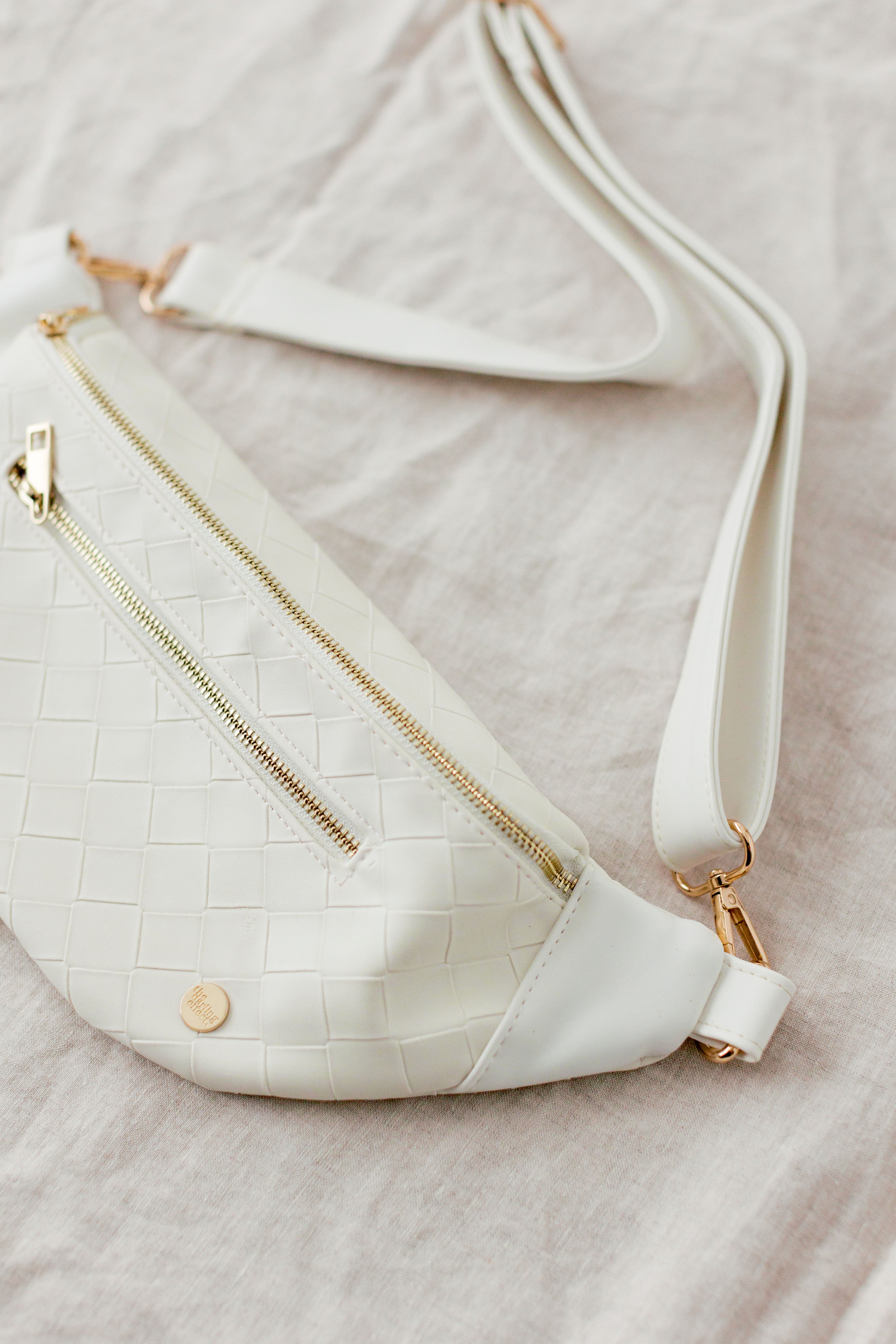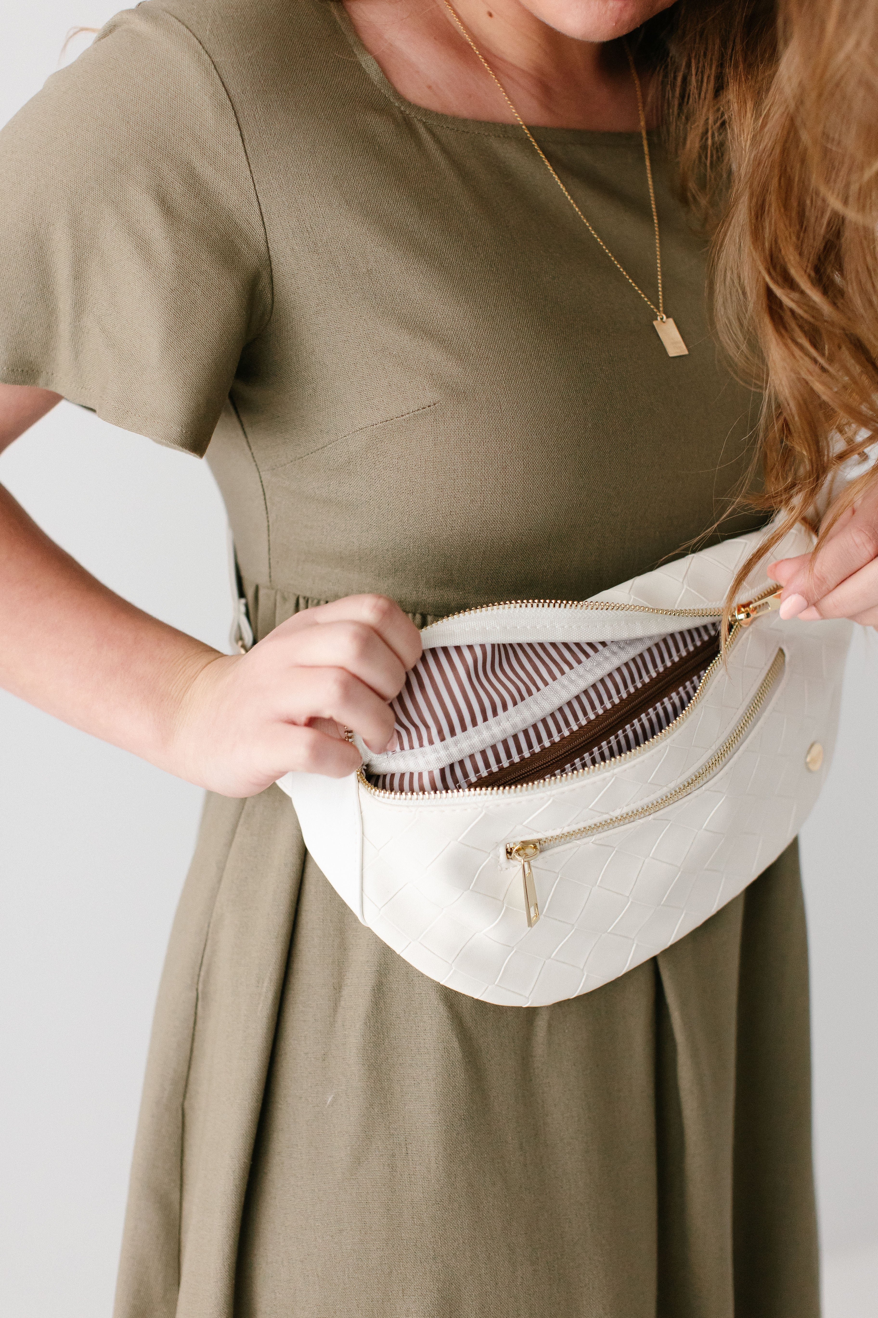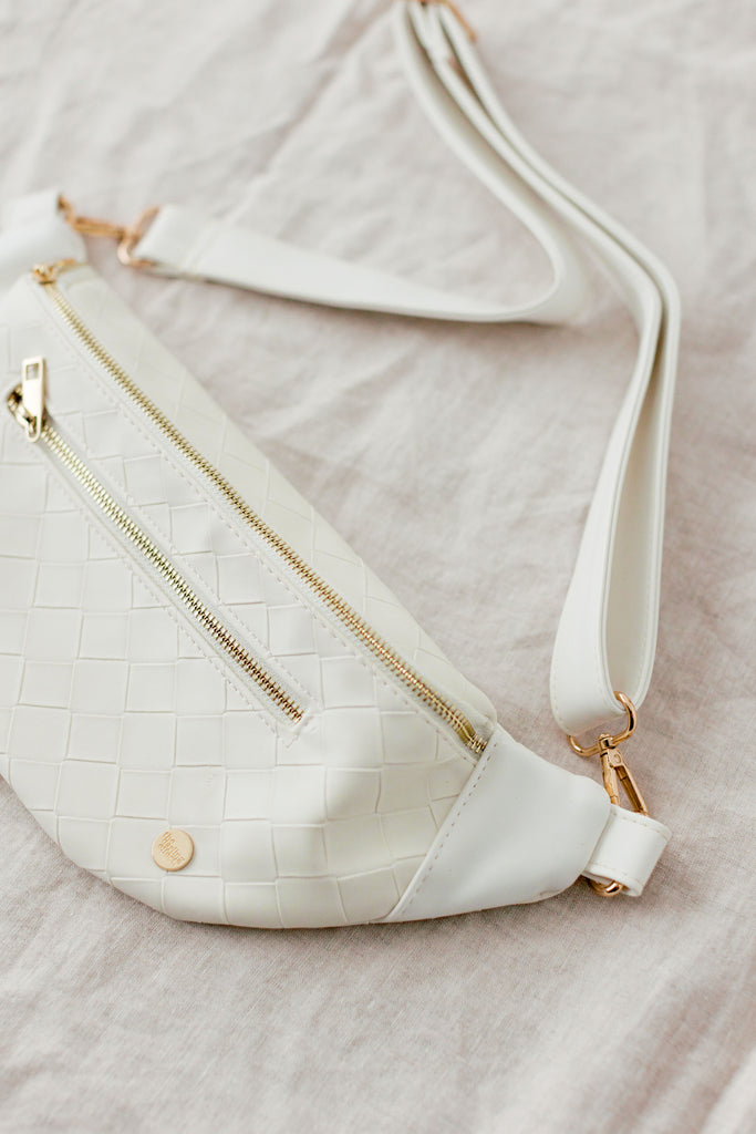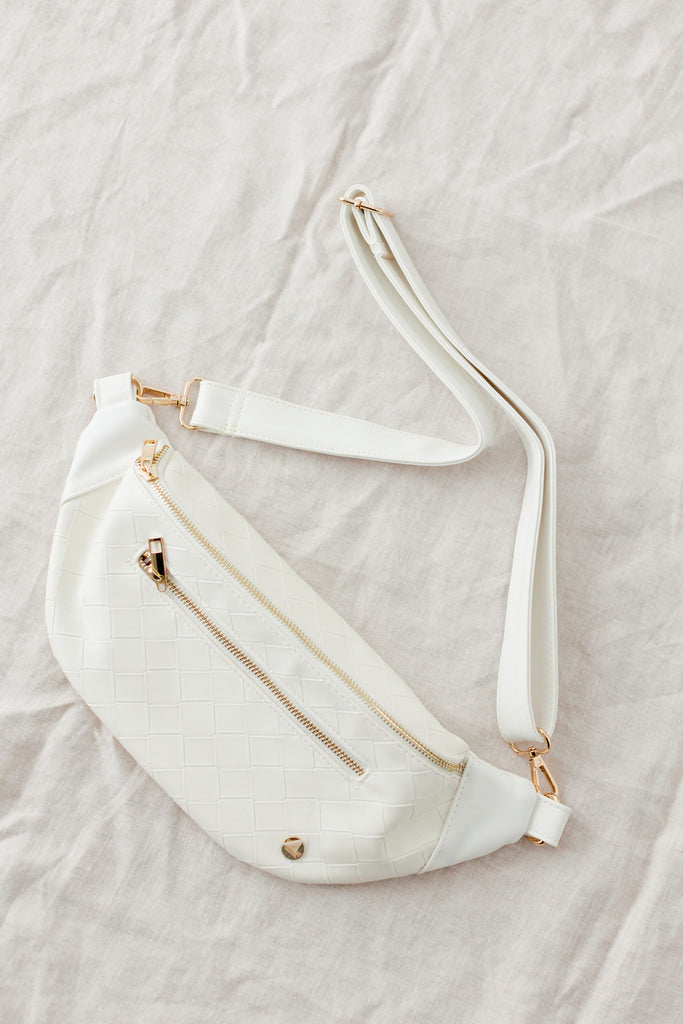 A perfect accessory for on-the-go, the Luxe Crossbody Belt Bag! With adjustable straps, neutral ivory color, gold detailing, and a faux basket-weave pattern, this bag is both easy and practical.