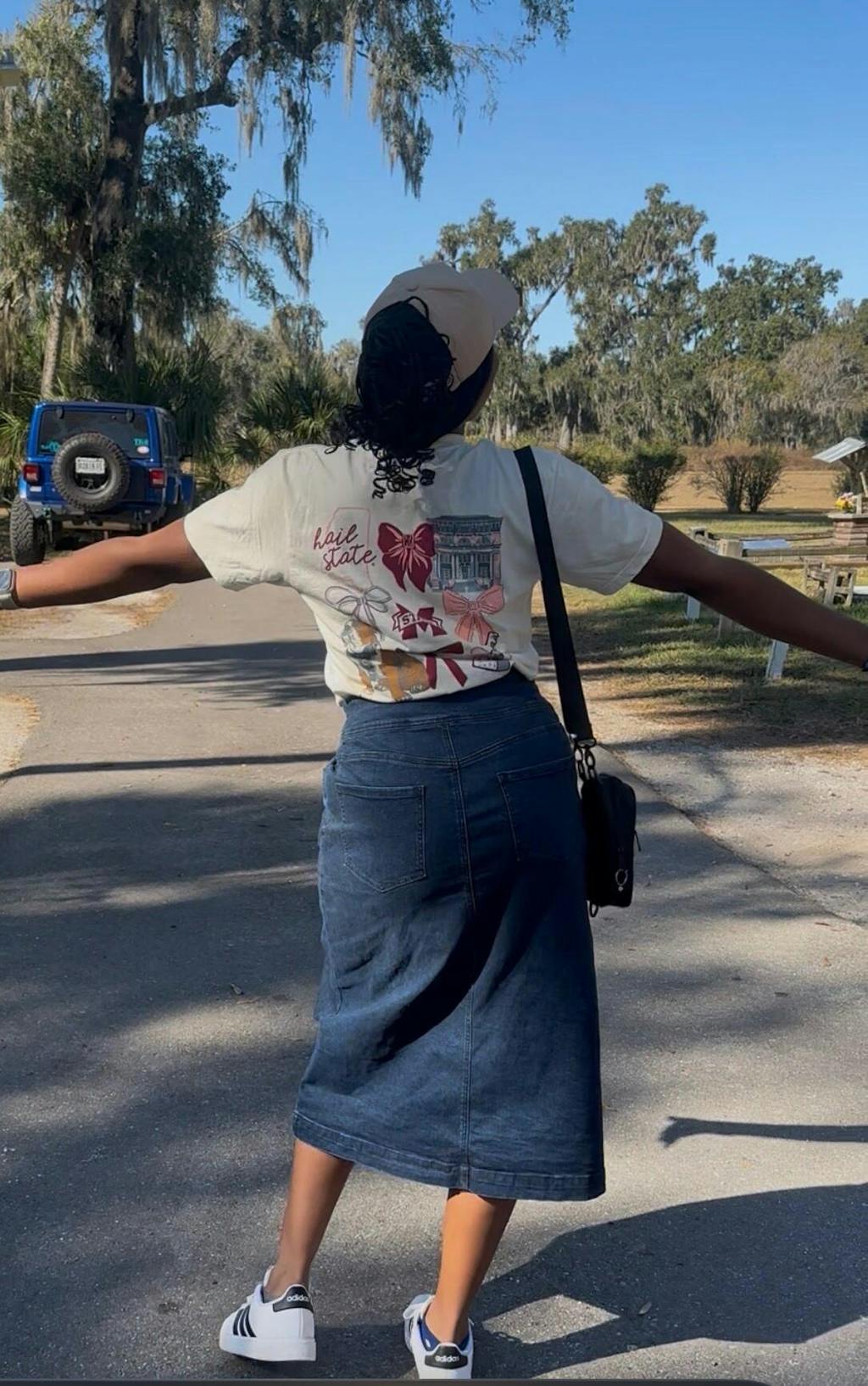 Wearing the 'Shay' Ribbed Bamboo Blend Henley Top and the 'Margaret' Stretch Denim Midi Skirt