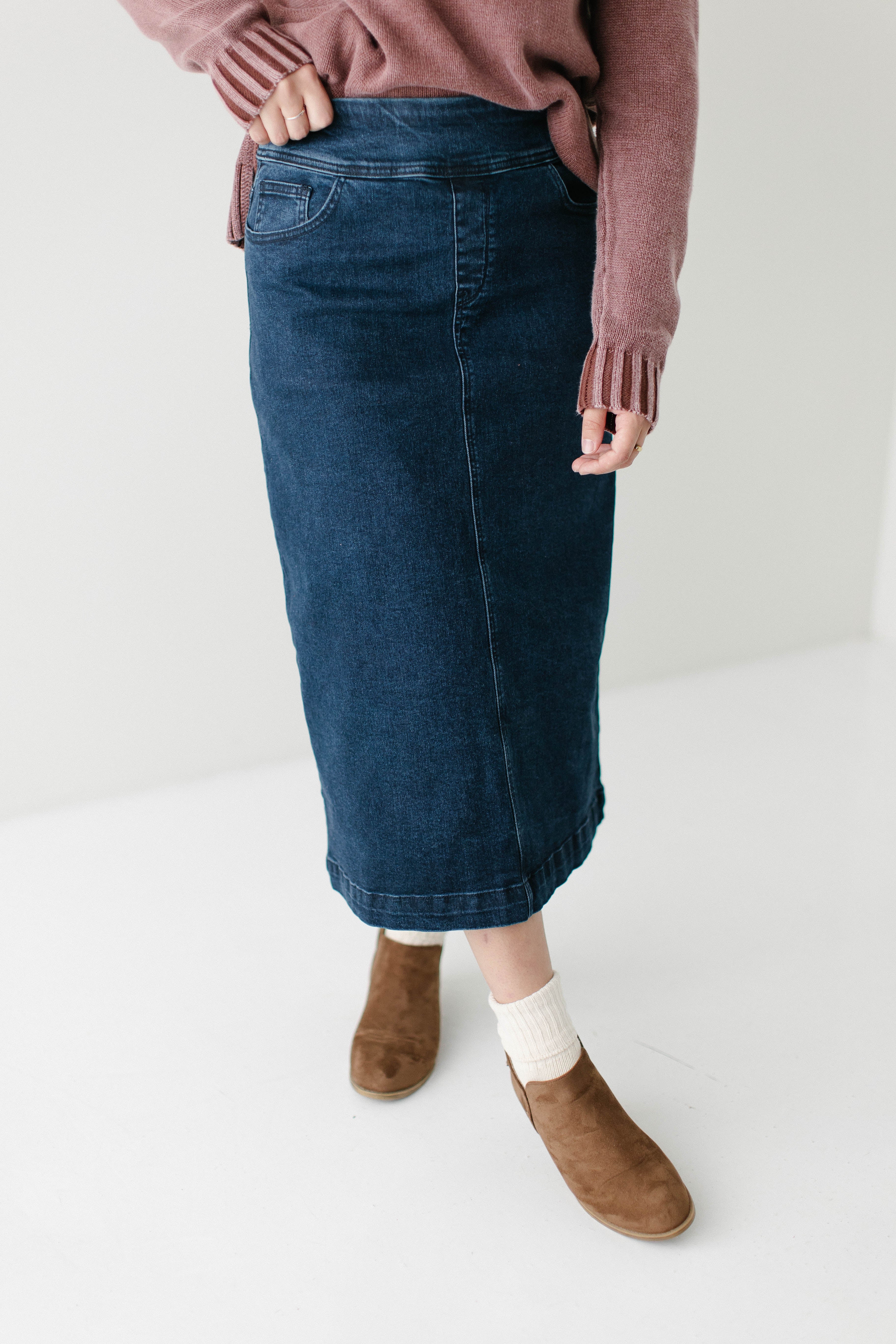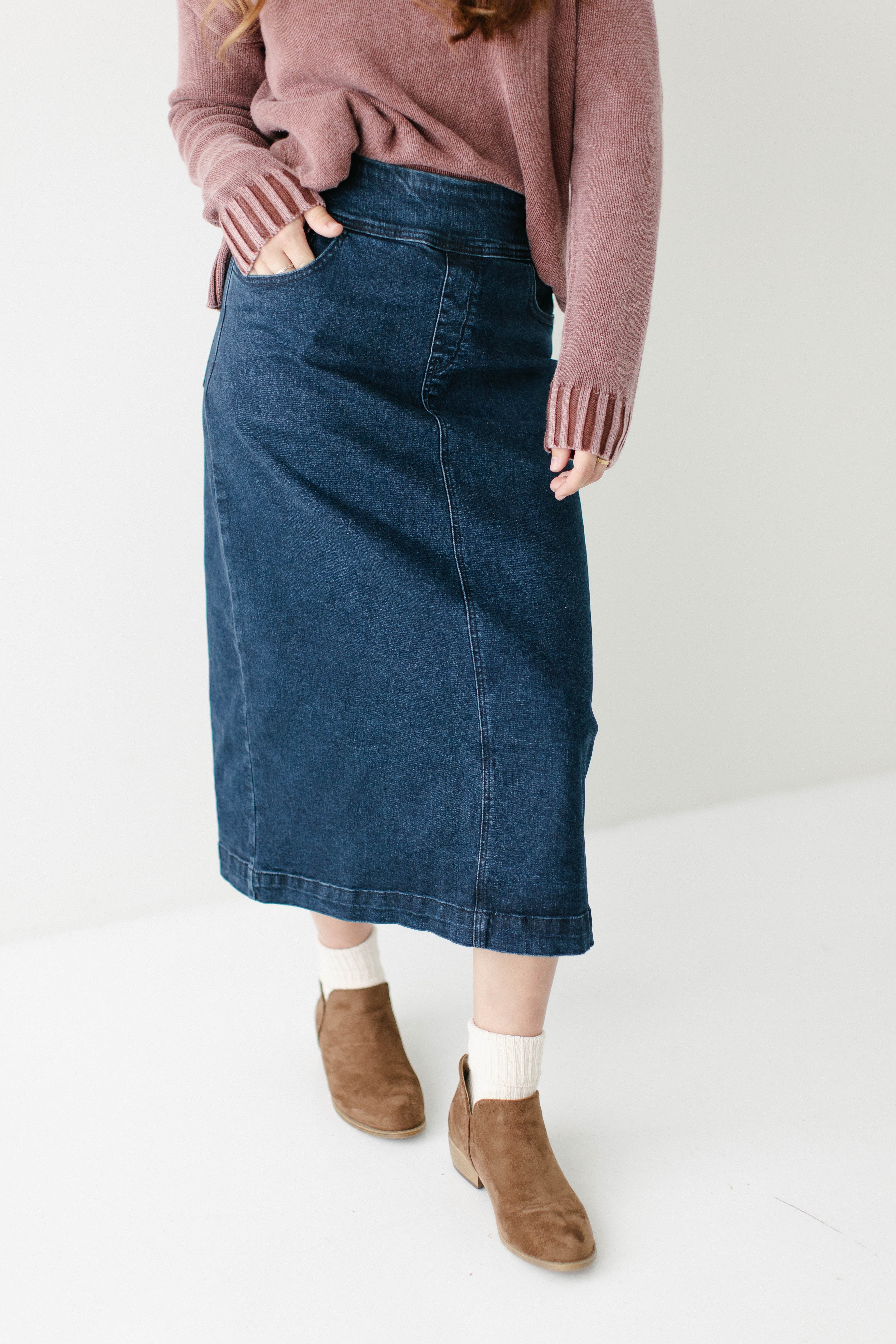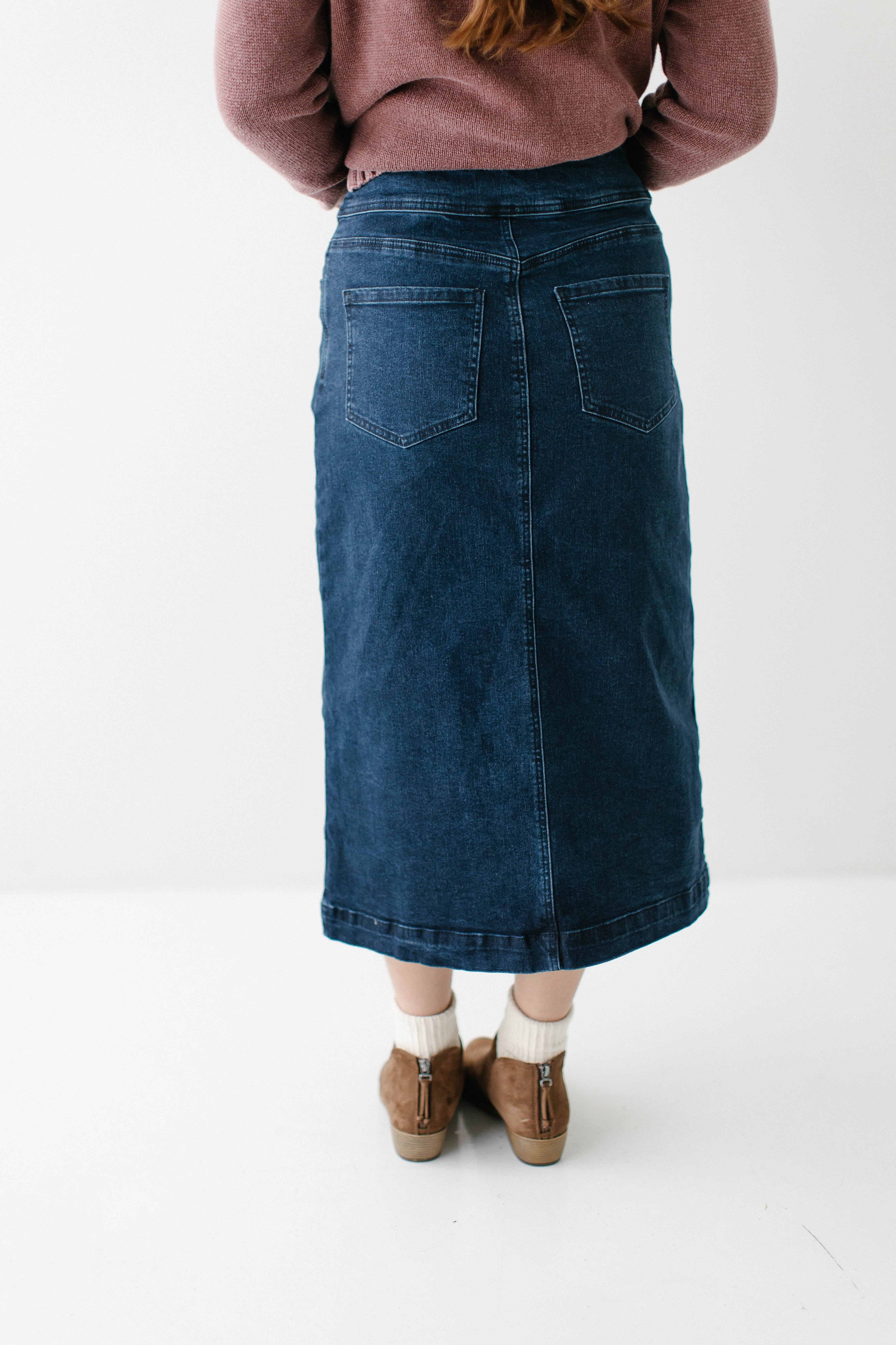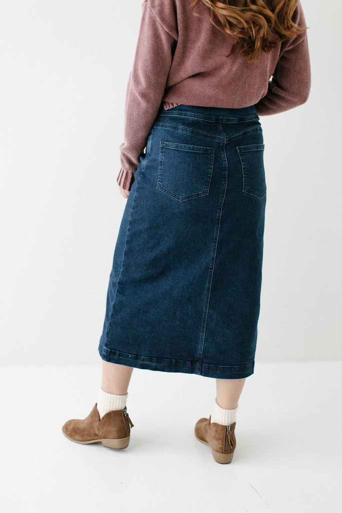 Add a little flair to your outfit with the 'Margaret' denim mid skirt! This midi skirt features stretch denim and a flattering silhouette for a comfortable fit all day. Pair with a fitted top and white sneakers for a fun and casual ensemble for a day out at the park! Exclusively designed by us with you in mind.